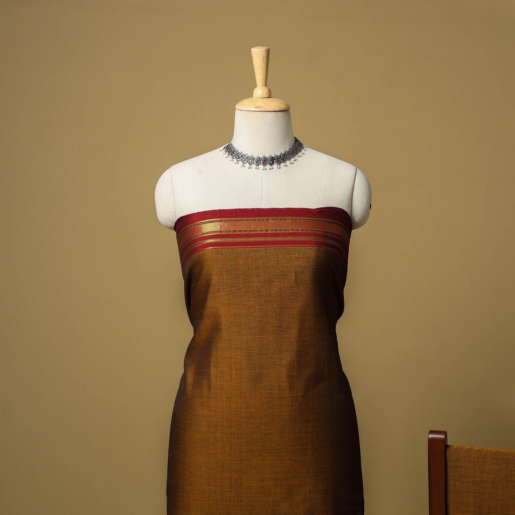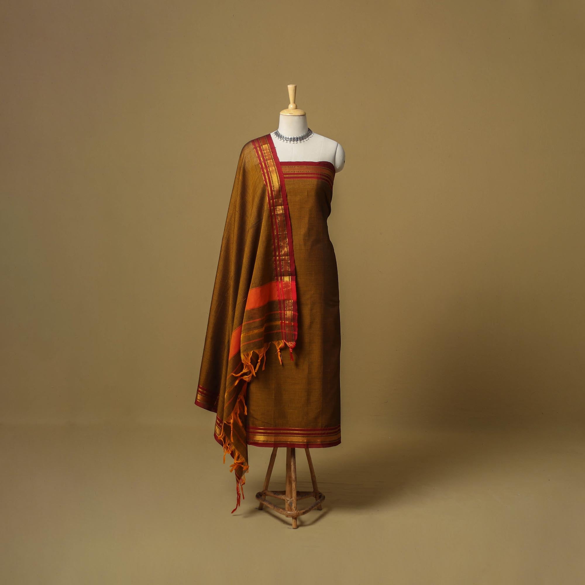 Dharwad cotton 3pc unstitched dress material from Karnataka is woven using a traditional method known for its firm texture and intricate border work. The border features fine motifs and patterns that reflect the region’s style. The set includes a beautifully crafted kurta piece, a matching bottom/salwar piece and a coordinating dupatta. Perfect for custom tailoring and everyday wear.