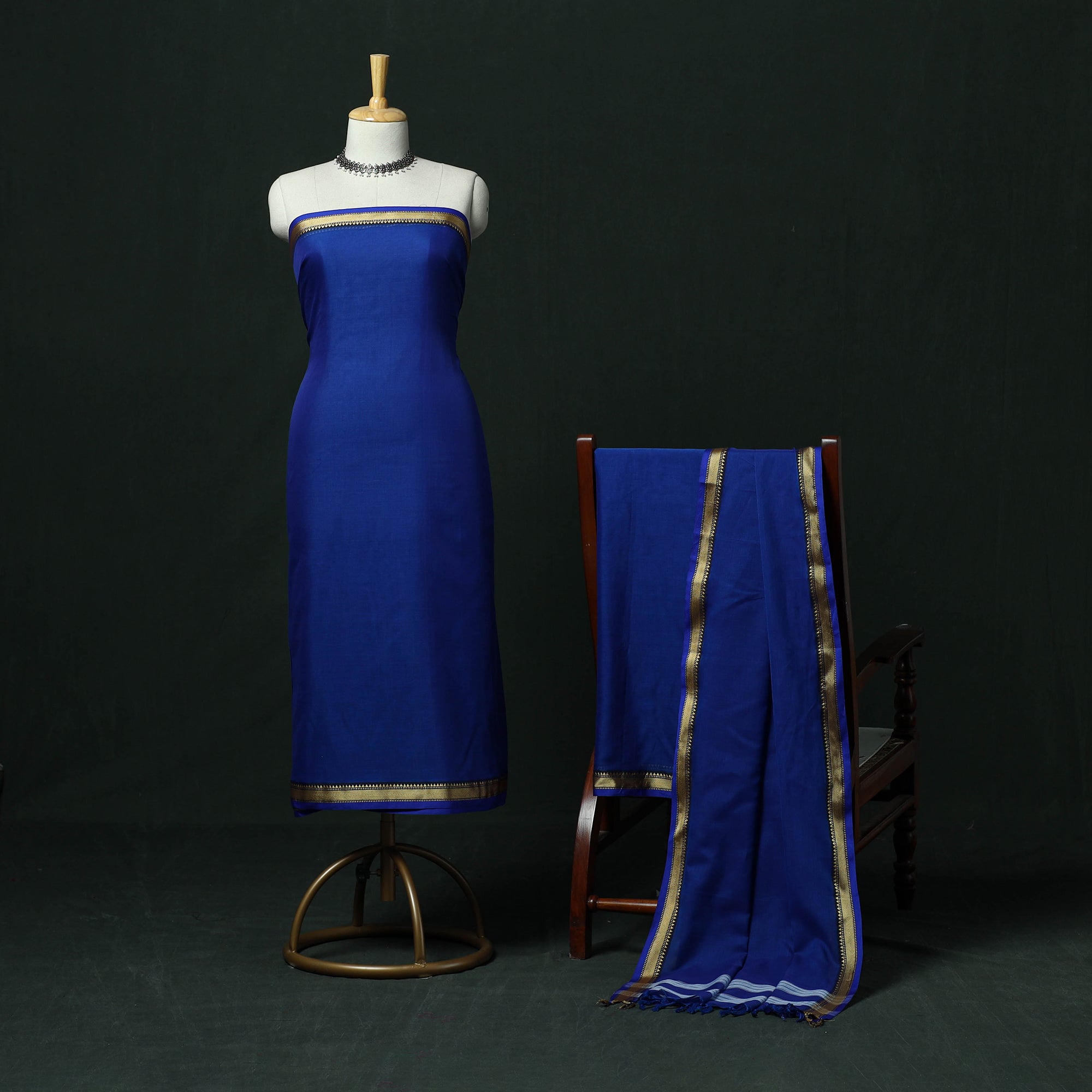 Dharwad cotton 3pc unstitched dress material from Karnataka beautifully represents a weaving tradition that is over 100 years old. It features finely detailed border work that reflects the distinct regional style of Dharwad. The border showcases delicate motifs and intricate patterns, adding an elegant and authentic touch. This set includes kurta fabric, a matching bottom/salwar piece and a coordinated dupatta. Comfortable and versatile, it is perfect for everyday wear.