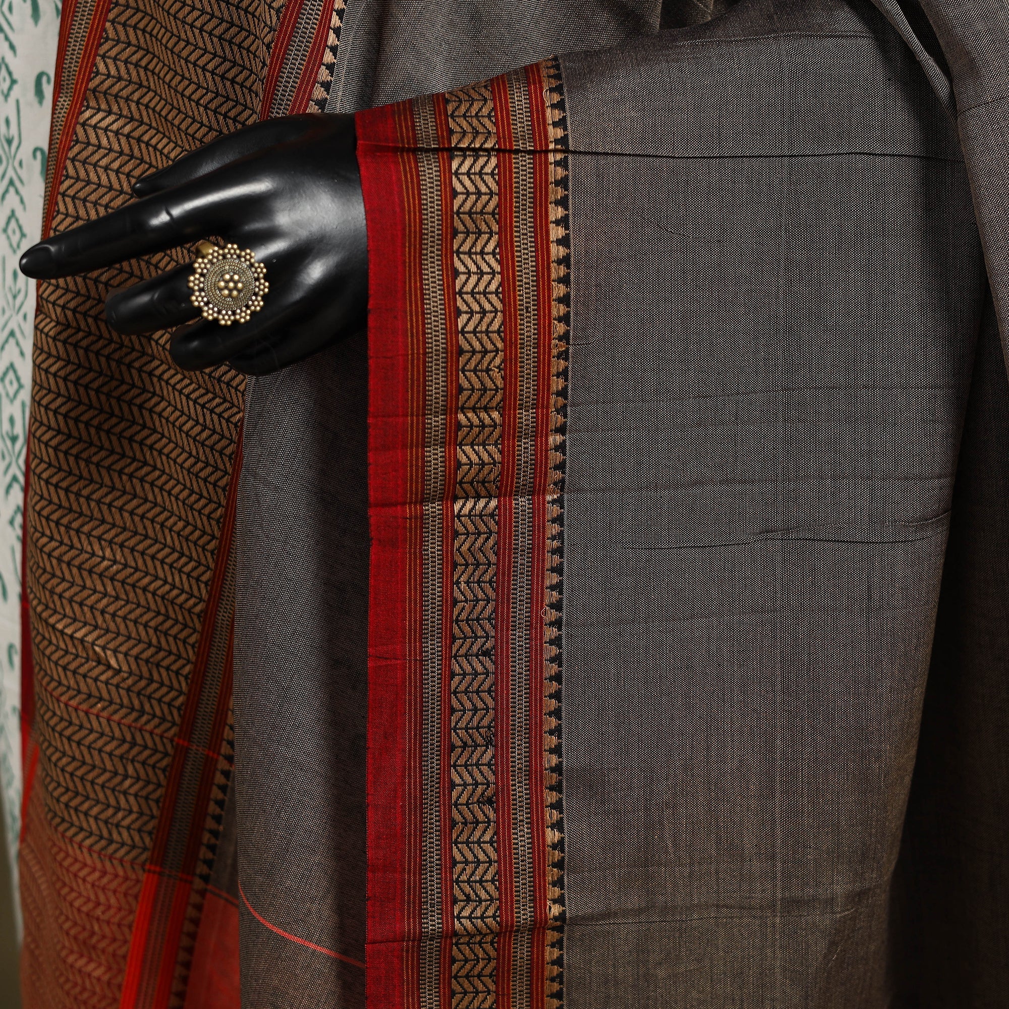 Experience the beauty of this brown dharwad cotton dupatta from Karnataka, adorned with delicate tassels. Featuring a traditional woven zari border, it brings a refined elegance to your wardrobe. Expertly crafted with care, this dupatta offers the perfect blend of comfort and charm. Whether for festive occasions or casual gatherings, it's sure to leave a lasting impression.