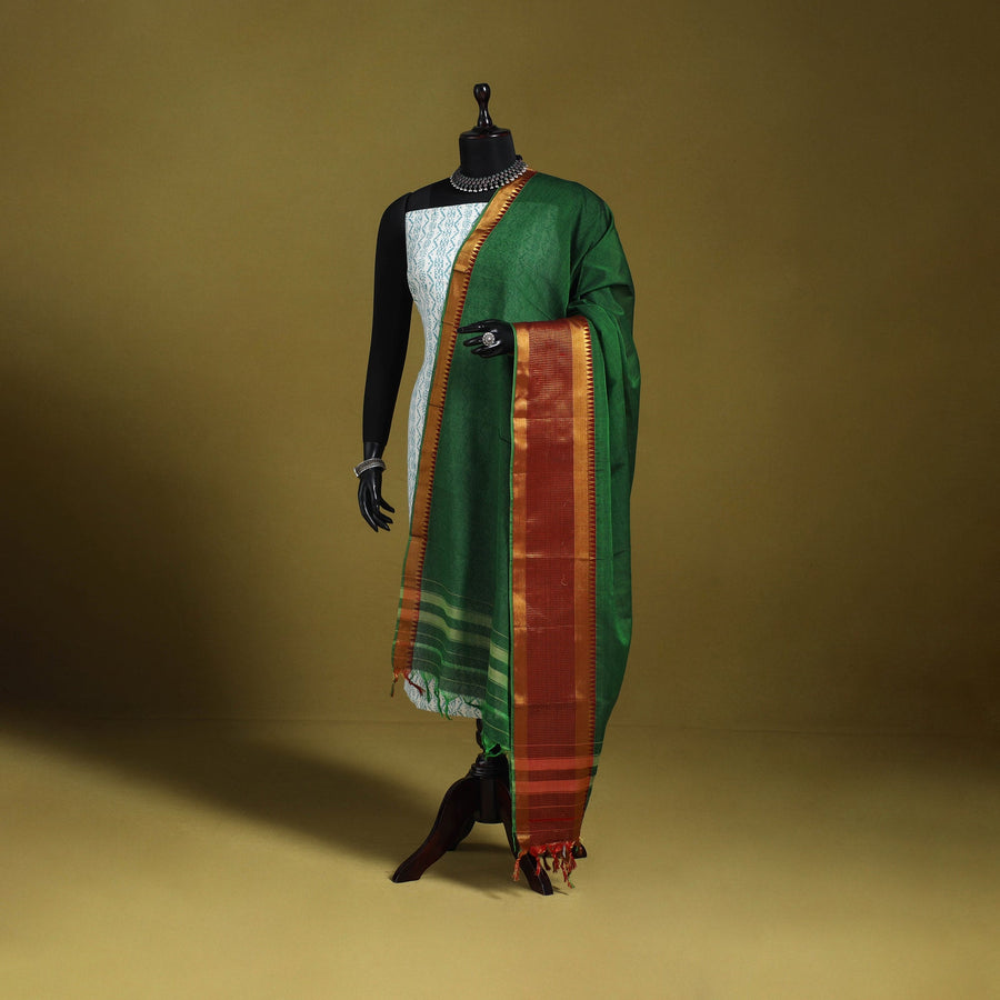 This green dharwad cotton dupatta from Karnataka reflects the rich weaving tradition of Dharwad, known for its fine cotton textiles. Featuring a woven zari border and delicate tassels, it carries the essence of this regional craft. Soft, breathable, and easy to drape, it pairs effortlessly with different outfits, perfect for festive gatherings or casual wear.