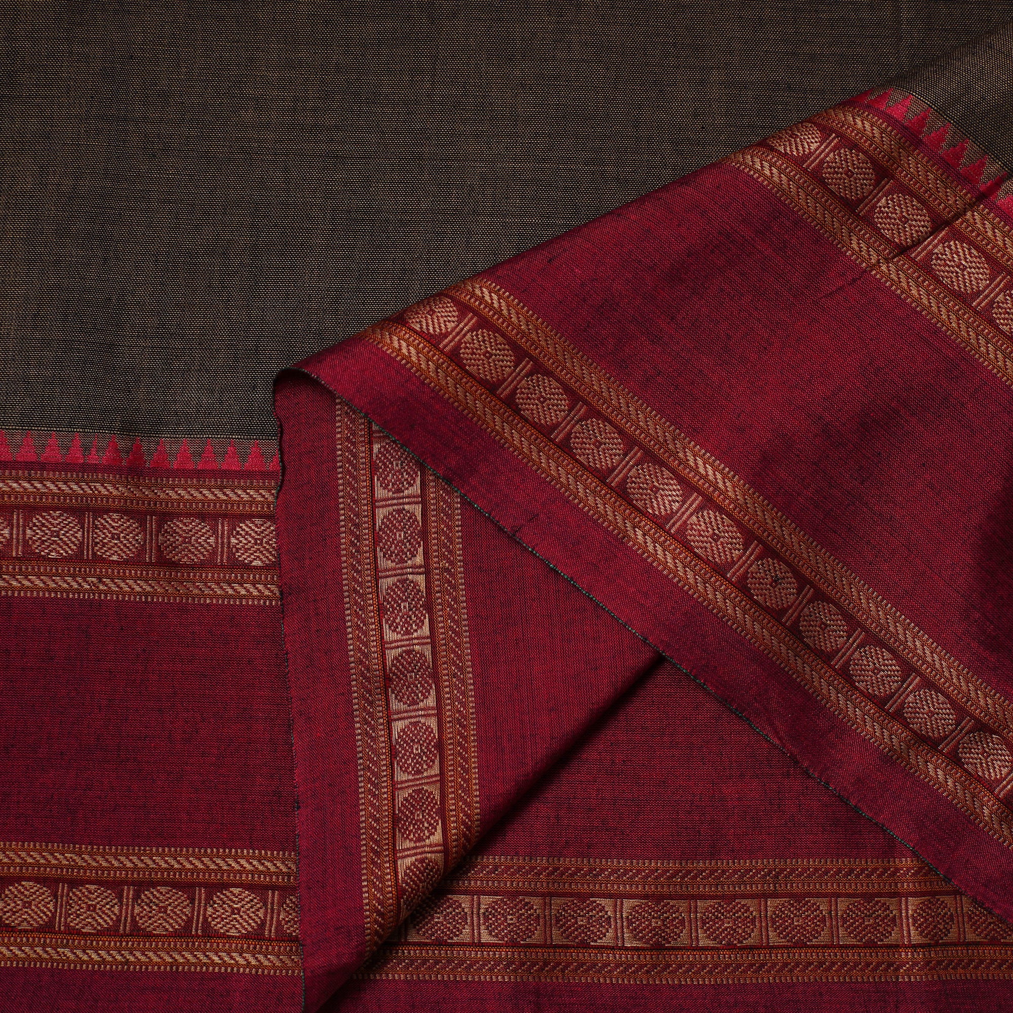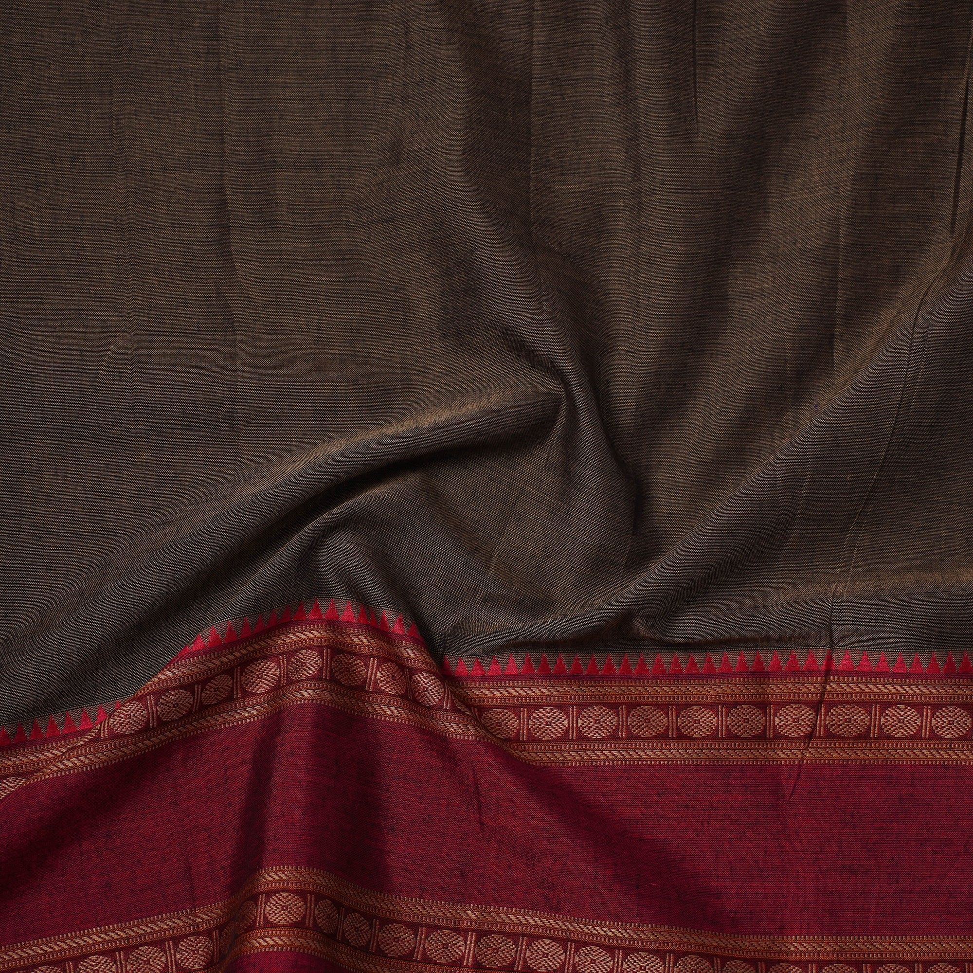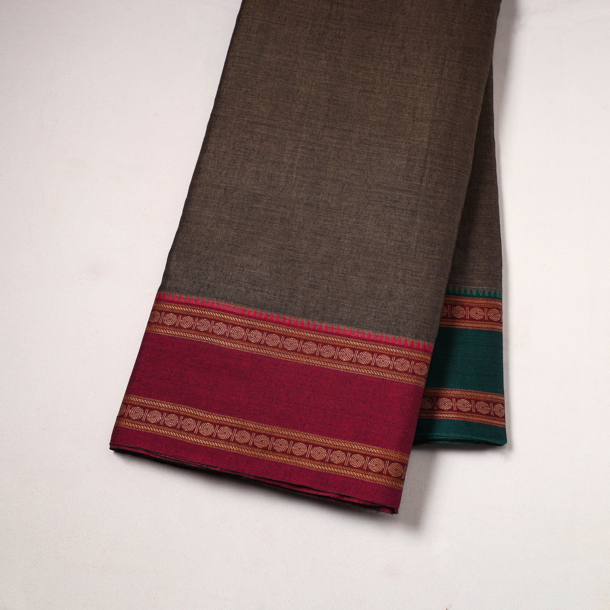This brown dharwad cotton fabric from Karnataka features a woven border inspired by traditional patterns. Made using machine processes, it offers a smooth finish and reliable quality. Ideal for making elegant outfits, home decor accents, or creative craft projects.