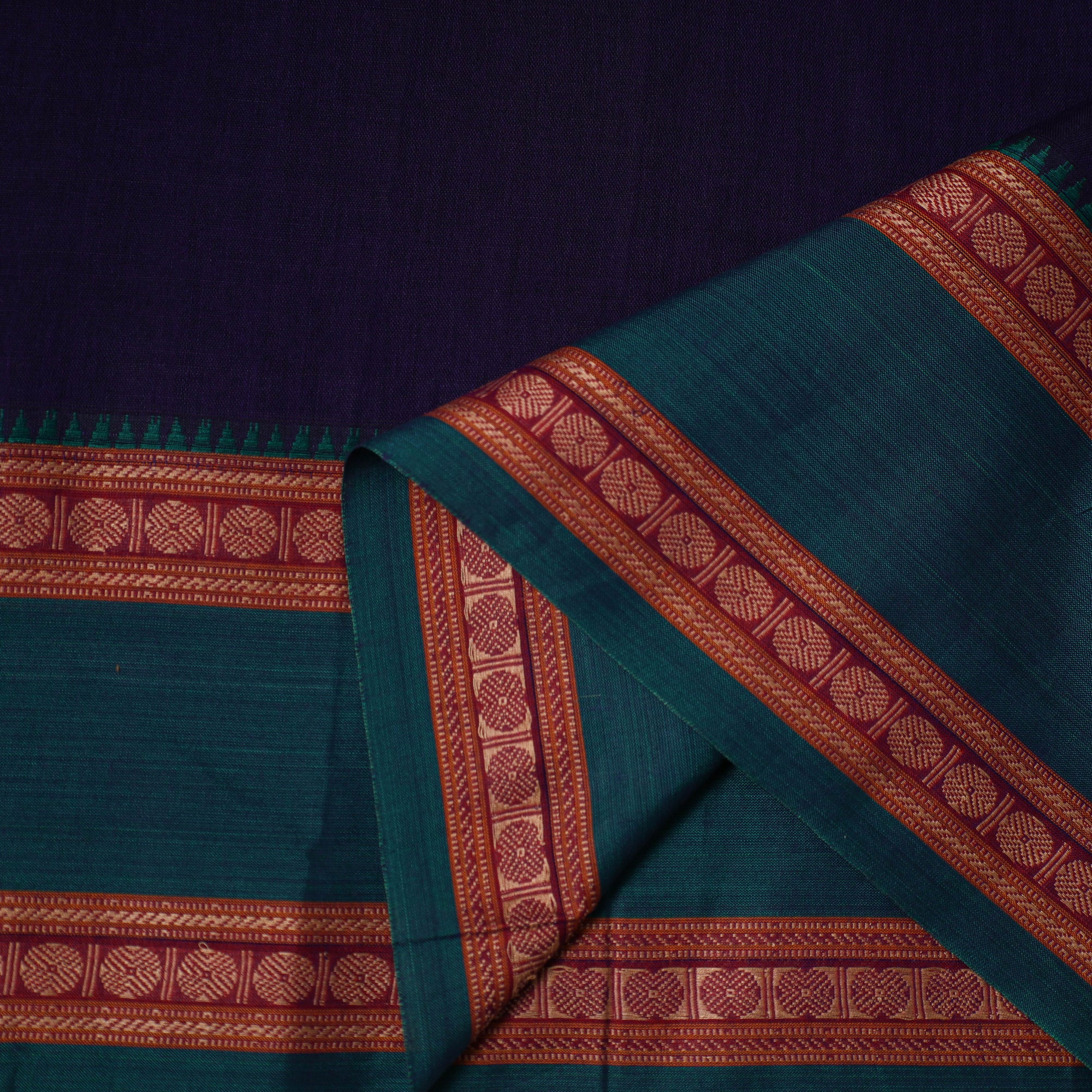 This blue dharwad cotton fabric from Karnataka features a woven border inspired by traditional patterns. Made using machine processes, it offers a smooth finish and reliable quality. Ideal for making elegant outfits, home decor accents, or creative craft projects.