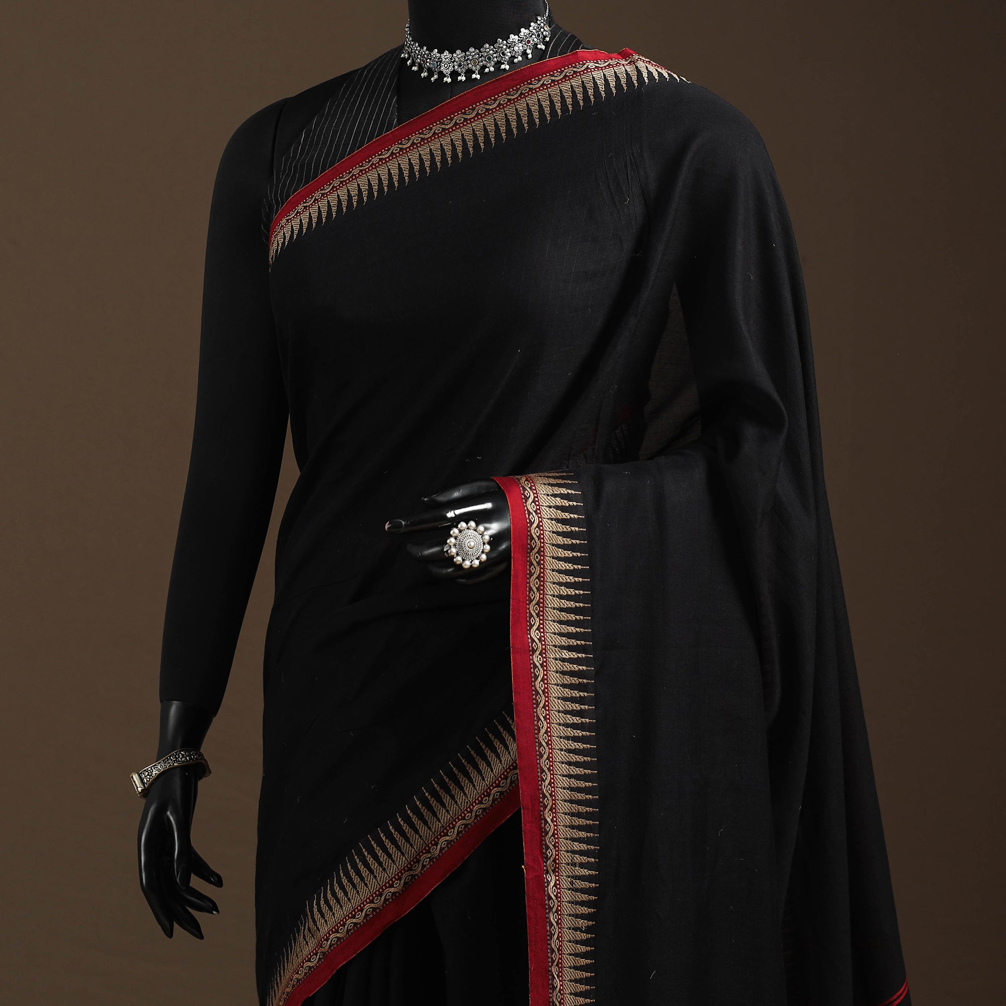 Embrace the elegance of Karnataka with our black dharwad cotton saree. It features a beautifully woven border, carefully made by the skilled weavers of Dharwad. The border has fine motifs and patterns that reflect the weaving style of the region. These simple yet graceful details make the saree perfect for both formal occasions and festive celebrations.