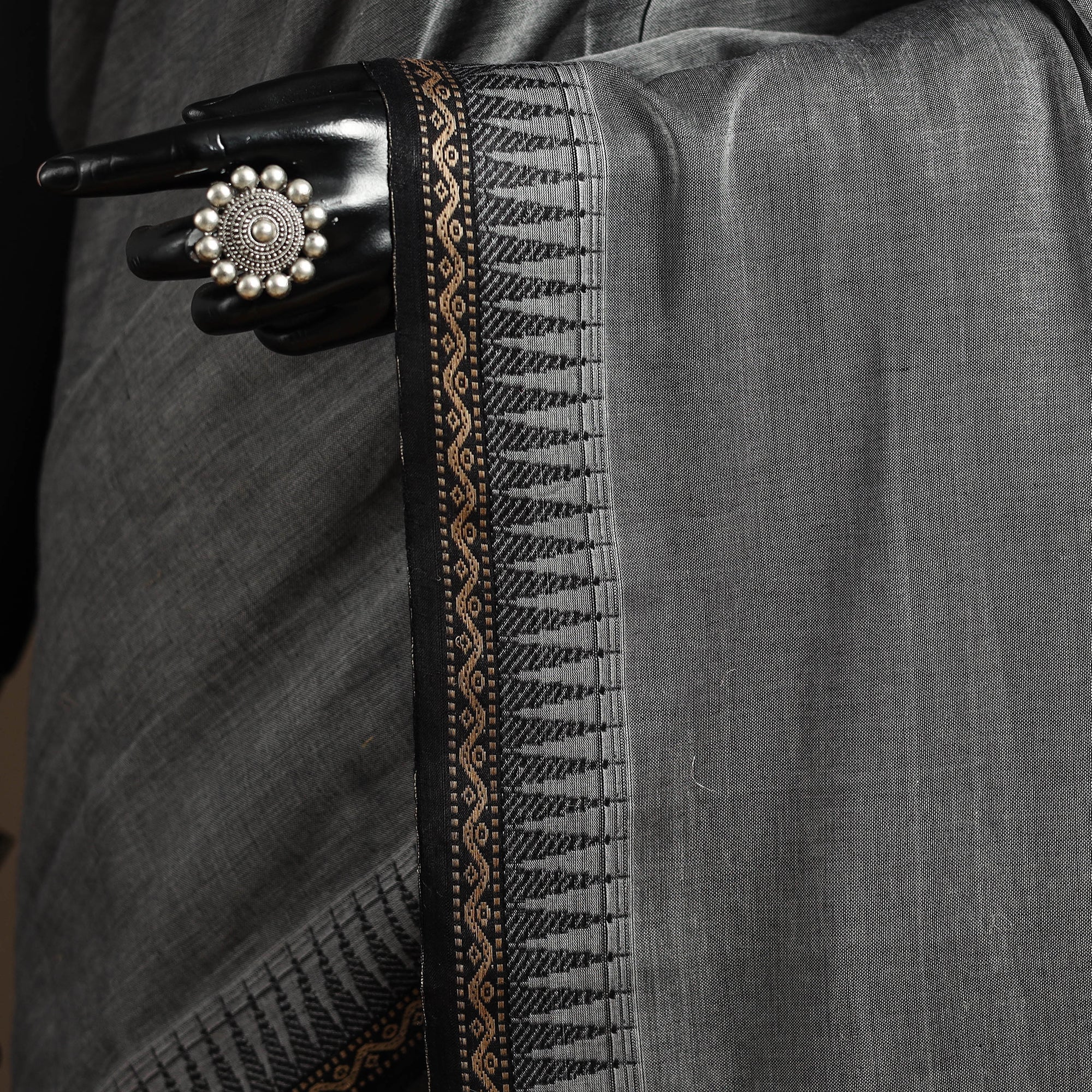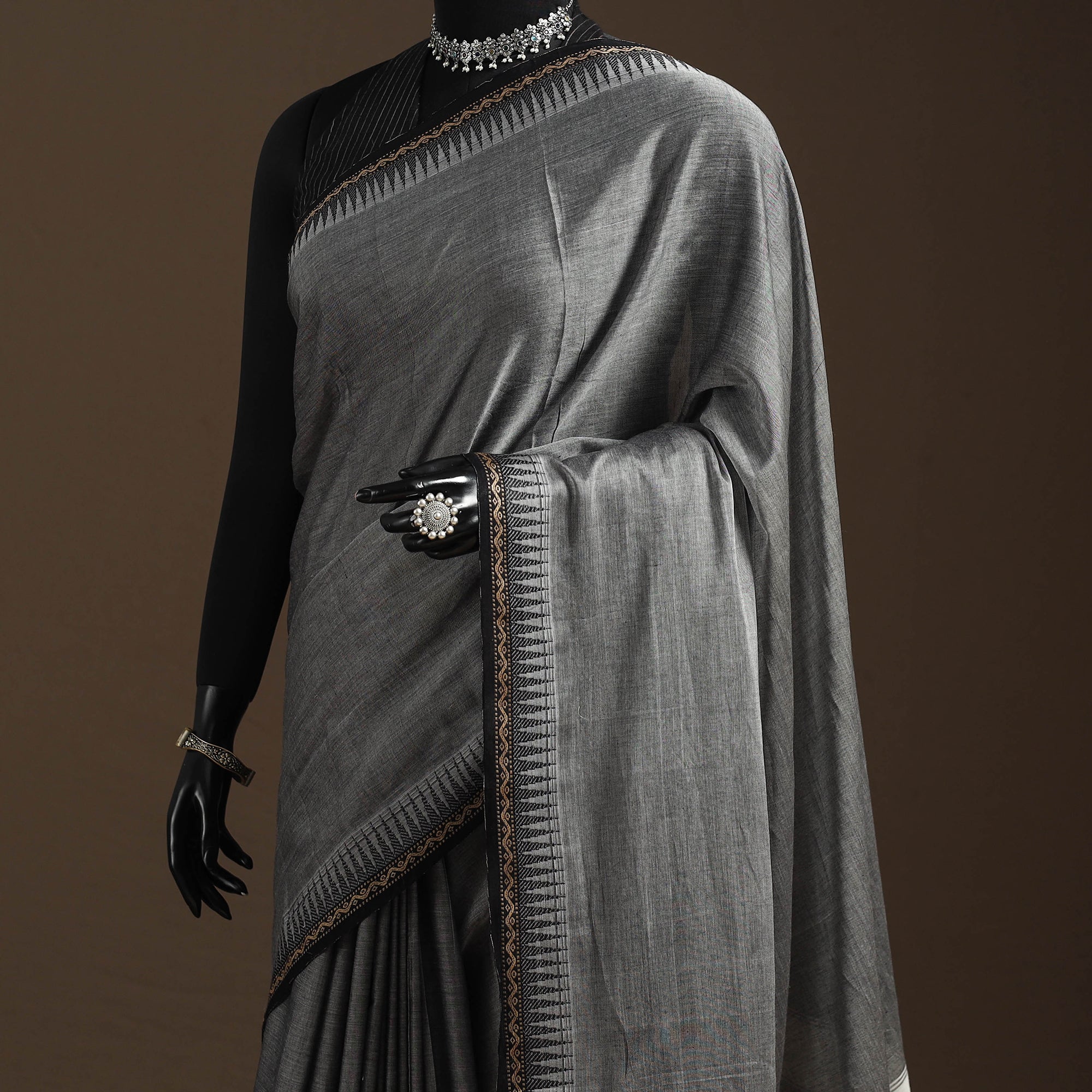 Embrace the elegance of Karnataka with our grey dharwad cotton saree. It features a beautifully woven border, carefully made by the skilled weavers of Dharwad. The border has fine motifs and patterns that reflect the weaving style of the region. These simple yet graceful details make the saree perfect for both formal occasions and festive celebrations.