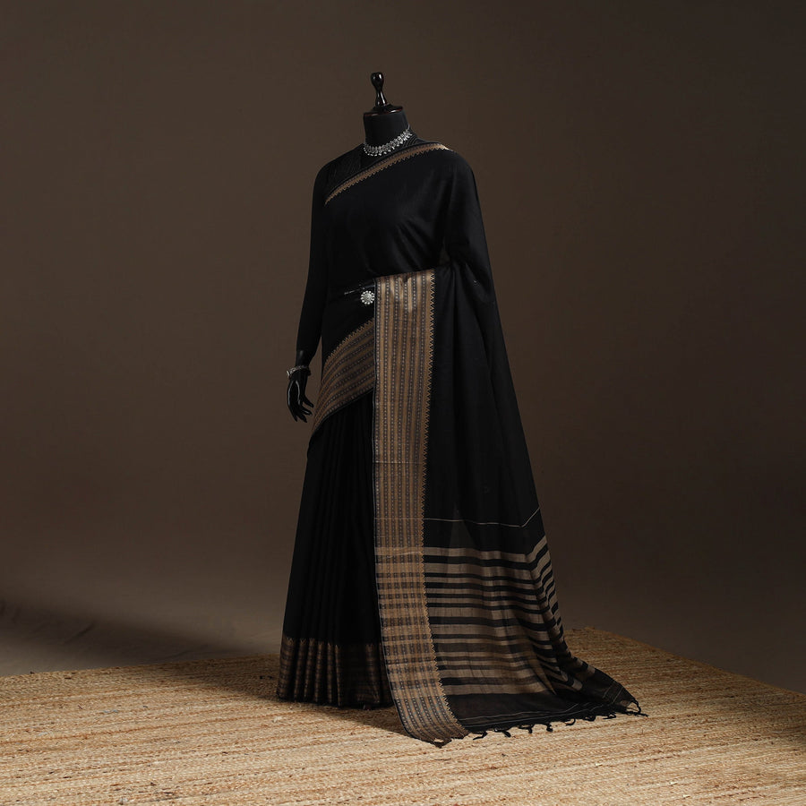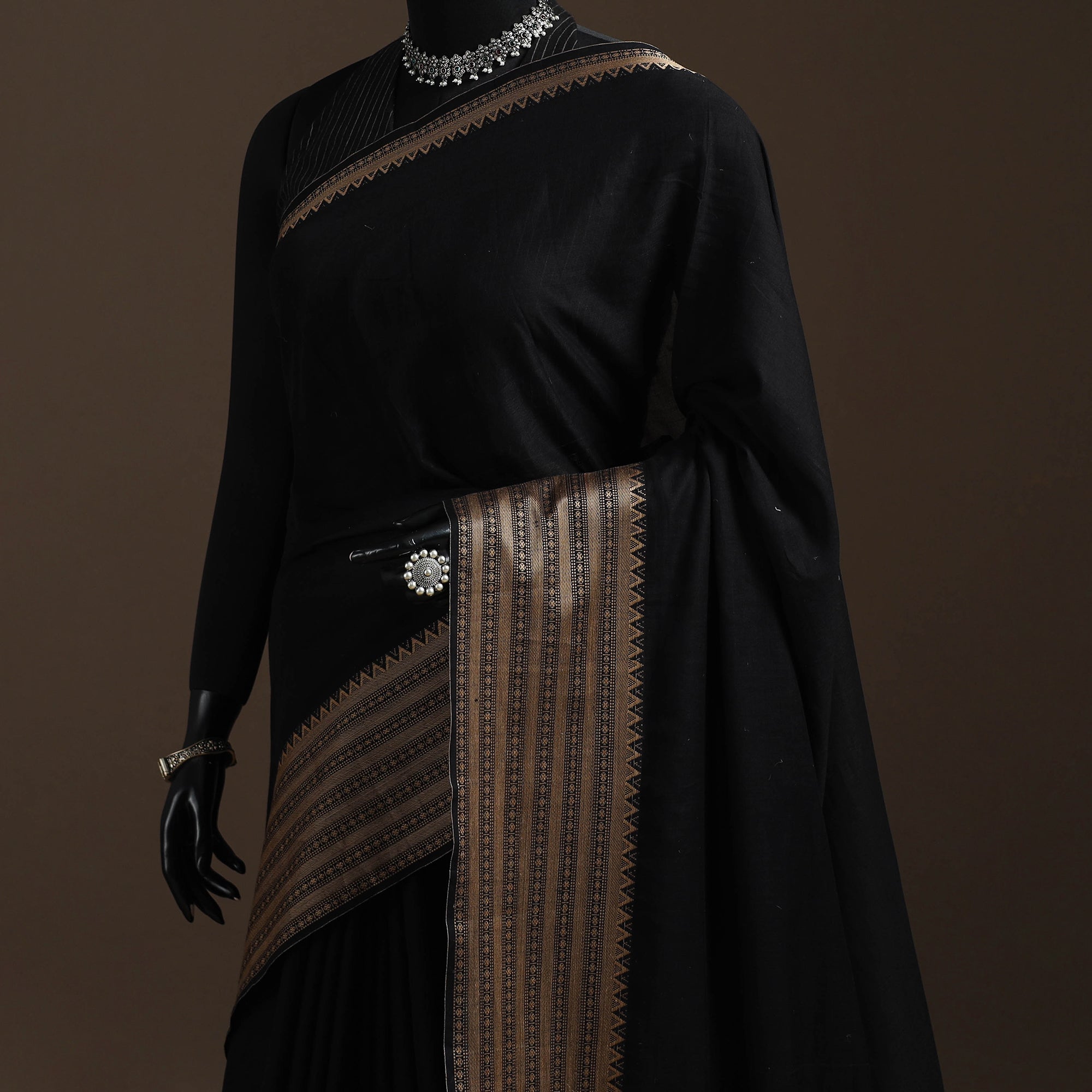 Black dharwad cotton saree from Karnataka is woven using a traditional method known for its firm texture and intricate border work. The border features fine motifs and patterns that reflect the region’s style. These simple yet graceful details make the saree perfect for both formal occasions and festive celebrations.