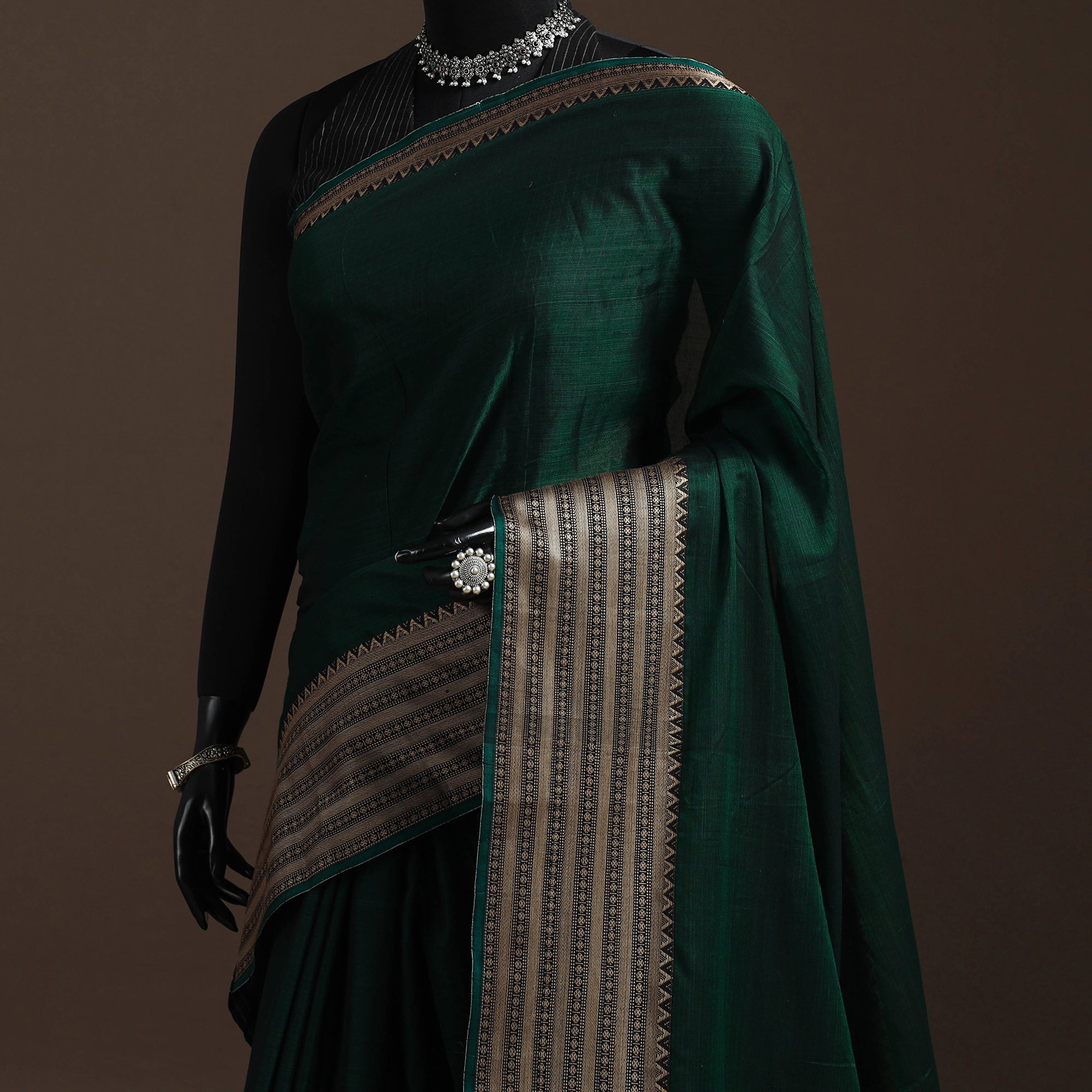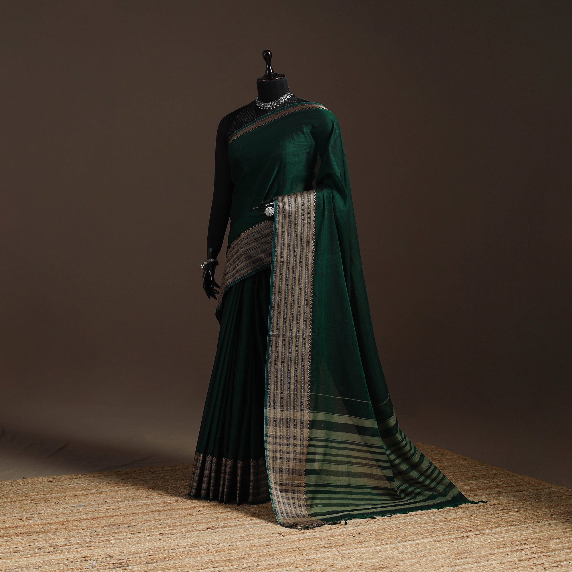 Green dharwad cotton saree from Karnataka is woven using a traditional method known for its firm texture and intricate border work. The border features fine motifs and patterns that reflect the region’s style. These simple yet graceful details make the saree perfect for both formal occasions and festive celebrations.