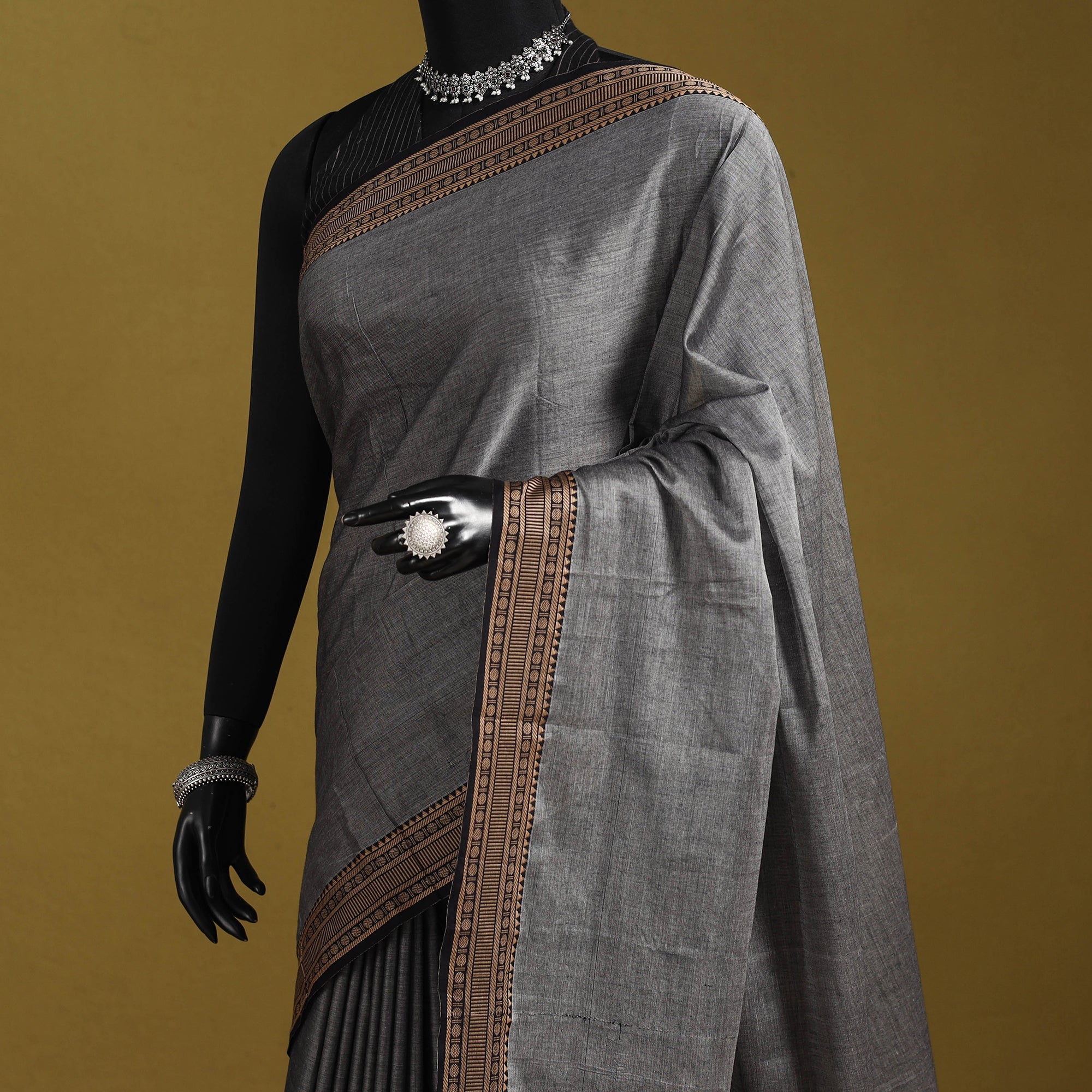 Embrace the traditional elegance of Karnataka with our grey dharwad cotton saree. This saree features a captivating woven border, meticulously crafted by the skilled weavers of Dharwad. The border showcases intricate motifs and patterns that reflect the rich cultural heritage of Karnataka. These exquisite details bring a sense of grace and sophistication, making the saree ideal for both formal occasions and festive celebrations.