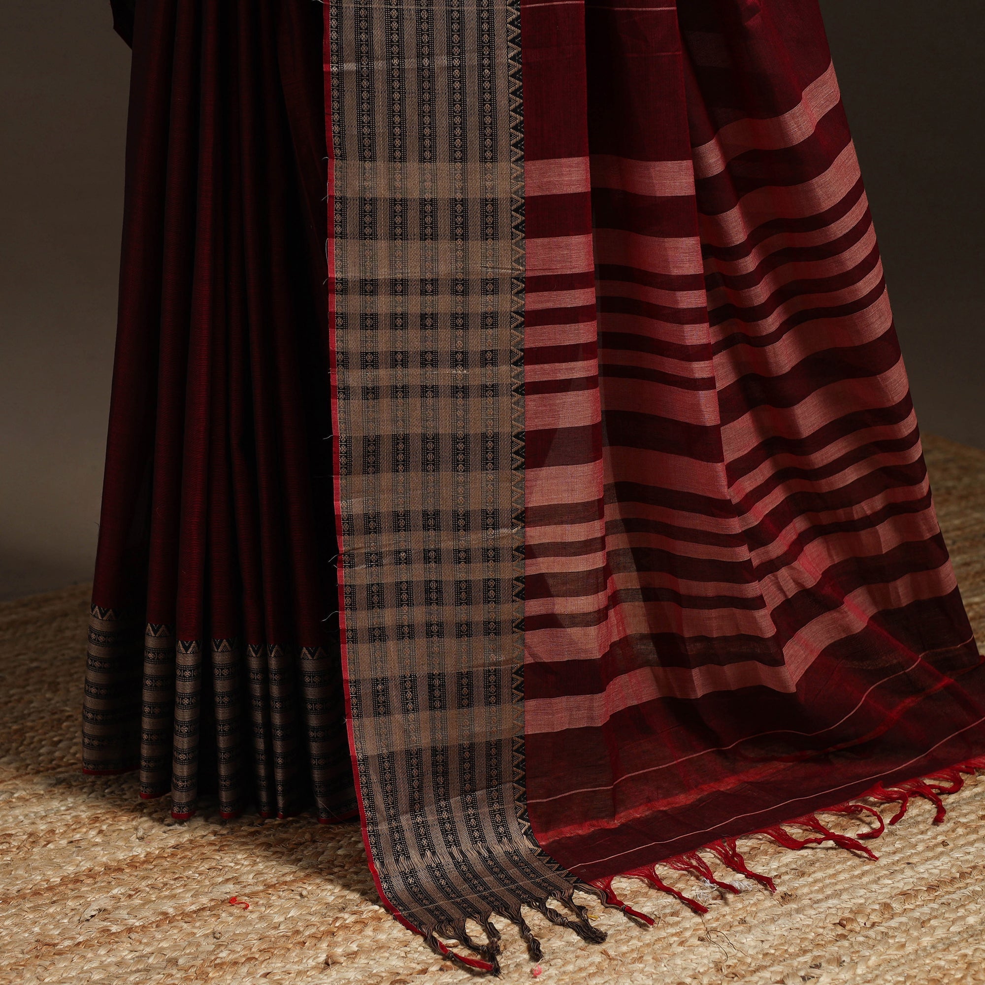 Maroon dharwad cotton saree from Karnataka is woven using a traditional method known for its firm texture and intricate border work. The border features fine motifs and patterns that reflect the region’s style. These simple yet graceful details make the saree perfect for both formal occasions and festive celebrations.
