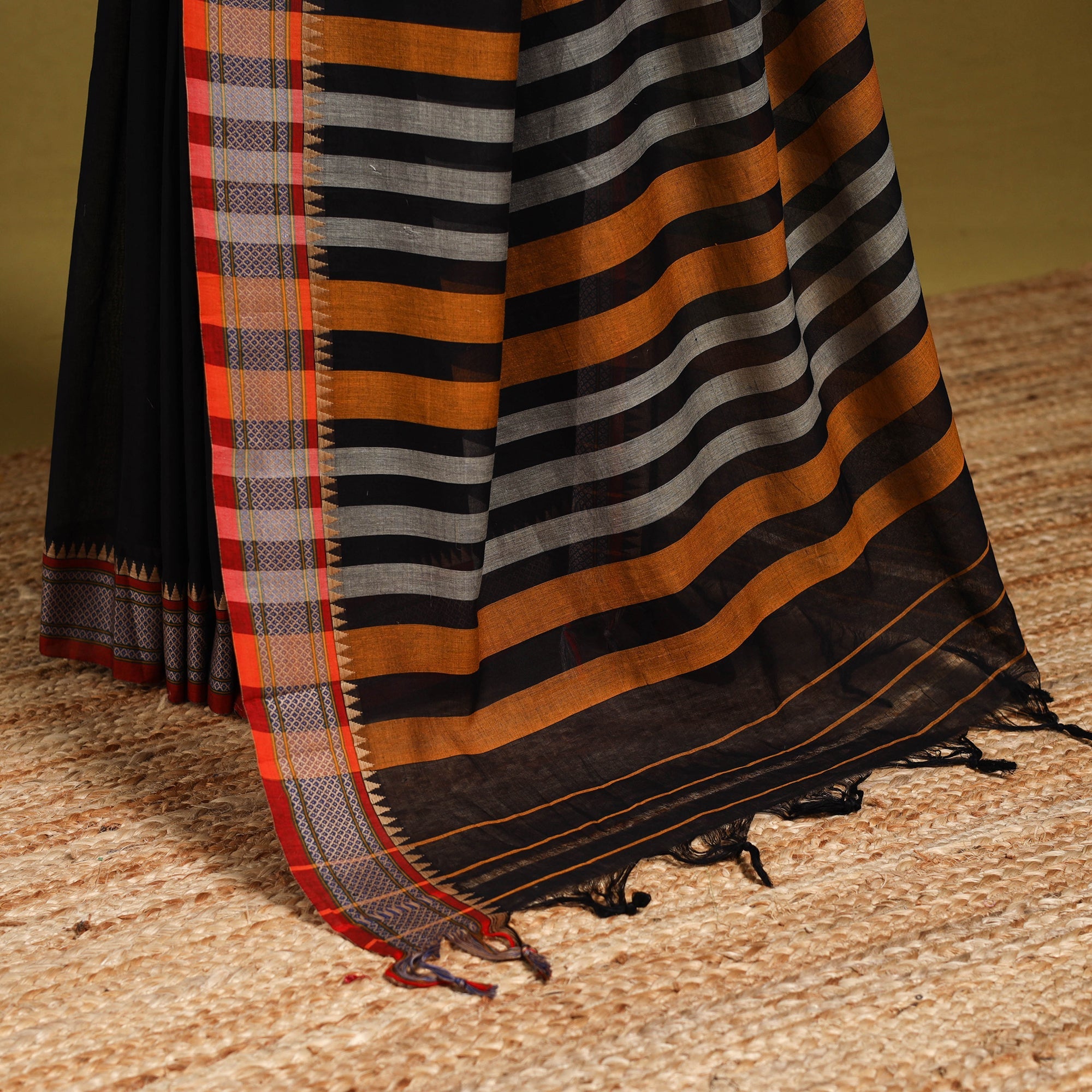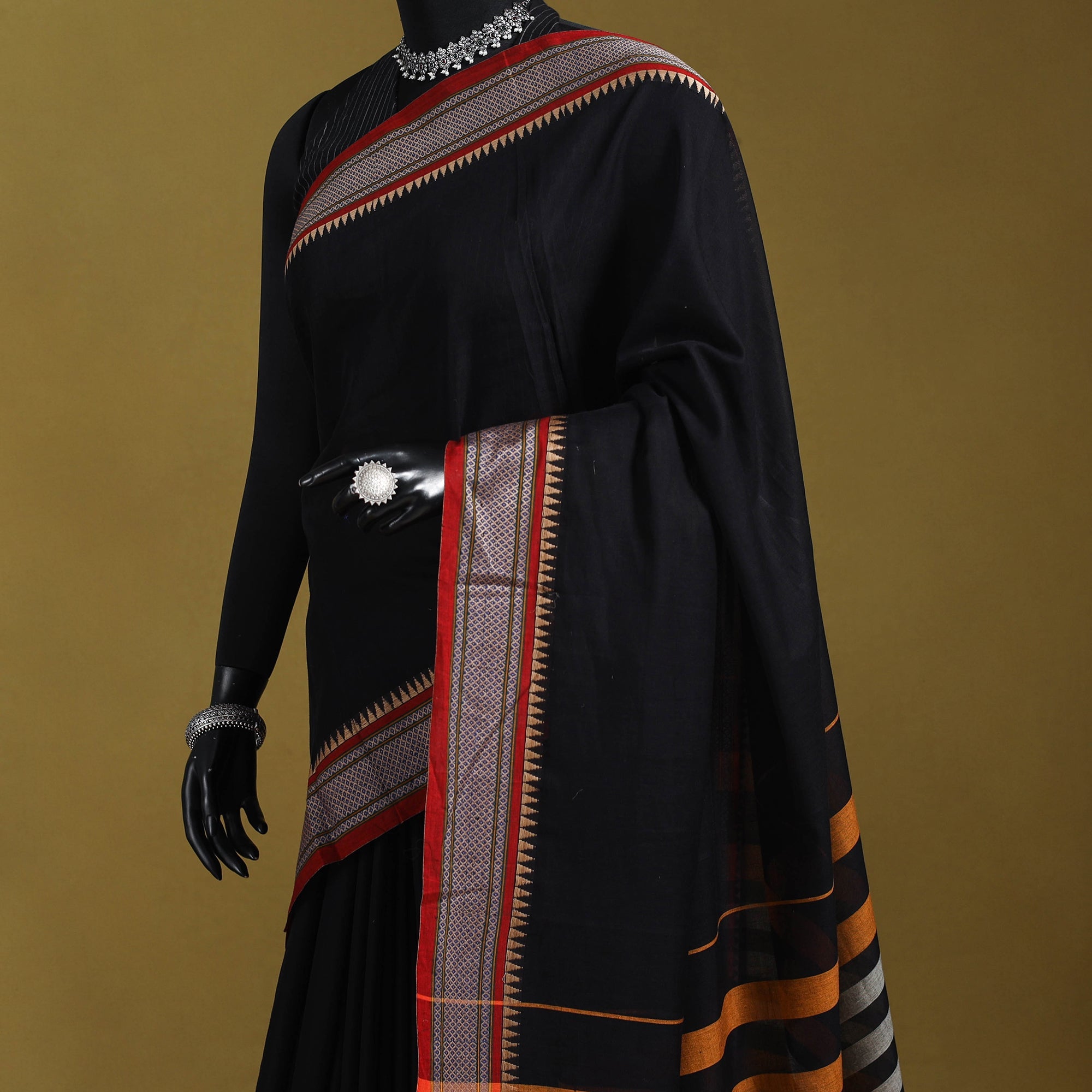 | Material | Embrace the traditional elegance of Karnataka with our black dharwad cotton saree. This saree features a captivating woven border, meticulously crafted by the skilled weavers of Dharwad. The border showcases intricate motifs and patterns that reflect the rich cultural heritage of Karnataka. These exquisite details bring a sense of grace and sophistication, making the saree ideal for both formal occasions and festive celebrations. Note : This piece carries tiny knots, thread pulls, or uneven lines — not flaws, but fingerprints. Every irregularity is a whisper from the hands that made it. It’s what happens when tradition weaves through time, not machines. If you’re looking for perfection, this isn’t it. But if you’re looking for soul — you’ve found it. |