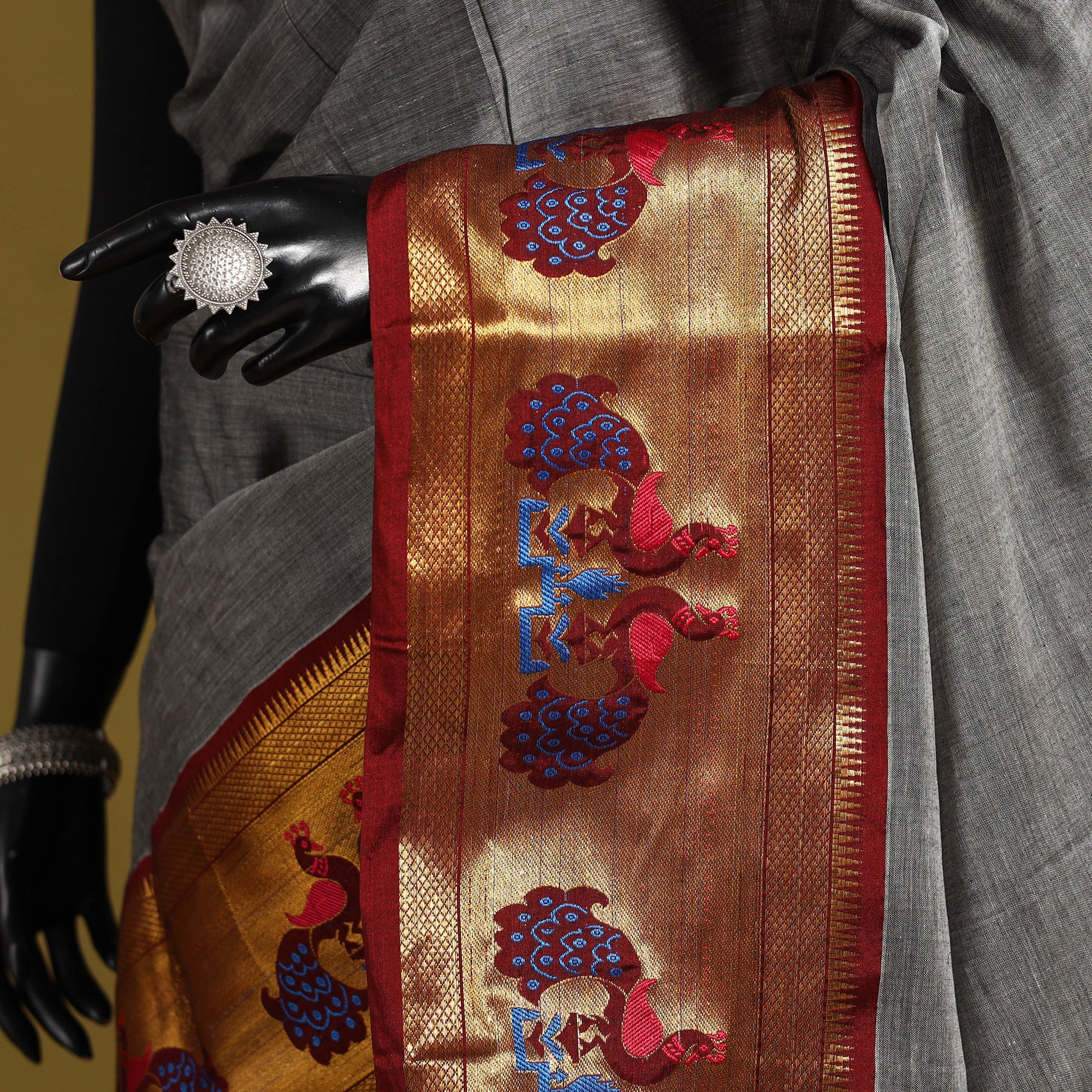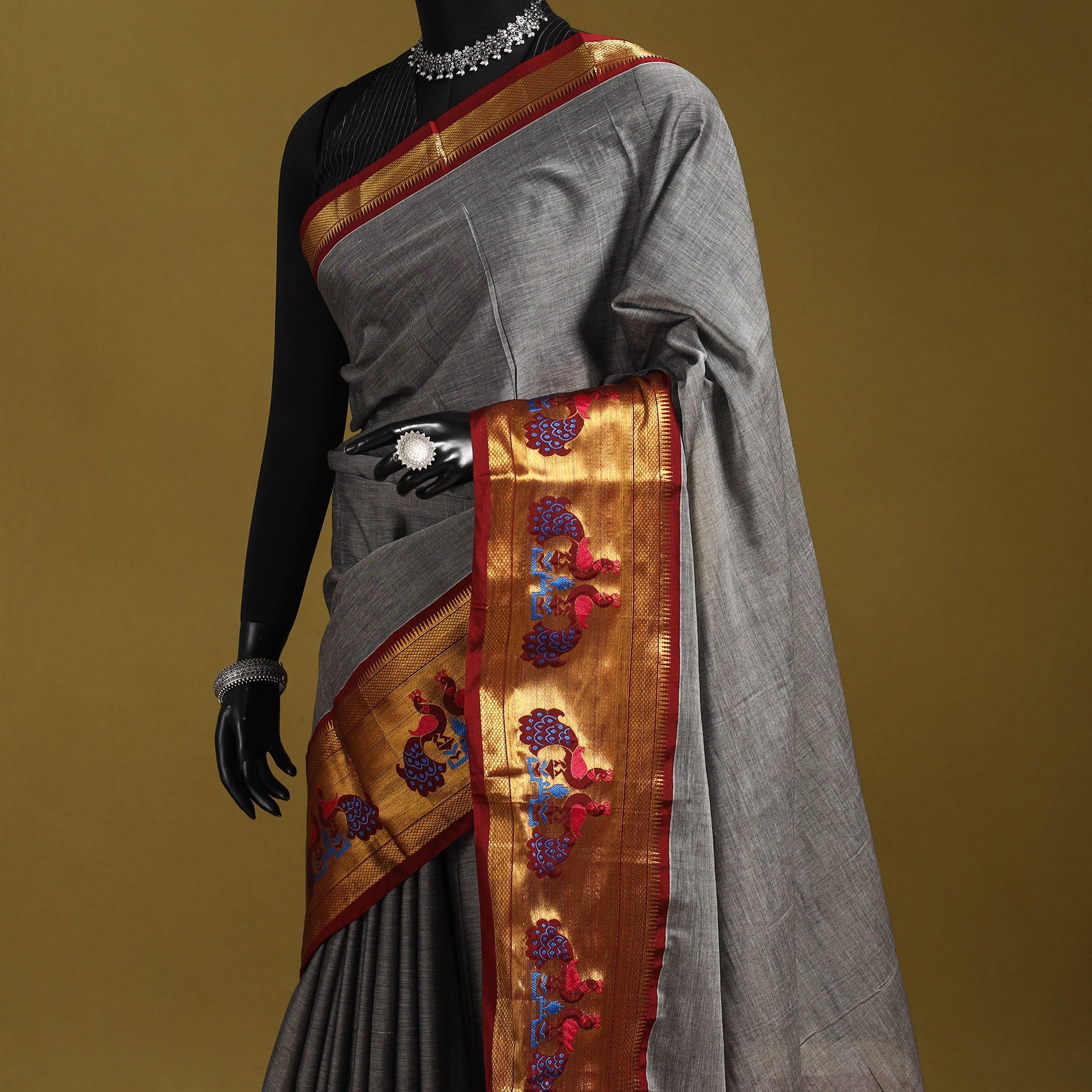 Embrace the traditional elegance of Karnataka with our grey dharwad cotton saree. This saree features a captivating woven border, meticulously crafted by the skilled weavers of Dharwad. The border showcases intricate motifs and patterns that reflect the rich cultural heritage of Karnataka. These exquisite details bring a sense of grace and sophistication, making the saree ideal for both formal occasions and festive celebrations.