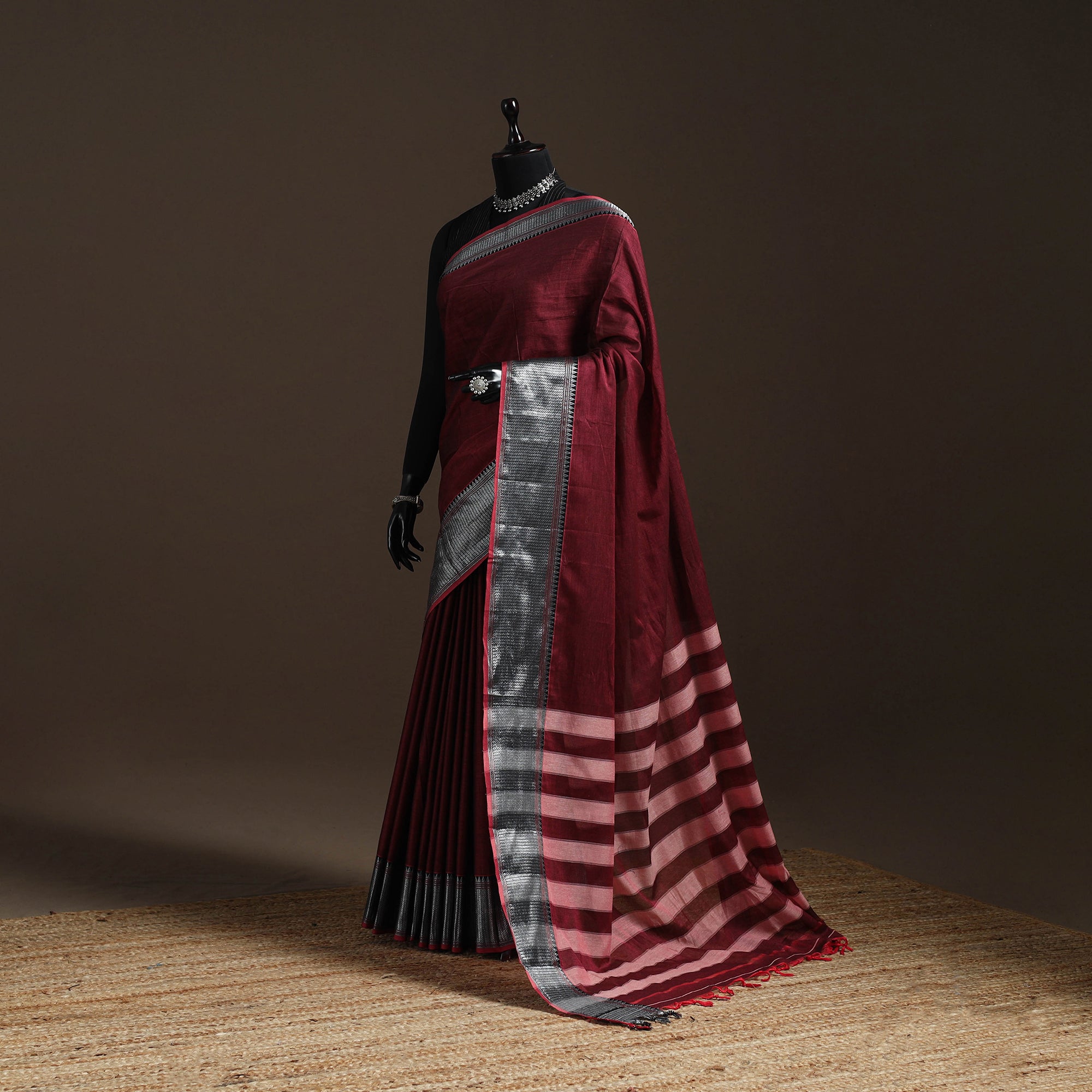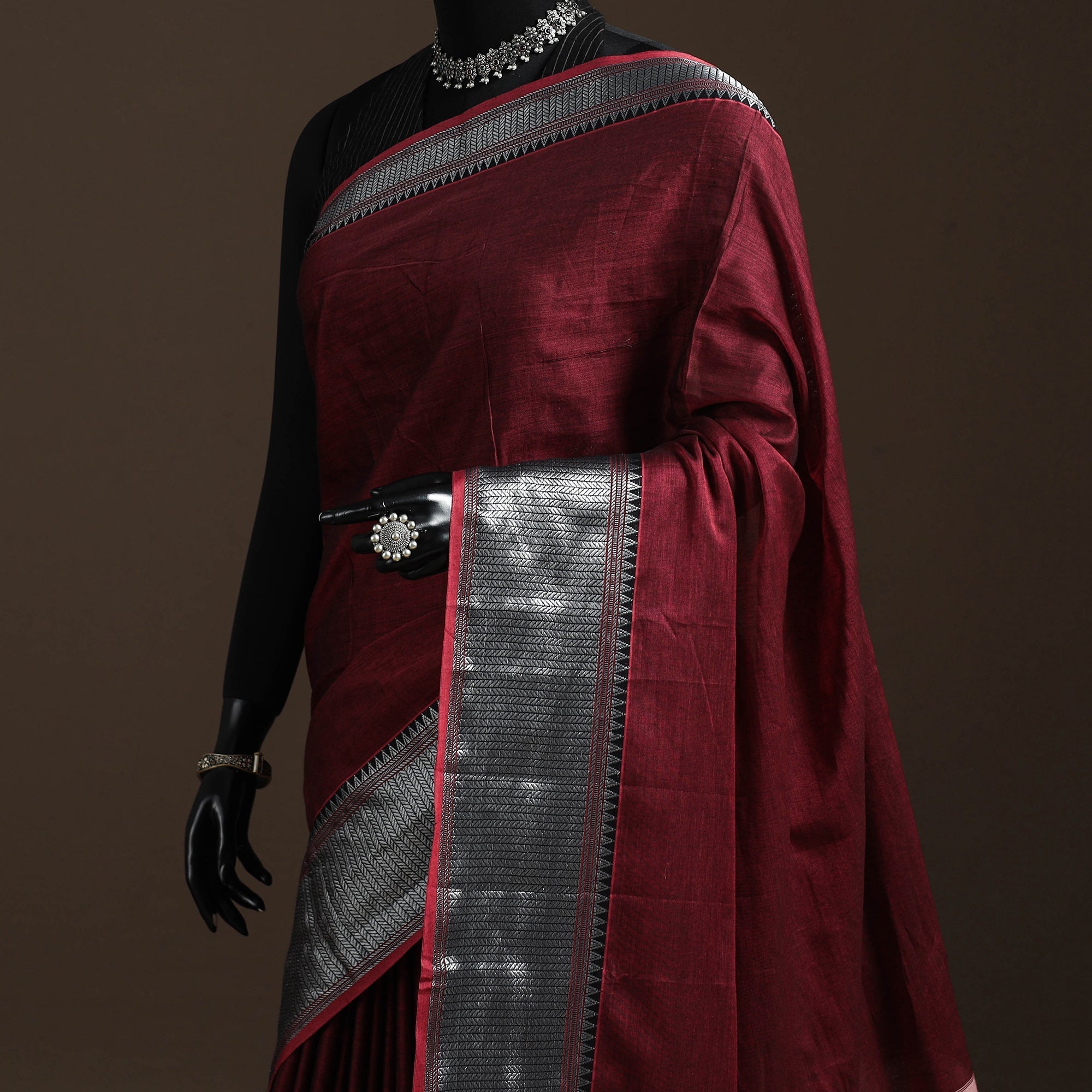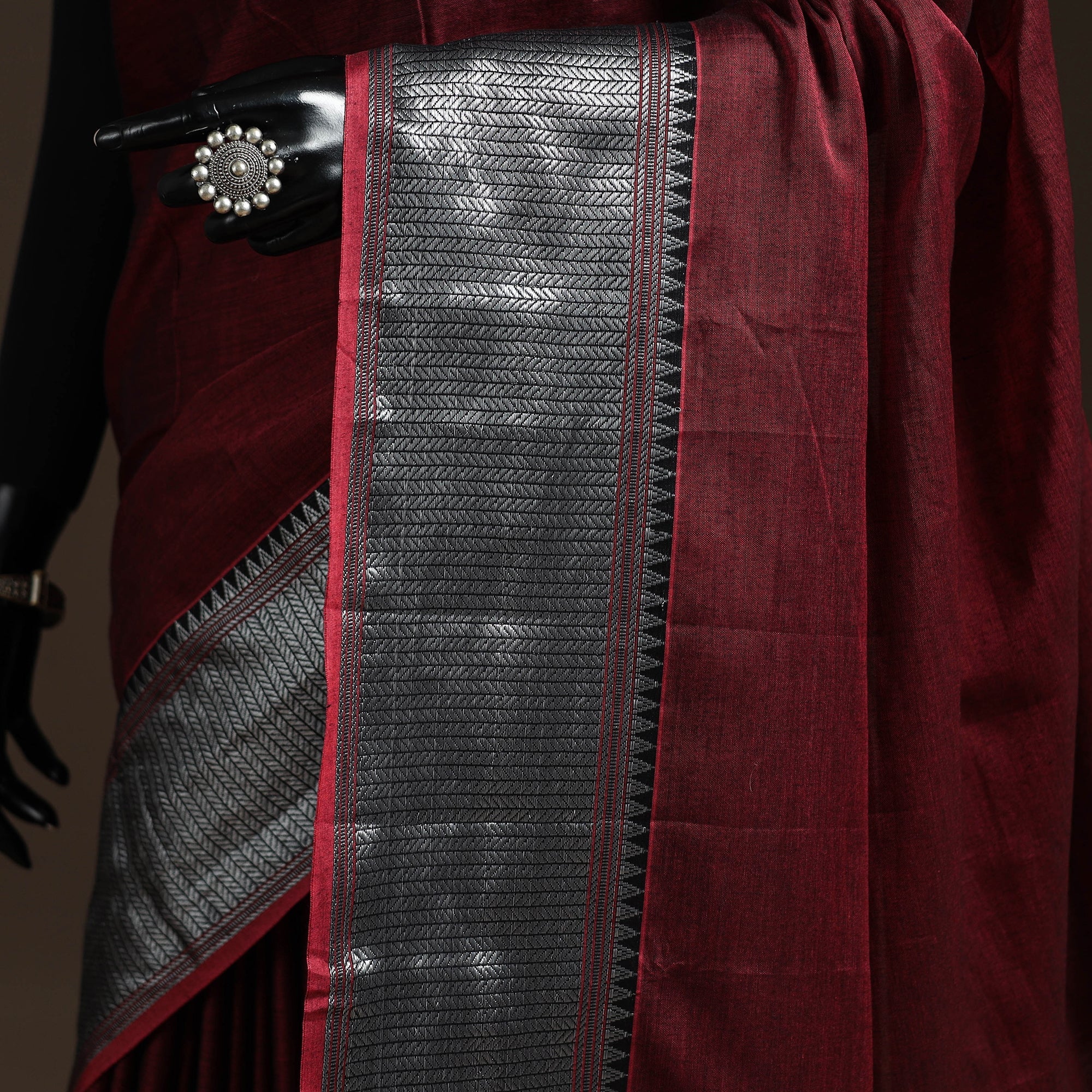 Maroon dharwad cotton saree from Karnataka is woven using a traditional method known for its firm texture and intricate border work. The border features fine motifs and patterns that reflect the region’s style. These simple yet graceful details make the saree perfect for both formal occasions and festive celebrations.