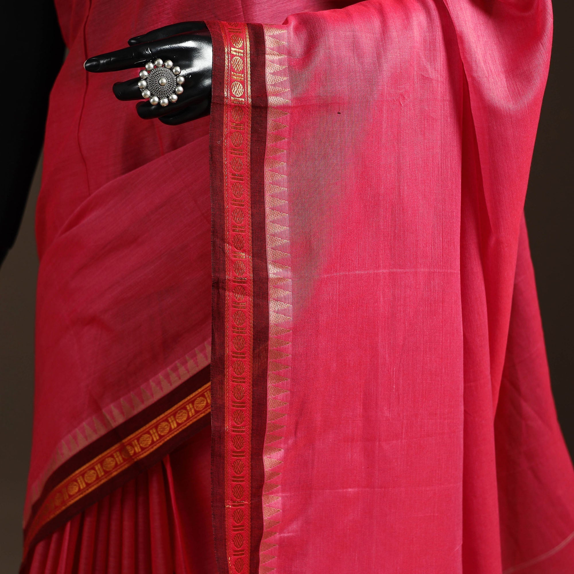 Pink dharwad cotton saree from Karnataka is woven using a traditional method known for its firm texture and intricate border work. The border features fine motifs and patterns that reflect the region’s style. These simple yet graceful details make the saree perfect for both formal occasions and festive celebrations.
