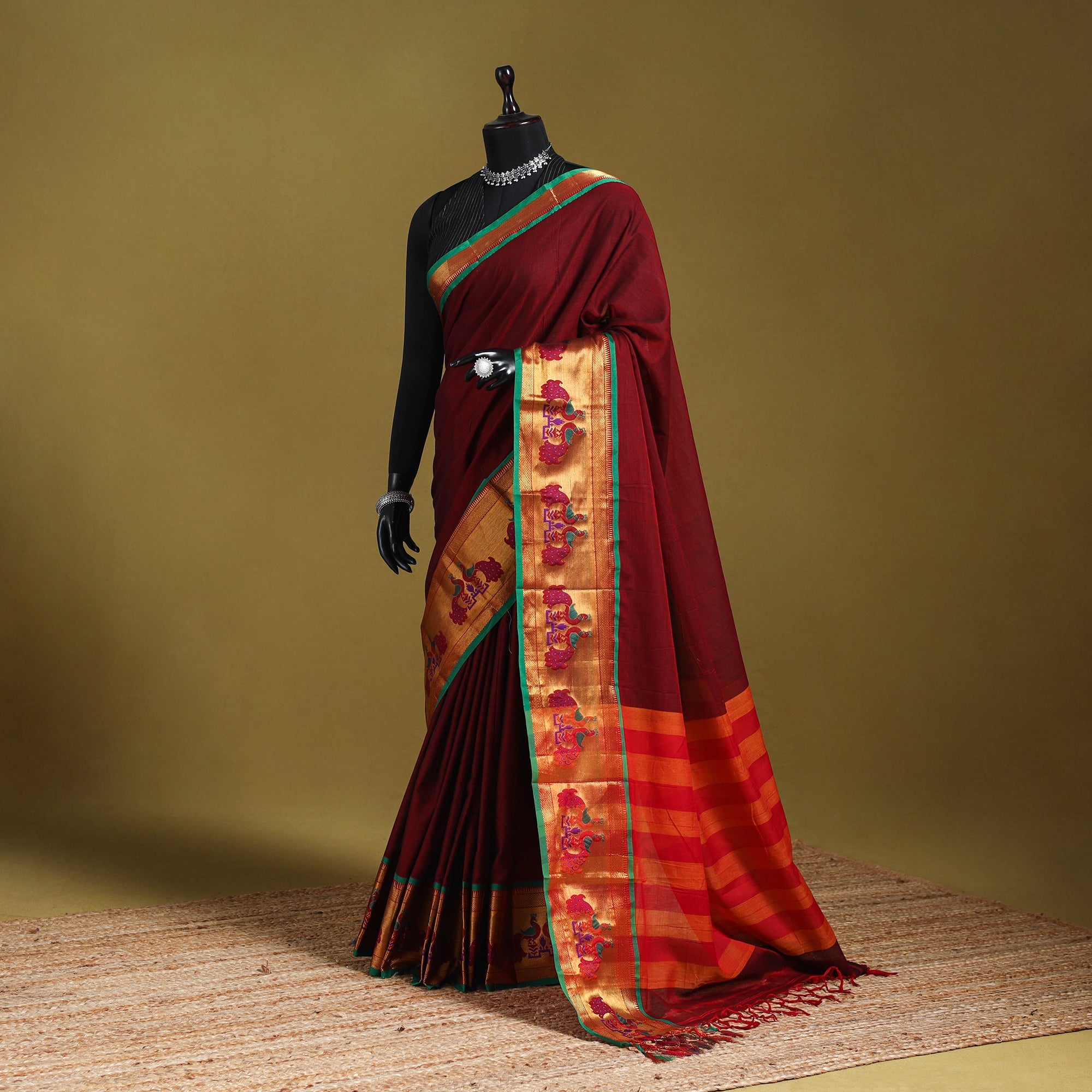 Embrace the traditional elegance of Karnataka with our maroon dharwad cotton saree. This saree features a captivating woven border, meticulously crafted by the skilled weavers of Dharwad. The border showcases intricate motifs and patterns that reflect the rich cultural heritage of Karnataka. These exquisite details bring a sense of grace and sophistication, making the saree ideal for both formal occasions and festive celebrations.
