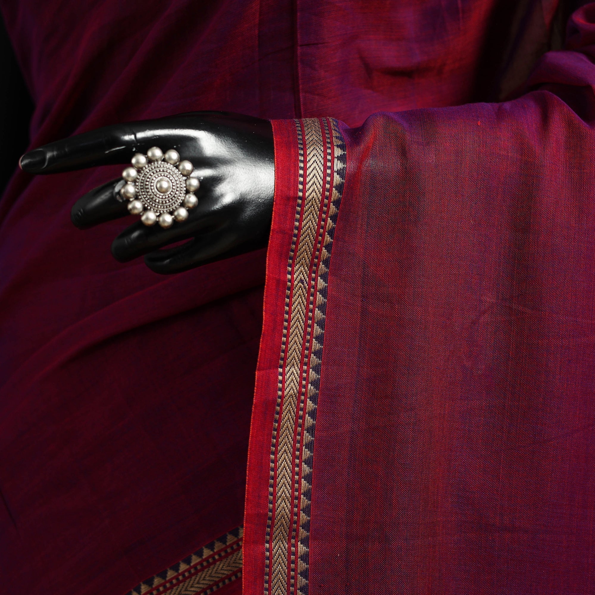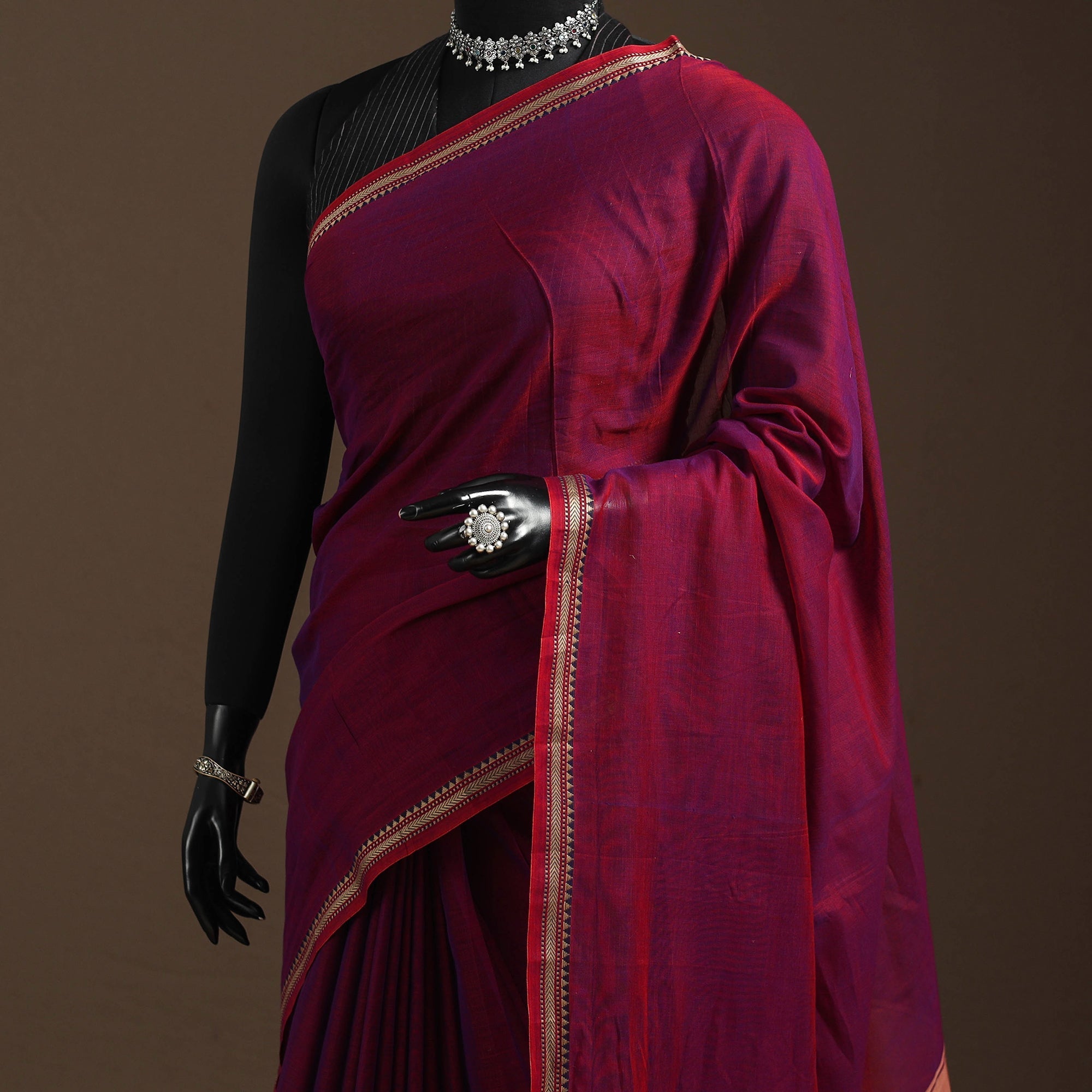 Embrace the elegance of Karnataka with our purple dharwad cotton saree. It features a beautifully woven border, carefully made by the skilled weavers of Dharwad. The border has fine motifs and patterns that reflect the weaving style of the region. These simple yet graceful details make the saree perfect for both formal occasions and festive celebrations.