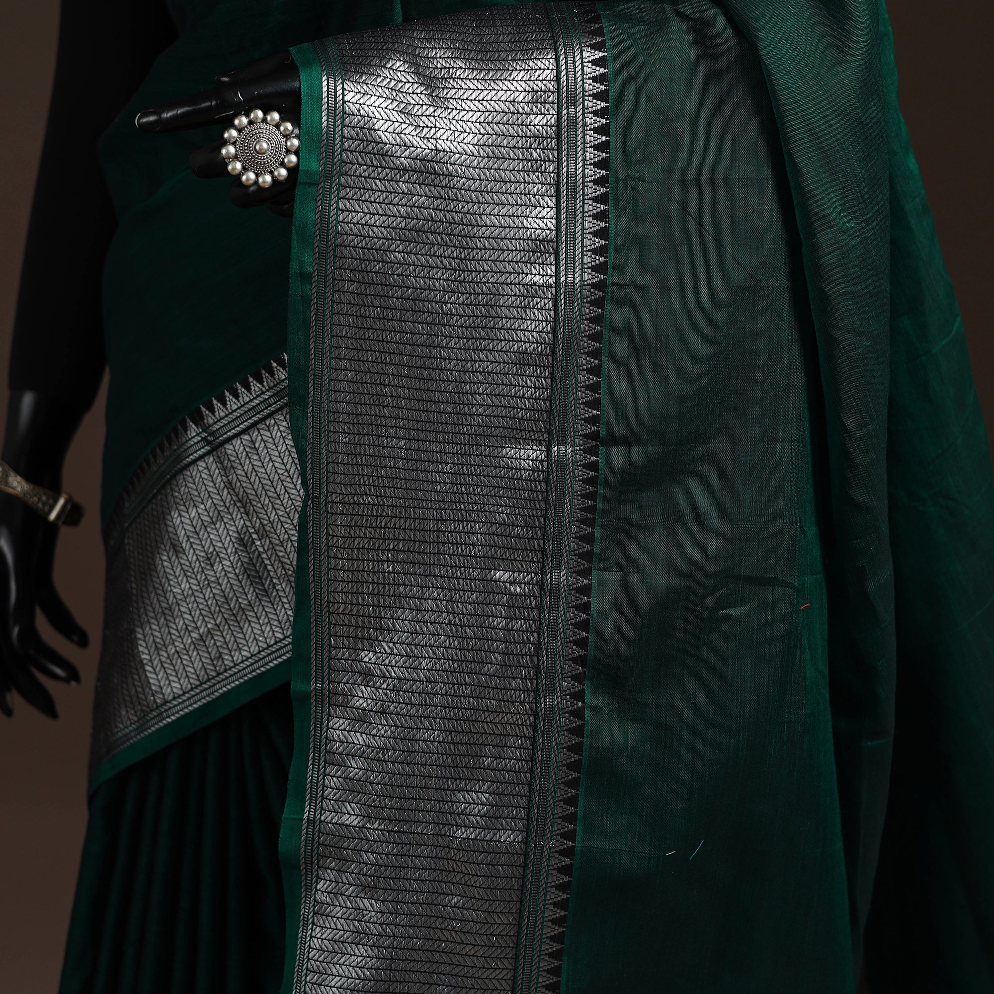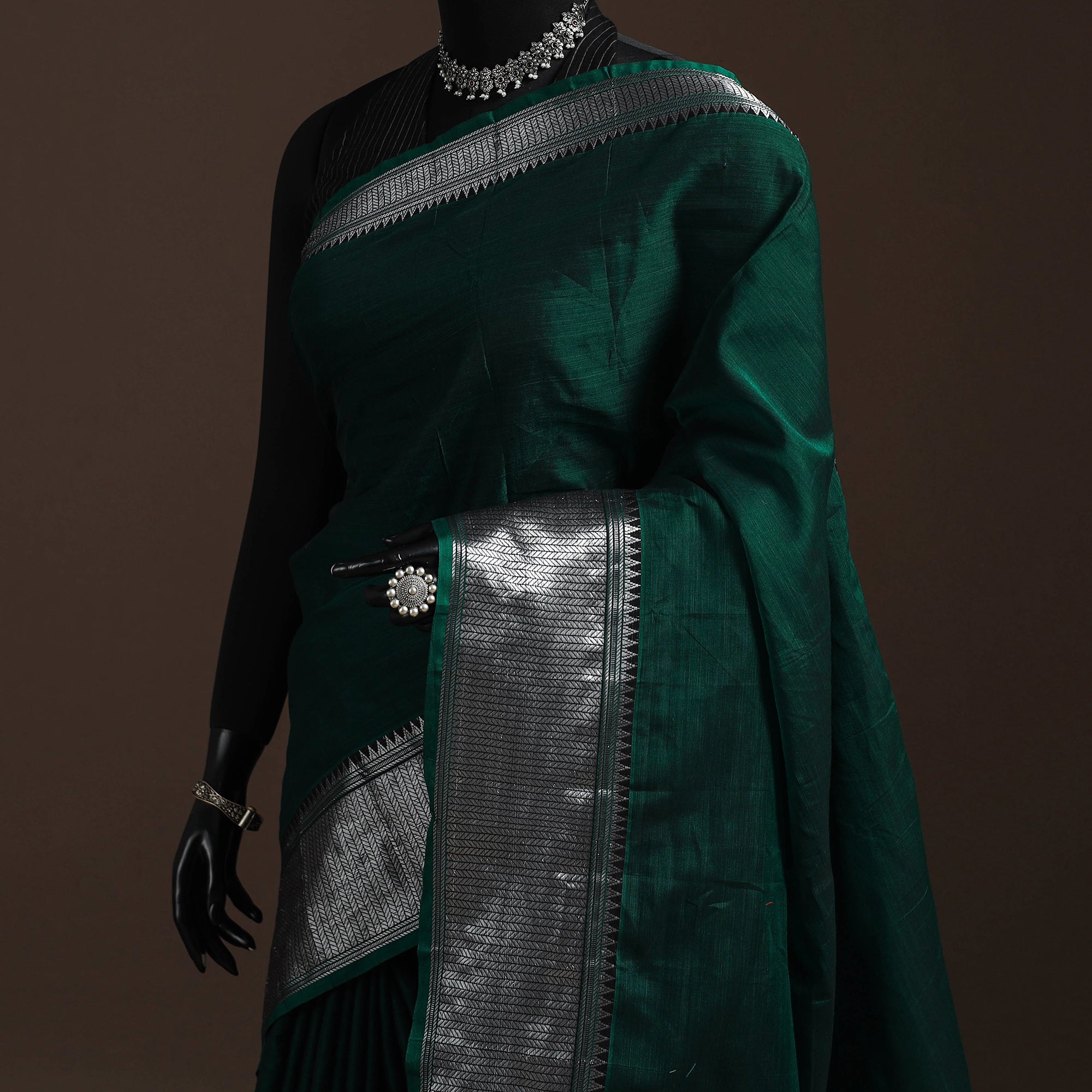 Green dharwad cotton saree from Karnataka is woven using a traditional method known for its firm texture and intricate border work. The border features fine motifs and patterns that reflect the region’s style. These simple yet graceful details make the saree perfect for both formal occasions and festive celebrations.