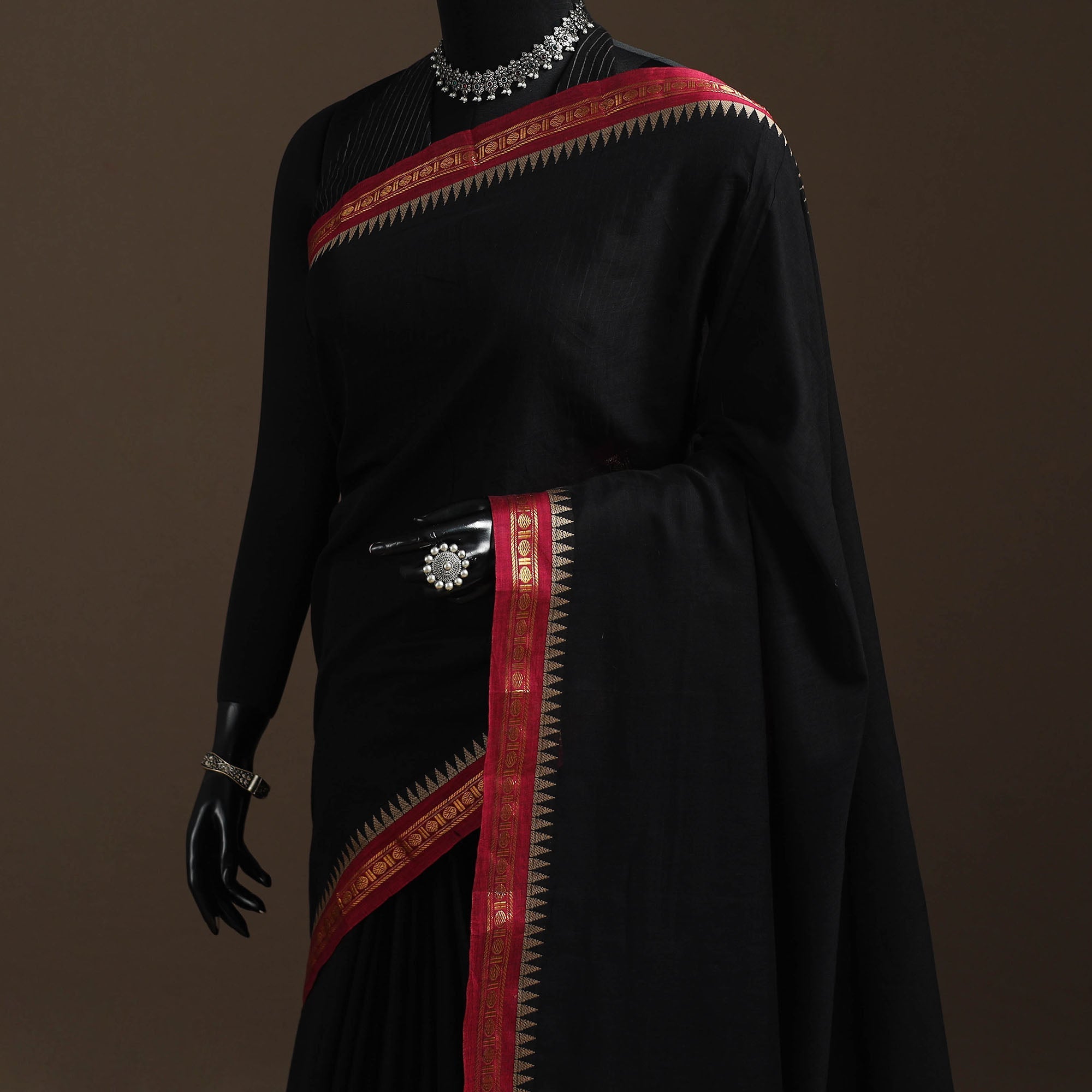 | Material | Black dharwad cotton saree from Karnataka is woven using a traditional method known for its firm texture and intricate border work. The border features fine motifs and patterns that reflect the region’s style. These simple yet graceful details make the saree perfect for both formal occasions and festive celebrations. Note : This piece carries tiny knots thread pulls or uneven lines not flaws but fingerprints. Every irregularity is a whisper from the hands that made it. It’s what happens when tradition weaves through time not machines. If you’re looking for perfection, this isn’t it. But if you’re looking for soul you’ve found it. |