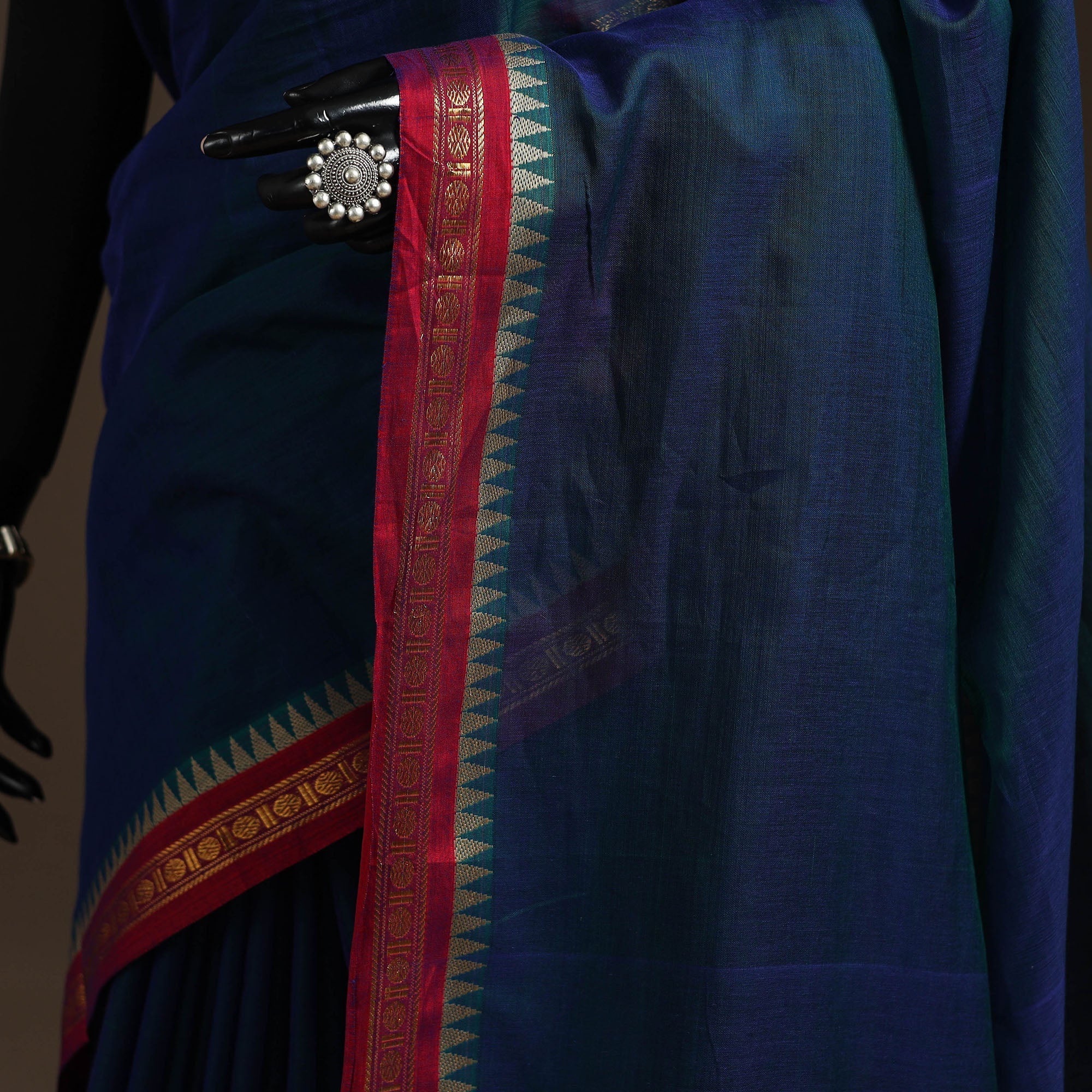 Blue dharwad cotton saree from Karnataka is woven using a traditional method known for its firm texture and intricate border work. The border features fine motifs and patterns that reflect the region’s style. These simple yet graceful details make the saree perfect for both formal occasions and festive celebrations.