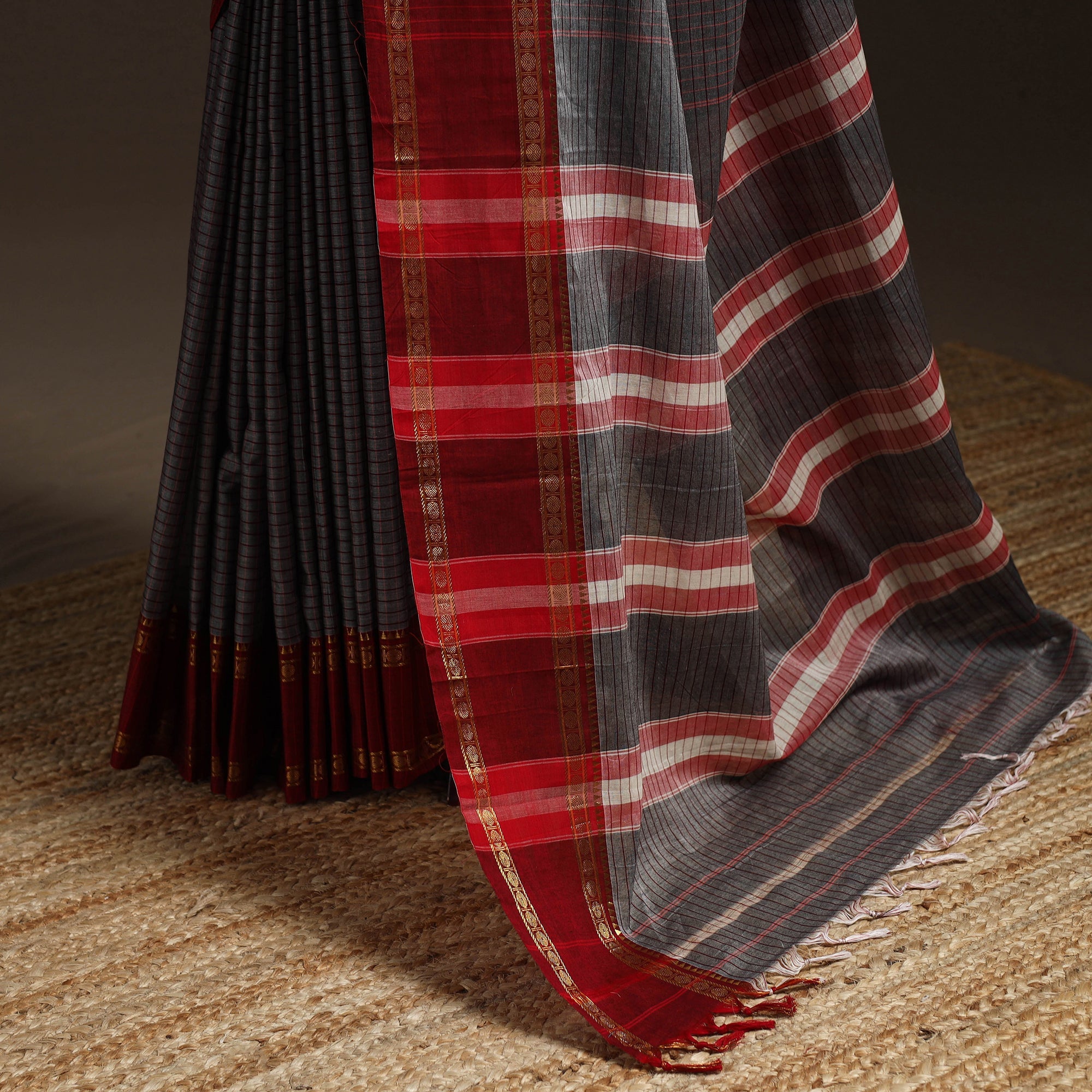 Dharwad cotton saree from Karnataka is woven using a traditional method known for its firm texture and intricate border work. The border features fine motifs and patterns that reflect the region’s style. These simple yet graceful details make the saree perfect for both formal occasions and festive celebrations.