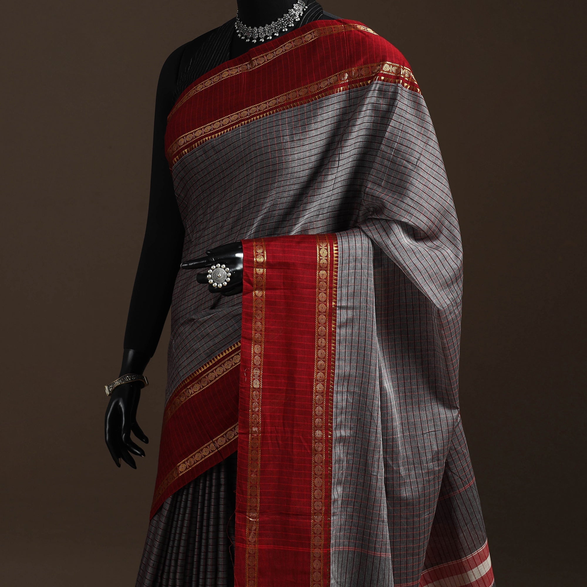 Grey dharwad cotton saree from Karnataka is woven using a traditional method known for its firm texture and intricate border work. The border features fine motifs and patterns that reflect the region’s style. These simple yet graceful details make the saree perfect for both formal occasions and festive celebrations.