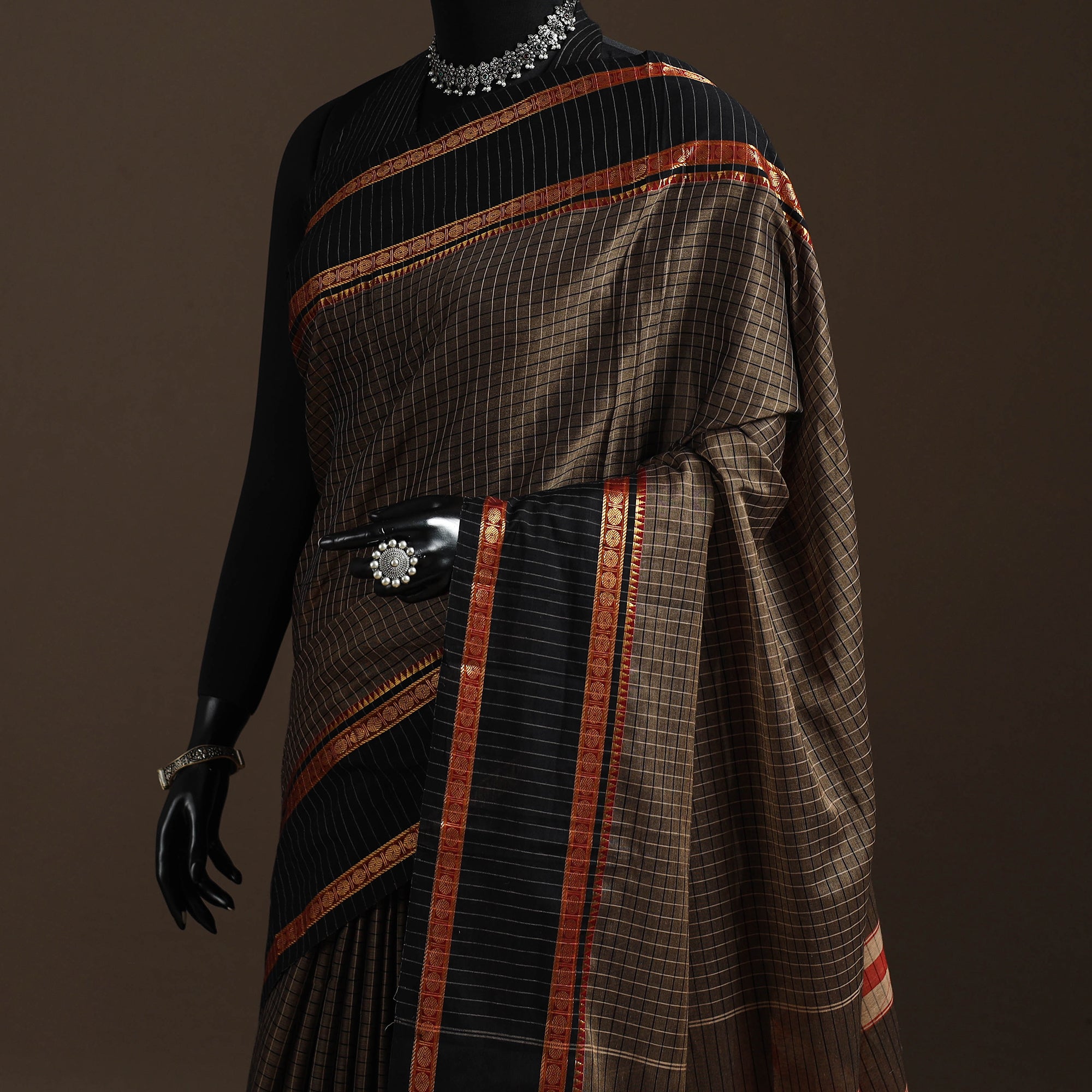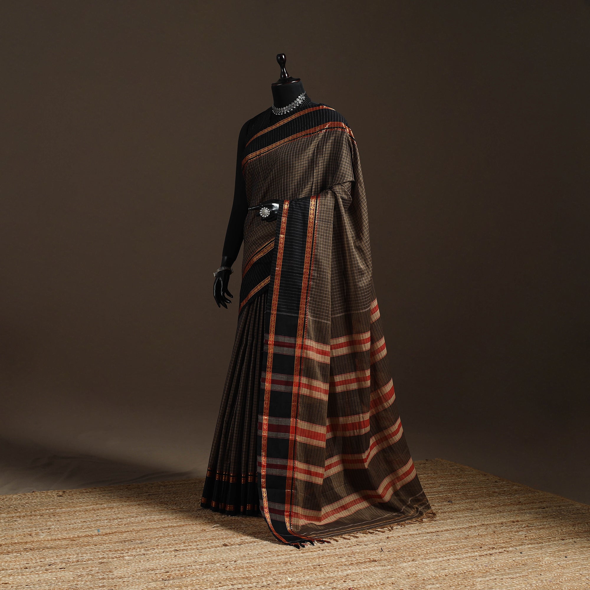Brown dharwad cotton saree from Karnataka is woven using a traditional method known for its firm texture and intricate border work. The border features fine motifs and patterns that reflect the region’s style. These simple yet graceful details make the saree perfect for both formal occasions and festive celebrations.