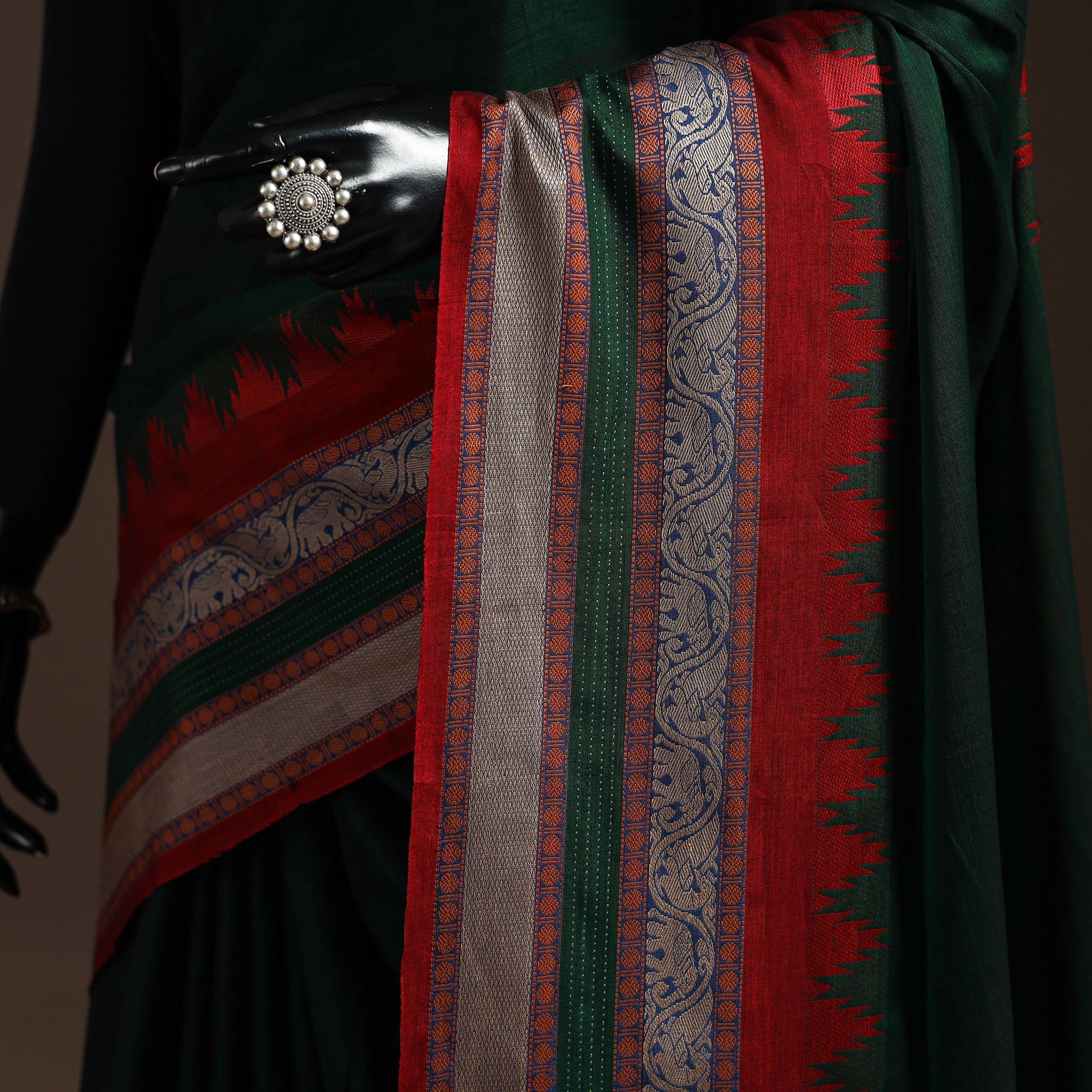 Green dharwad cotton saree from Karnataka is woven using a traditional method known for its firm texture and intricate border work. The border features fine motifs and patterns that reflect the region’s style. These simple yet graceful details make the saree perfect for both formal occasions and festive celebrations.