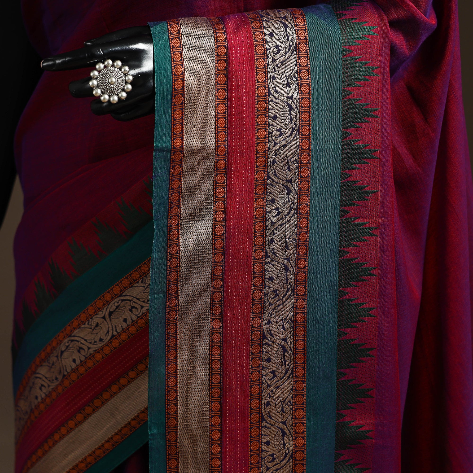 Dharwad cotton saree from Karnataka is woven using a traditional method known for its firm texture and intricate border work. The border features fine motifs and patterns that reflect the region’s style. These simple yet graceful details make the saree perfect for both formal occasions and festive celebrations.