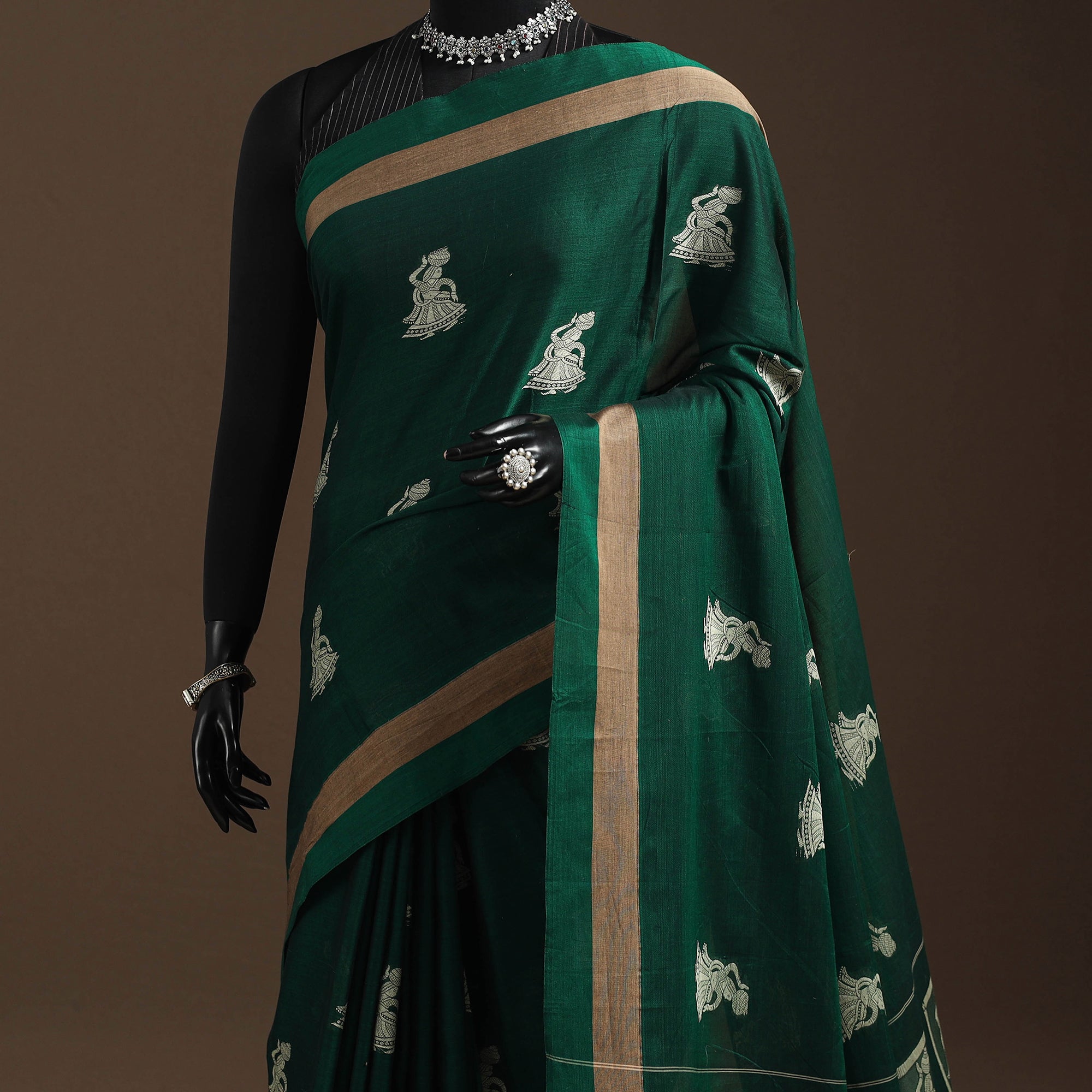 Dharwad cotton saree from Karnataka is woven using a traditional method known for its firm texture. The saree features fine thread buta work, where small motifs are woven directly into the fabric using extra threads. These simple yet graceful details make the saree perfect for both formal occasions and festive celebrations.
