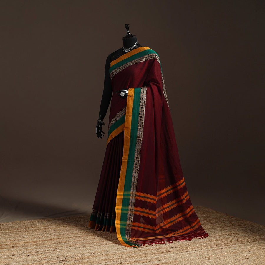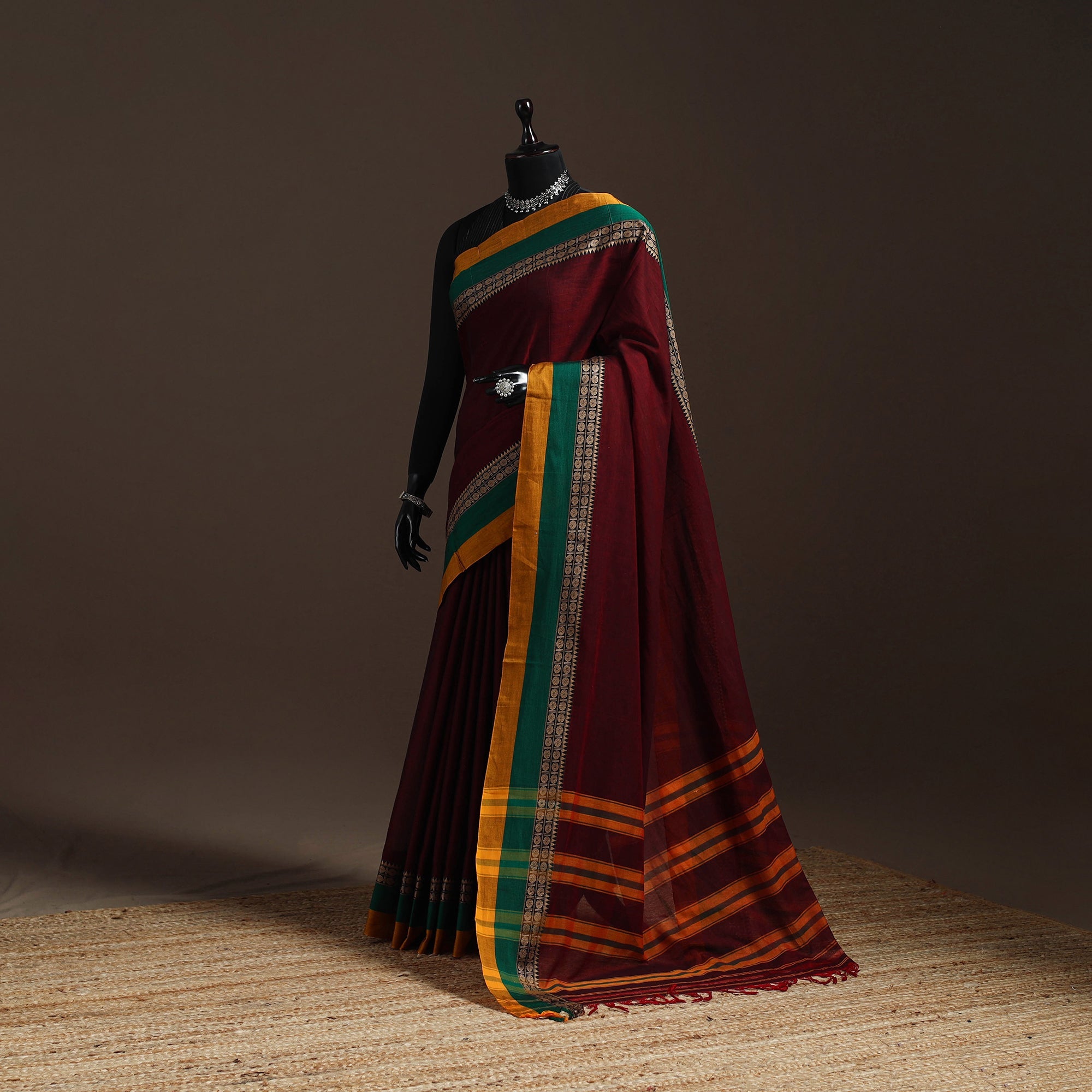 Dharwad cotton saree from Karnataka is woven using a traditional method known for its firm texture and intricate border work. The border features fine motifs and patterns that reflect the region’s style. These simple yet graceful details make the saree perfect for both formal occasions and festive celebrations.