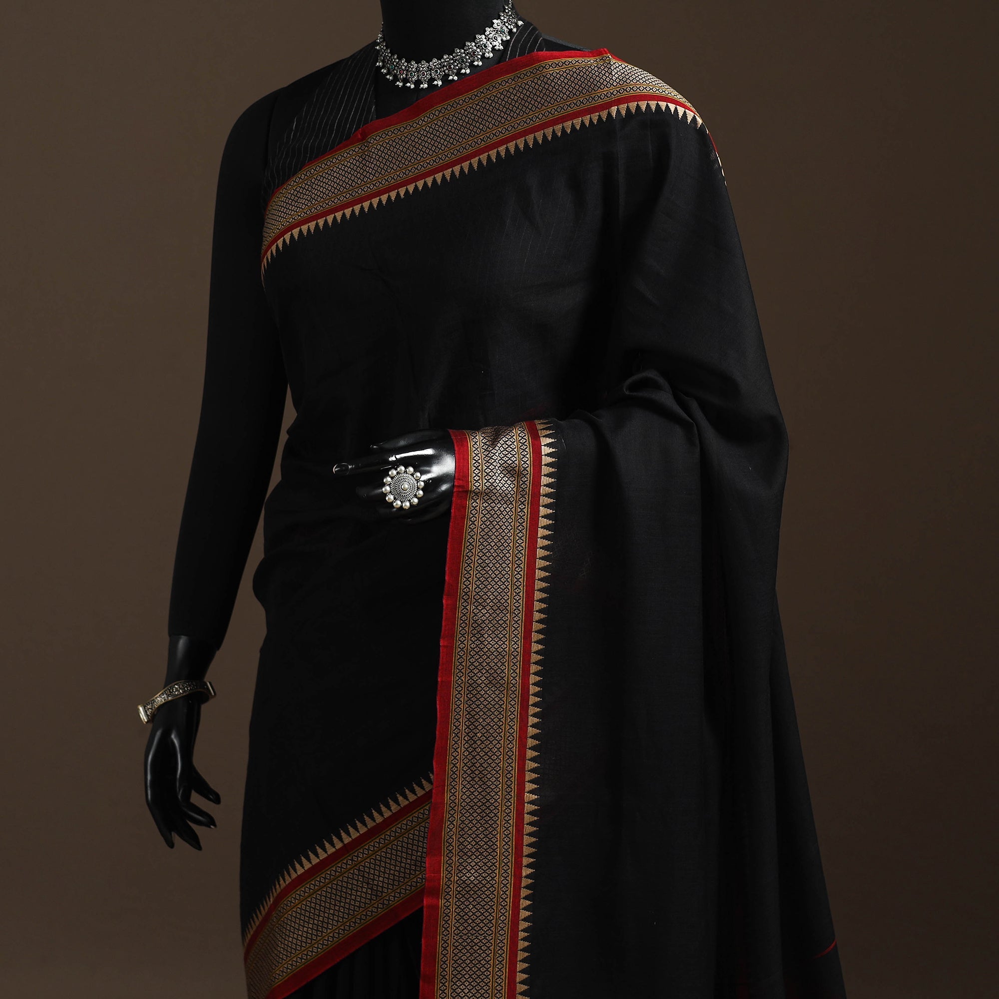 Black dharwad cotton saree from Karnataka is woven using a traditional method known for its firm texture and intricate border work. The border features fine motifs and patterns that reflect the region’s style. These simple yet graceful details make the saree perfect for both formal occasions and festive celebrations.