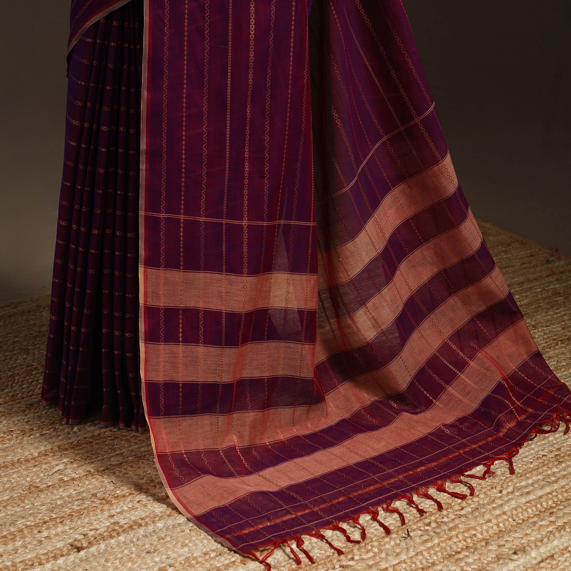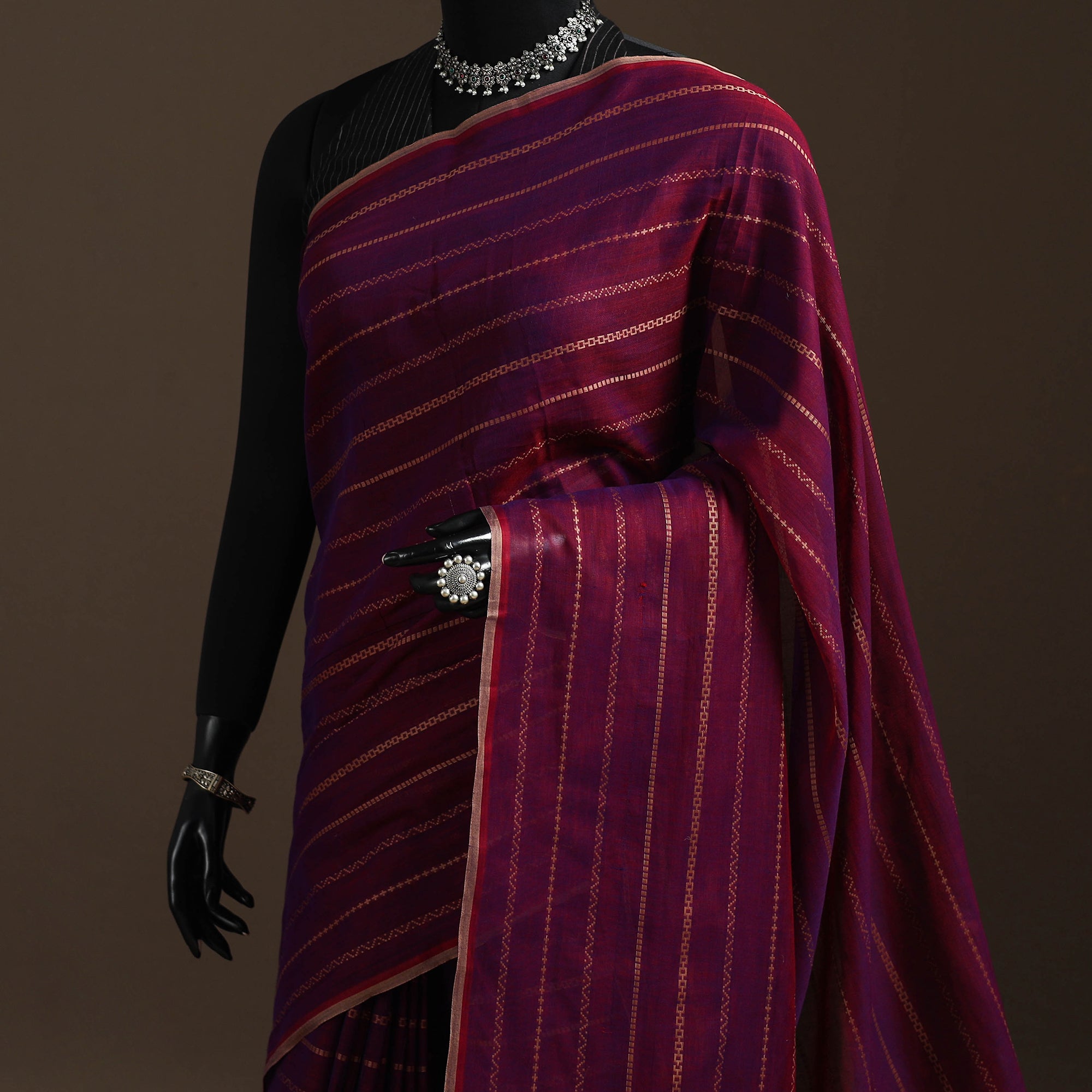 Purple dharwad cotton saree from Karnataka is woven using a traditional method known for its firm texture. The saree features fine thread stripes, where small motifs are woven directly into the fabric using extra threads. These simple yet graceful details make the saree perfect for both formal occasions and festive celebrations.