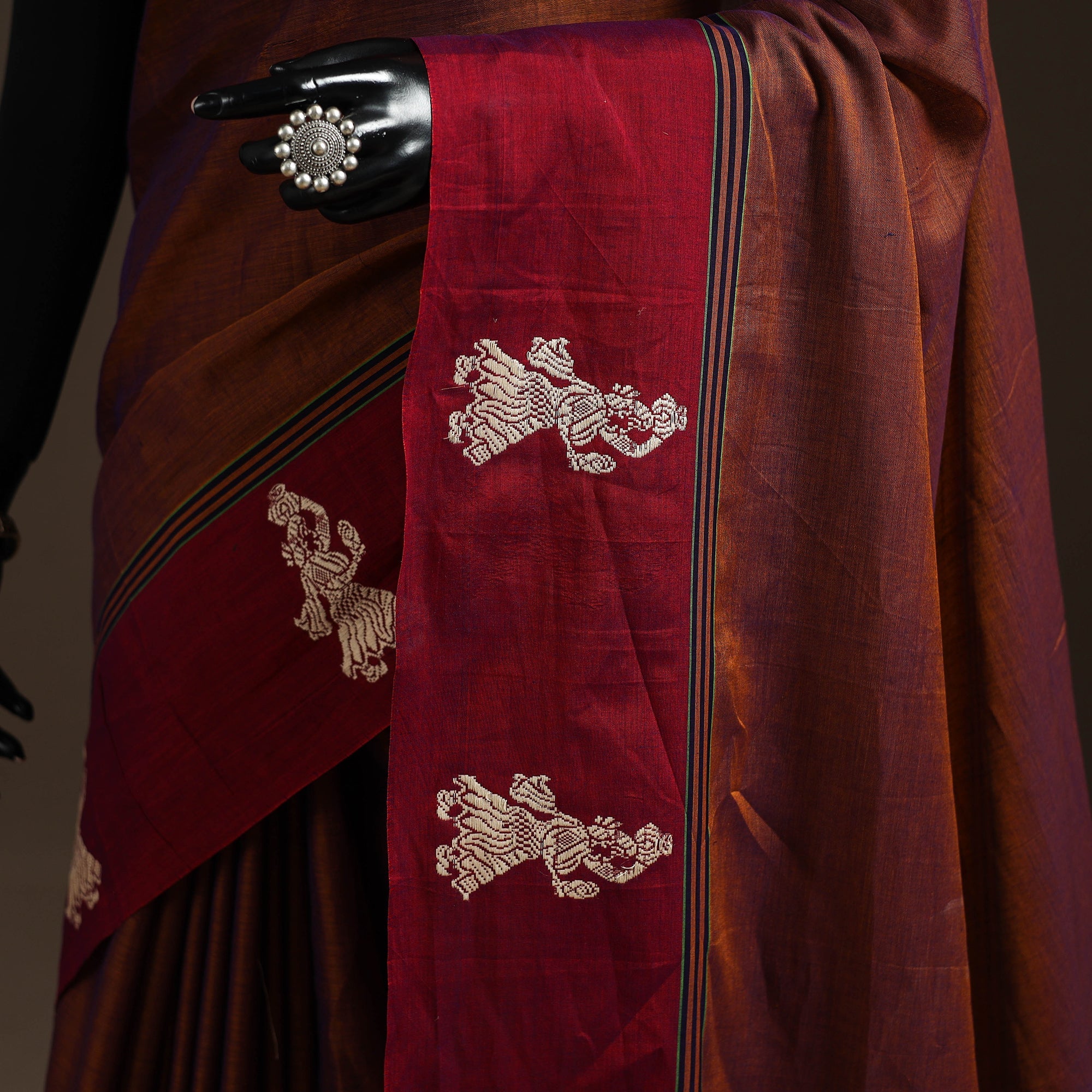 Dharwad cotton saree from Karnataka is woven using a traditional method known for its firm texture and intricate border work. The border features fine motifs and patterns that reflect the region’s style. These simple yet graceful details make the saree perfect for both formal occasions and festive celebrations.