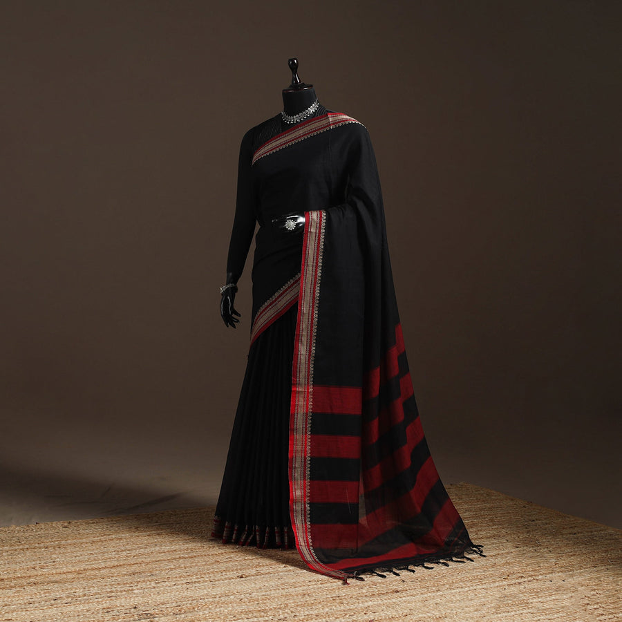 Black dharwad cotton saree from Karnataka is woven using a traditional method known for its firm texture and intricate border work. The border features fine motifs and patterns that reflect the region’s style. These simple yet graceful details make the saree perfect for both formal occasions and festive celebrations.
