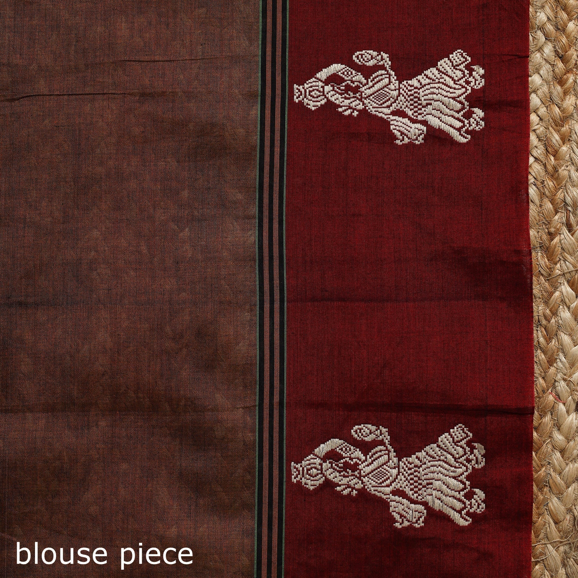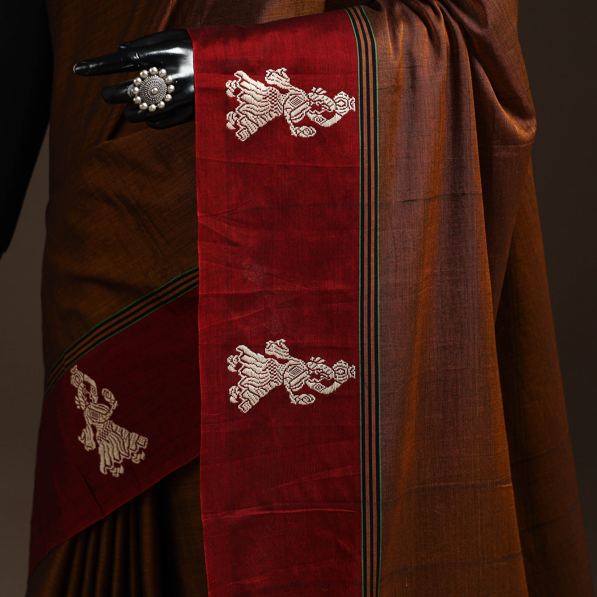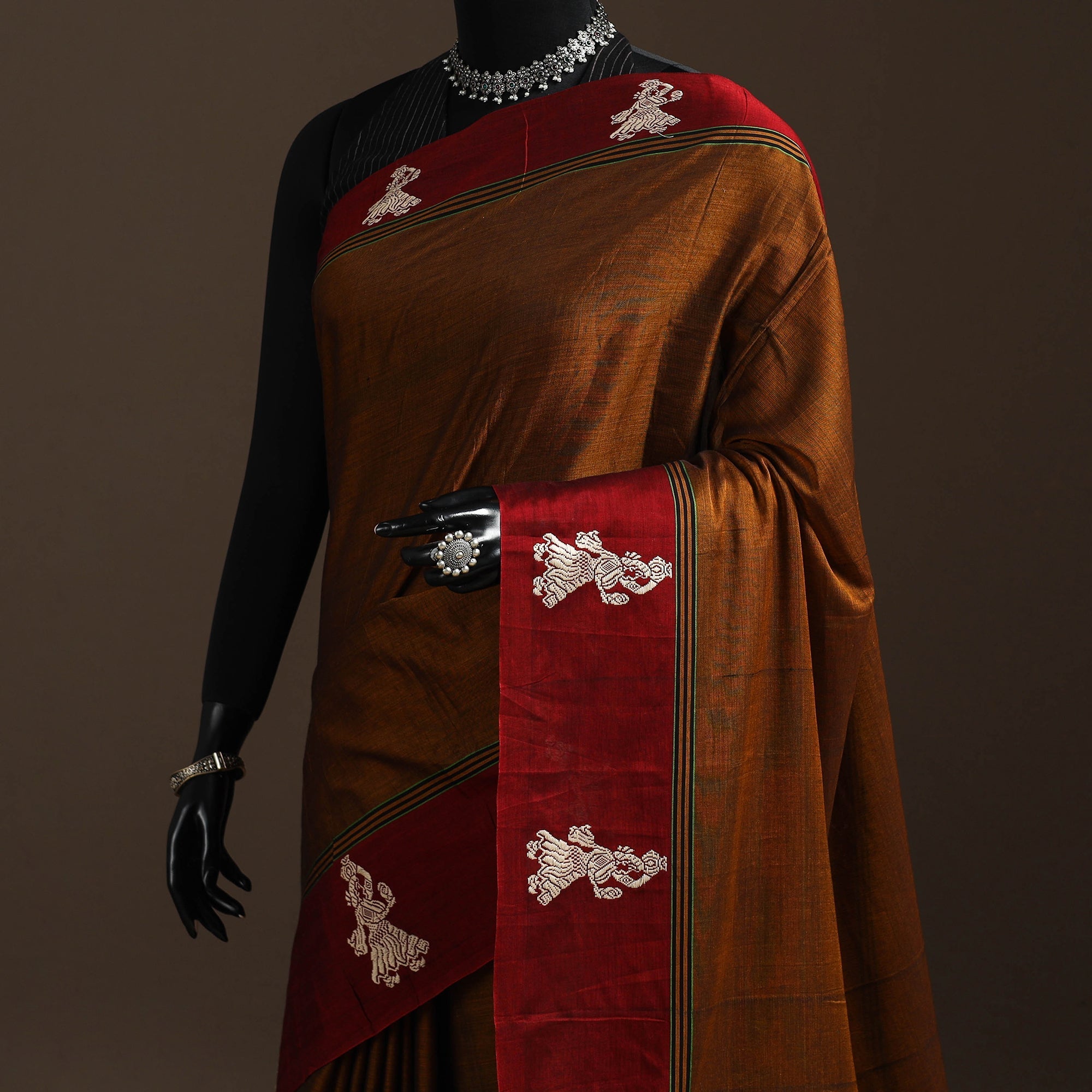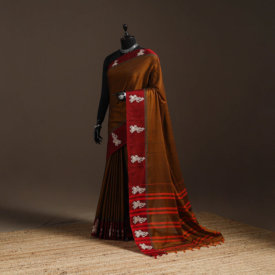 Brown dharwad cotton saree from Karnataka is woven using a traditional method known for its firm texture and intricate border work. The border features fine motifs and patterns that reflect the region’s style. These simple yet graceful details make the saree perfect for both formal occasions and festive celebrations.