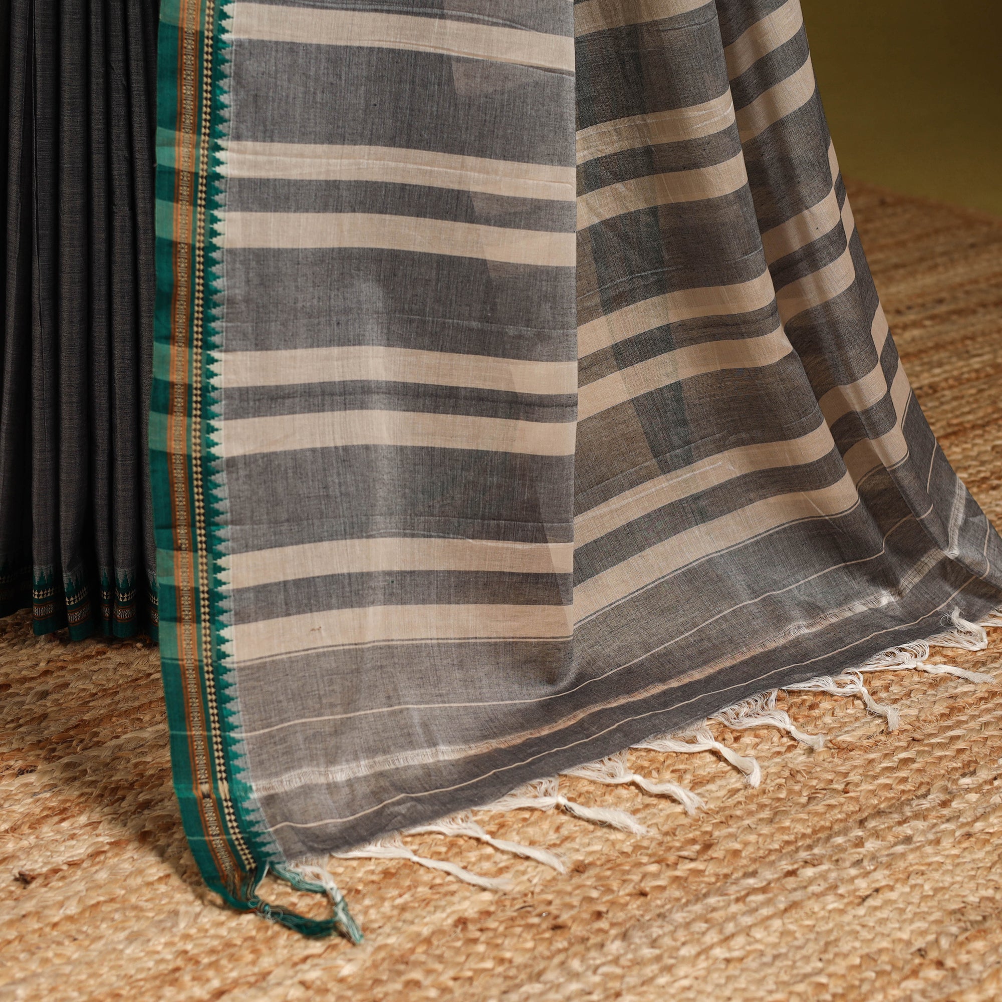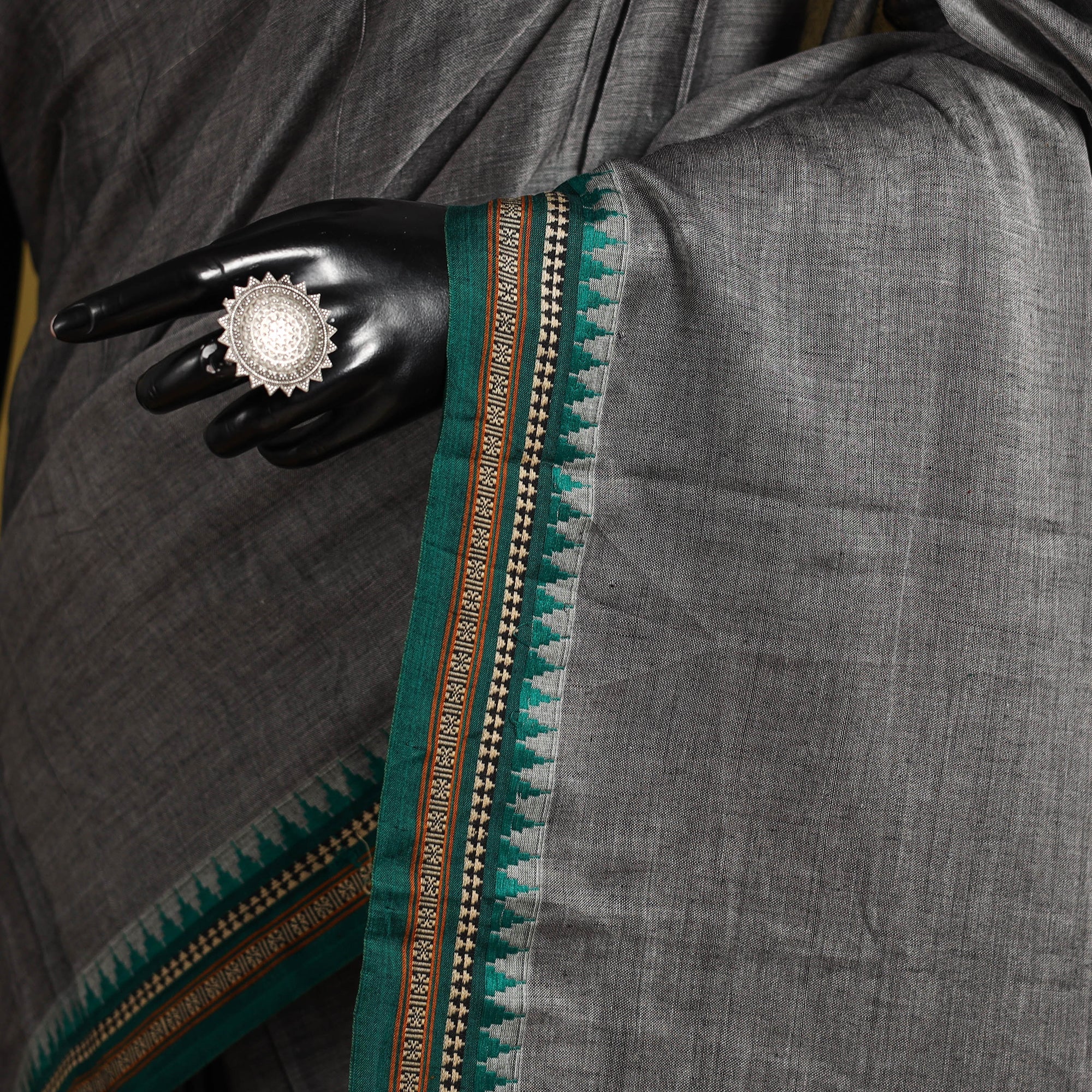 Embrace the traditional elegance of Karnataka with our grey dharwad cotton saree. This saree features a captivating woven border, meticulously crafted by the skilled weavers of Dharwad. The border showcases intricate motifs and patterns that reflect the rich cultural heritage of Karnataka. These exquisite details bring a sense of grace and sophistication, making the saree ideal for both formal occasions and festive celebrations.
