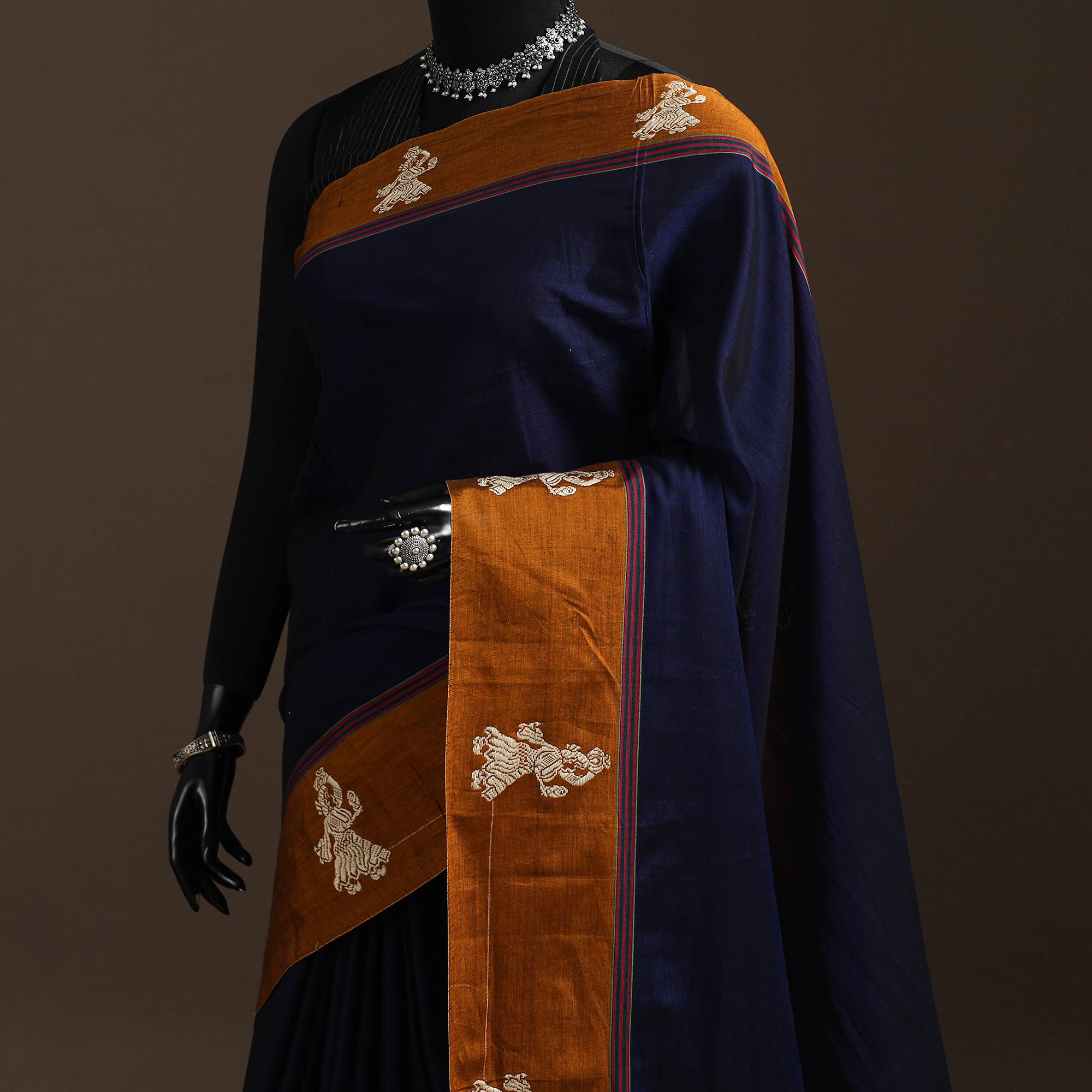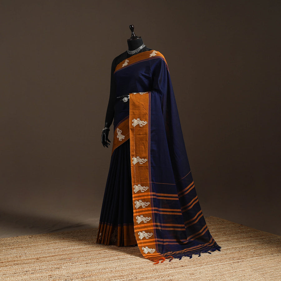 Blue dharwad cotton saree from Karnataka is woven using a traditional method known for its firm texture and intricate border work. The border features fine motifs and patterns that reflect the region’s style. These simple yet graceful details make the saree perfect for both formal occasions and festive celebrations.
