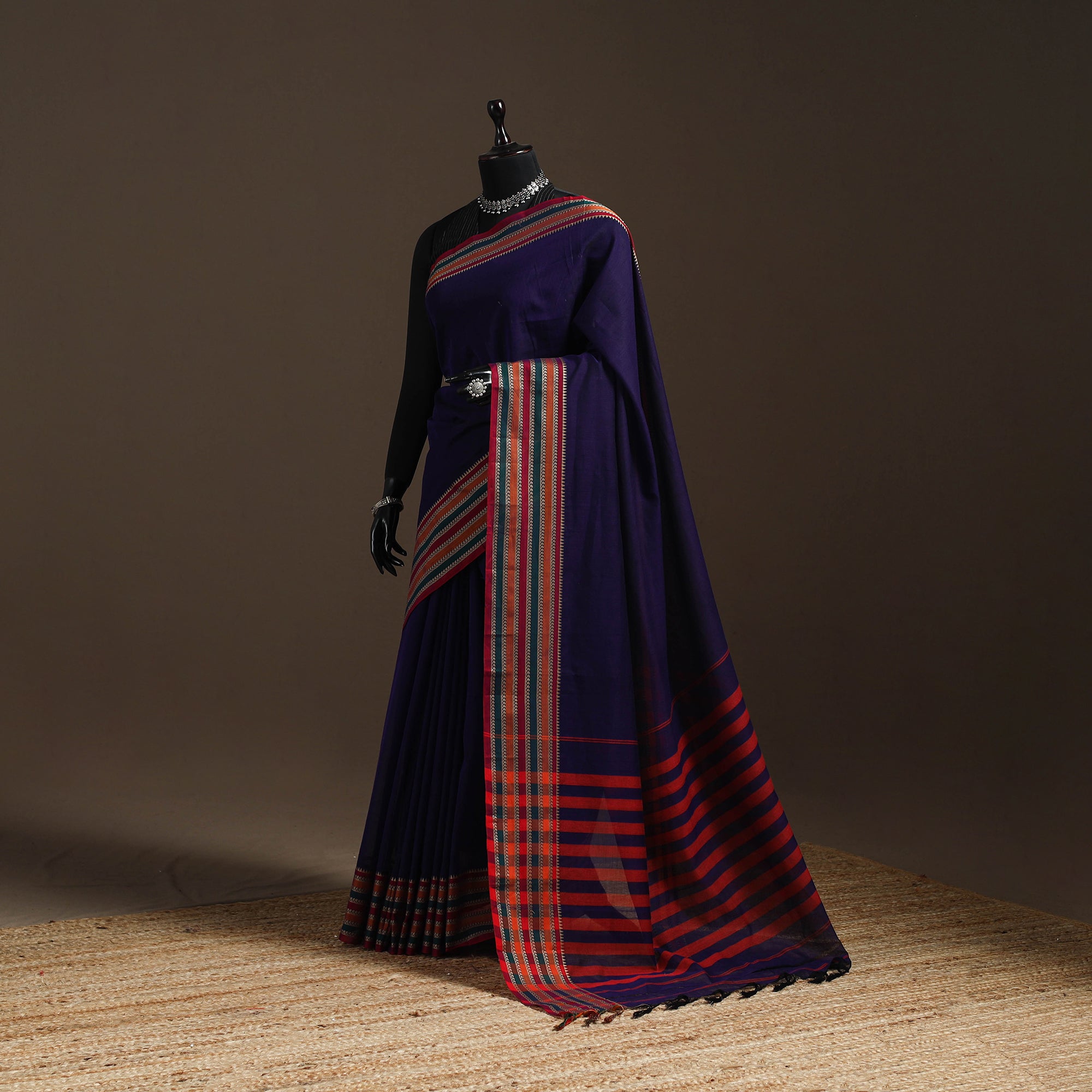 Purple dharwad cotton saree from Karnataka is woven using a traditional method known for its firm texture and intricate border work. The border features fine motifs and patterns that reflect the region’s style. These simple yet graceful details make the saree perfect for both formal occasions and festive celebrations.