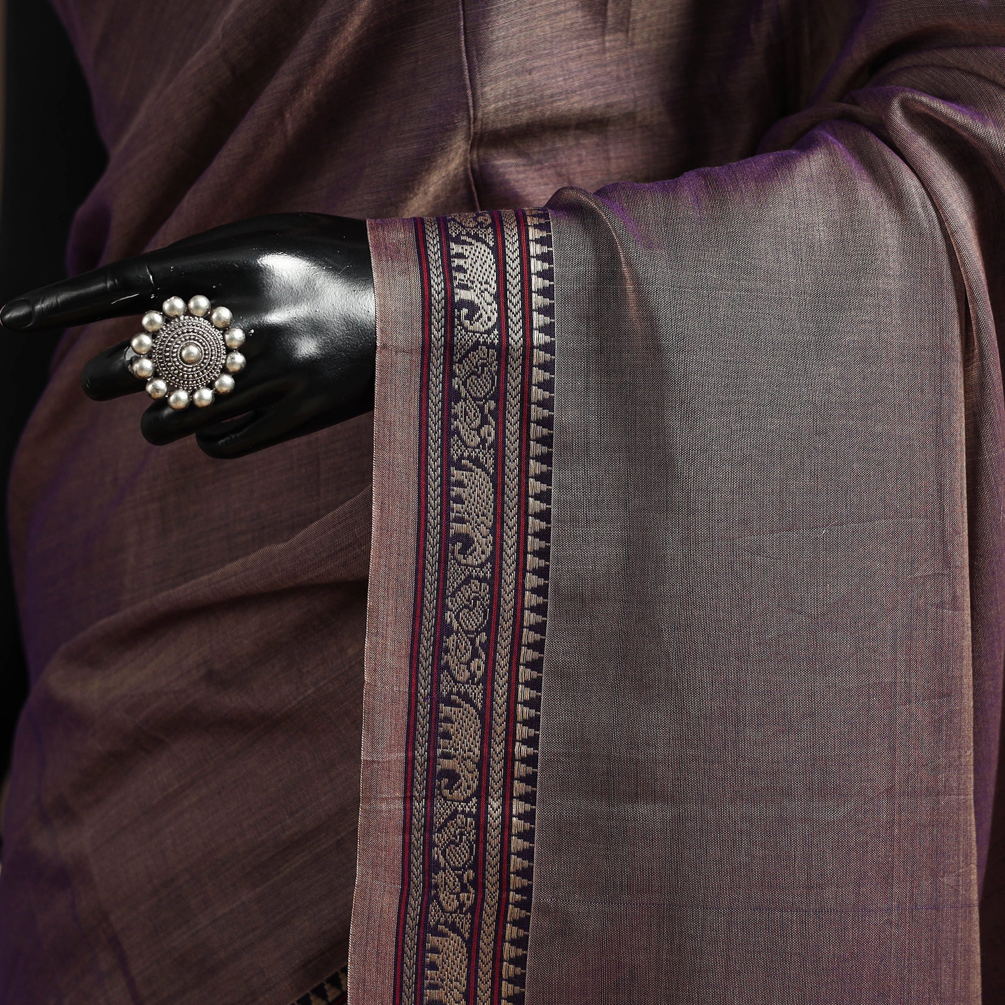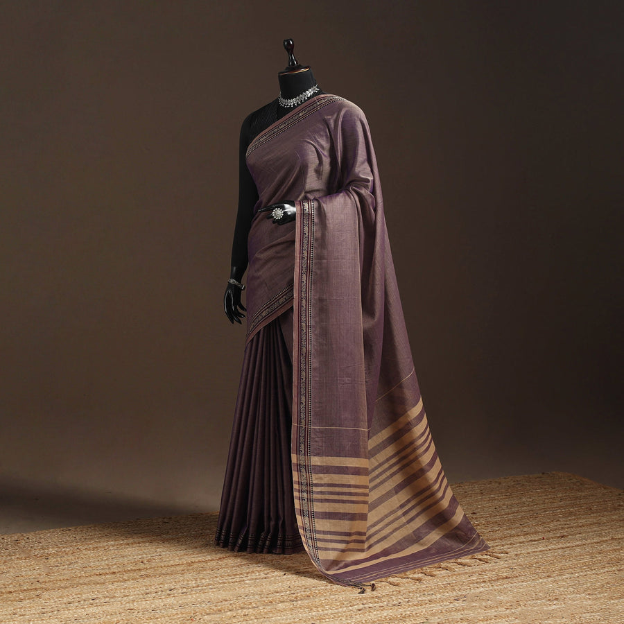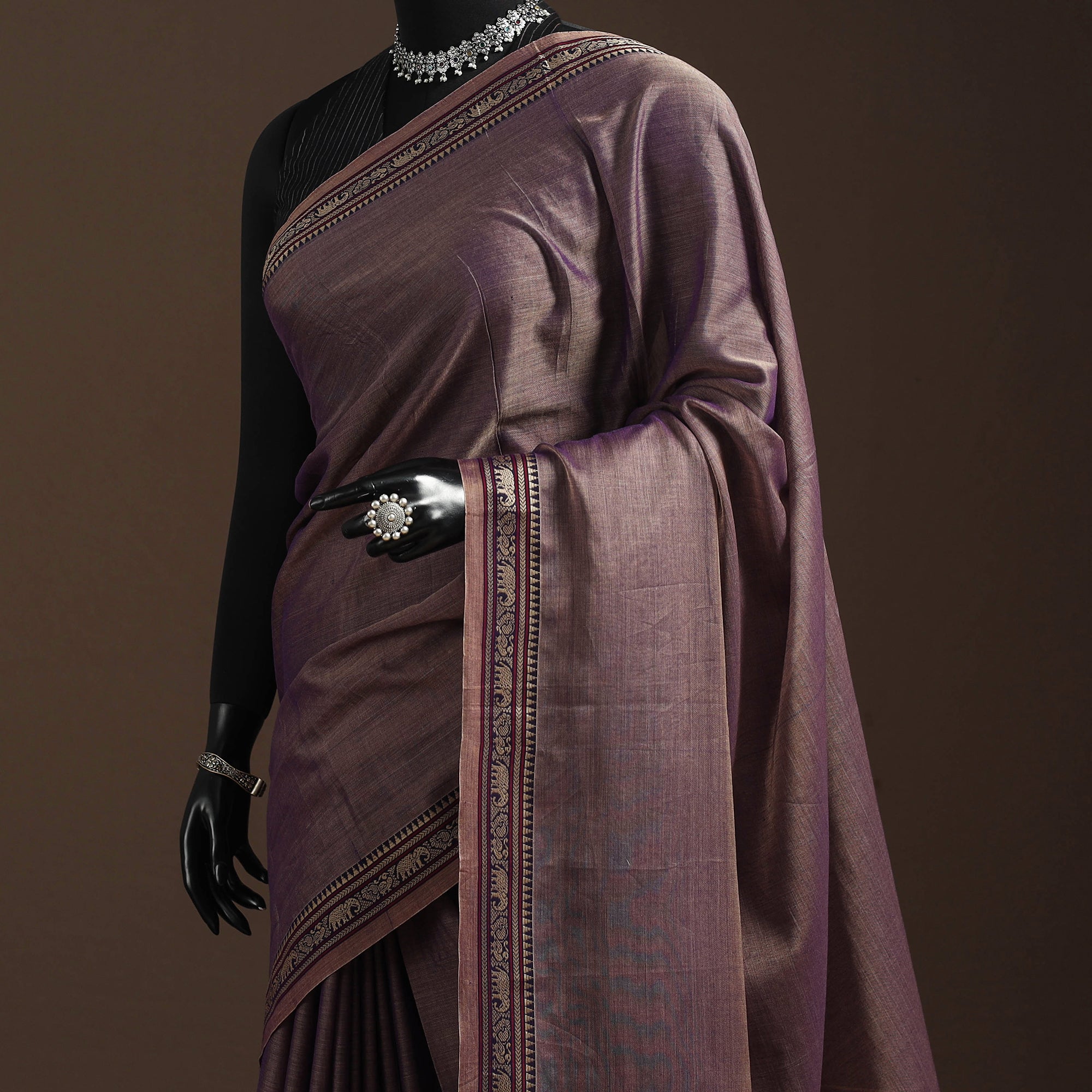 Embrace the elegance of Karnataka with our purple dharwad cotton saree. It features a beautifully woven border, carefully made by the skilled weavers of Dharwad. The border has fine motifs and patterns that reflect the weaving style of the region. These simple yet graceful details make the saree perfect for both formal occasions and festive celebrations.
