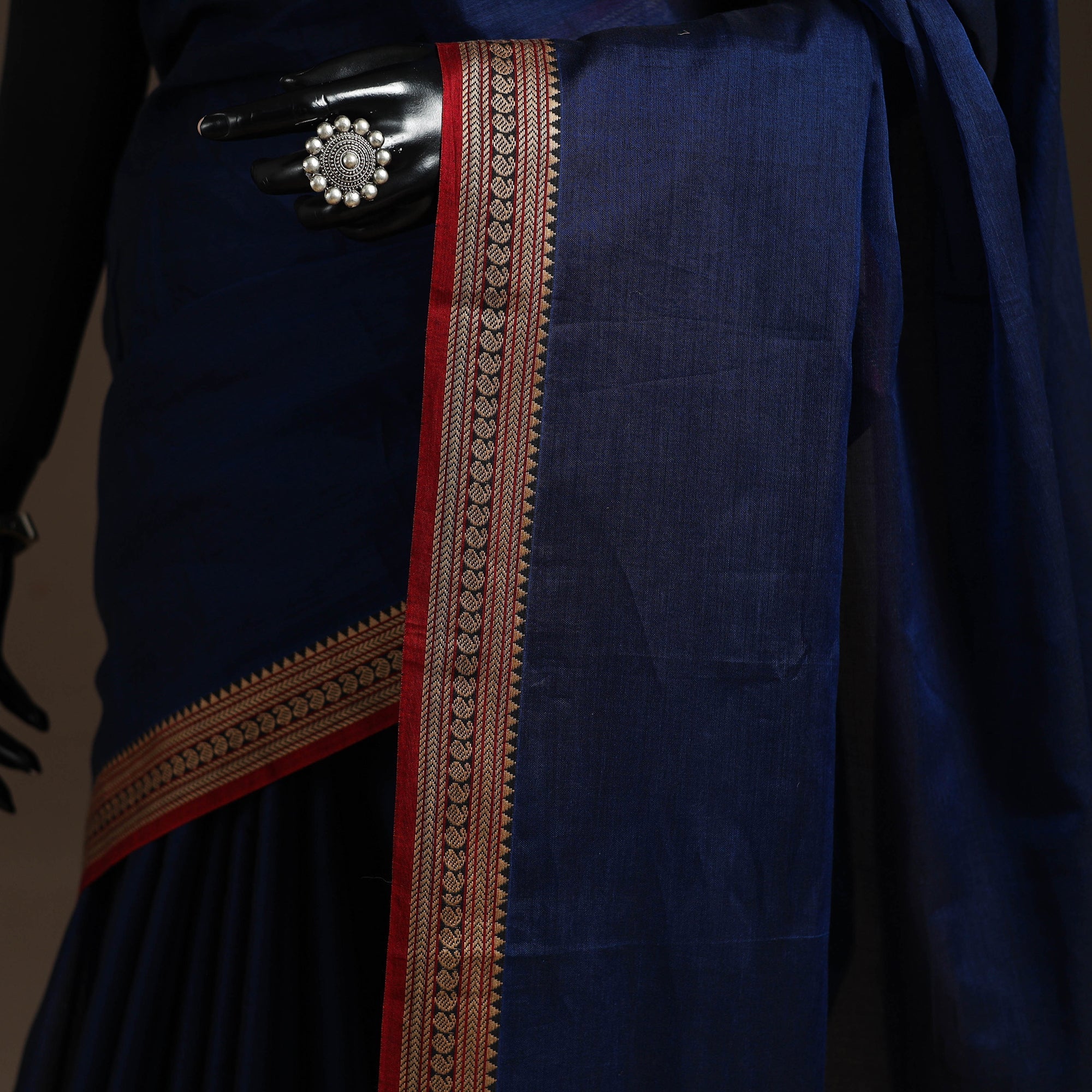 Blue dharwad cotton saree from Karnataka is woven using a traditional method known for its firm texture and intricate border work. The border features fine motifs and patterns that reflect the region’s style. These simple yet graceful details make the saree perfect for both formal occasions and festive celebrations.