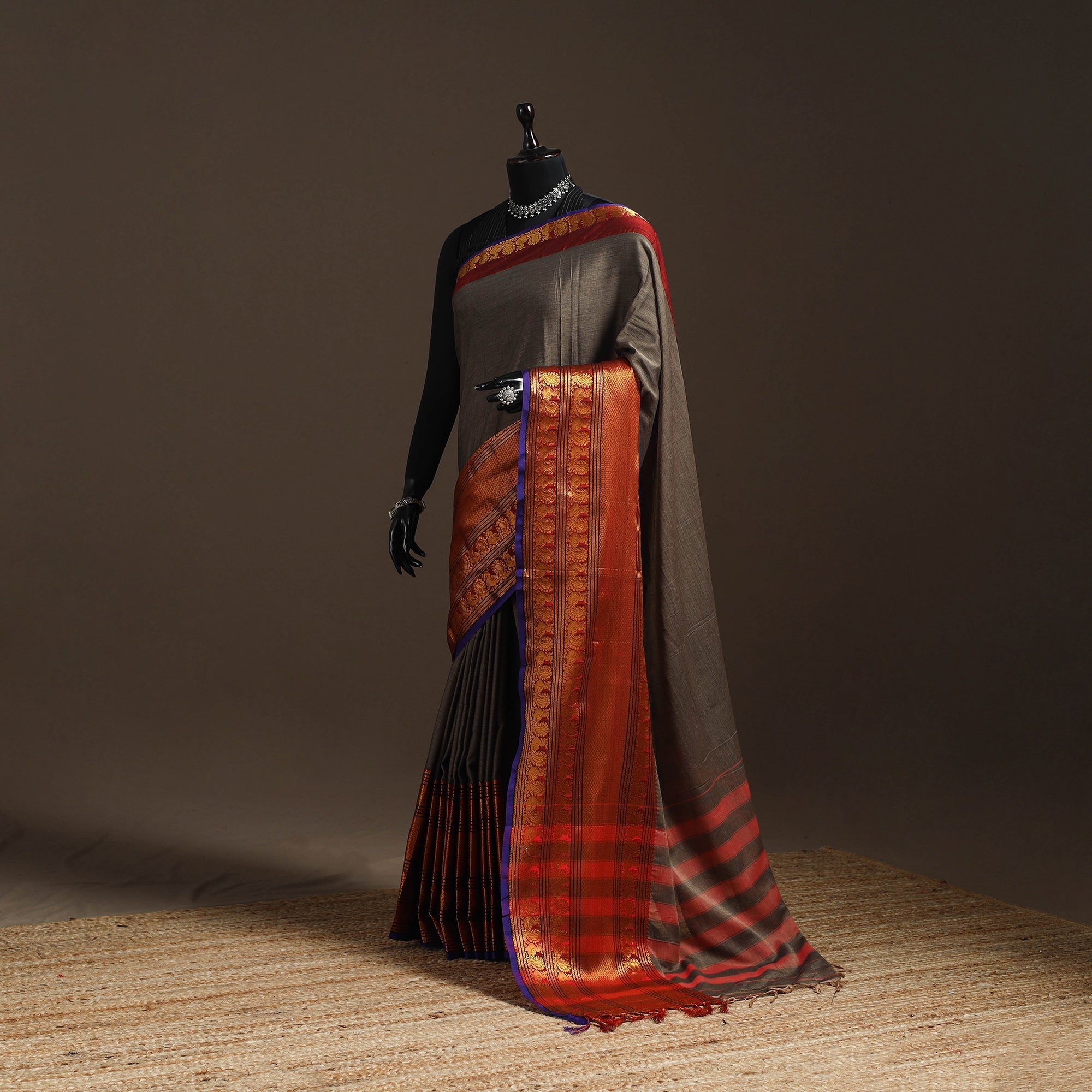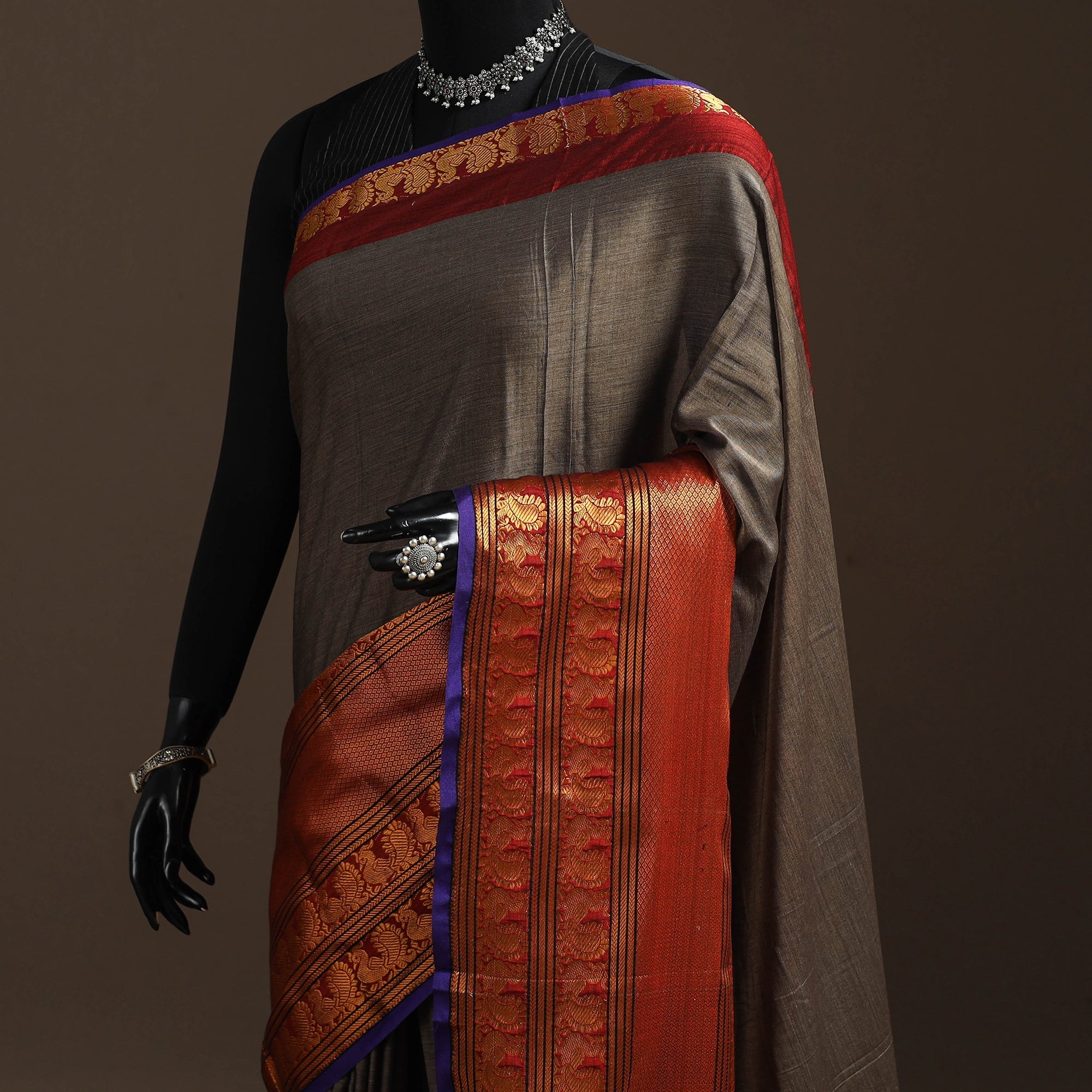 Brown dharwad cotton saree from Karnataka is woven using a traditional method known for its firm texture and intricate border work. The border features fine motifs and patterns that reflect the region’s style. These simple yet graceful details make the saree perfect for both formal occasions and festive celebrations.