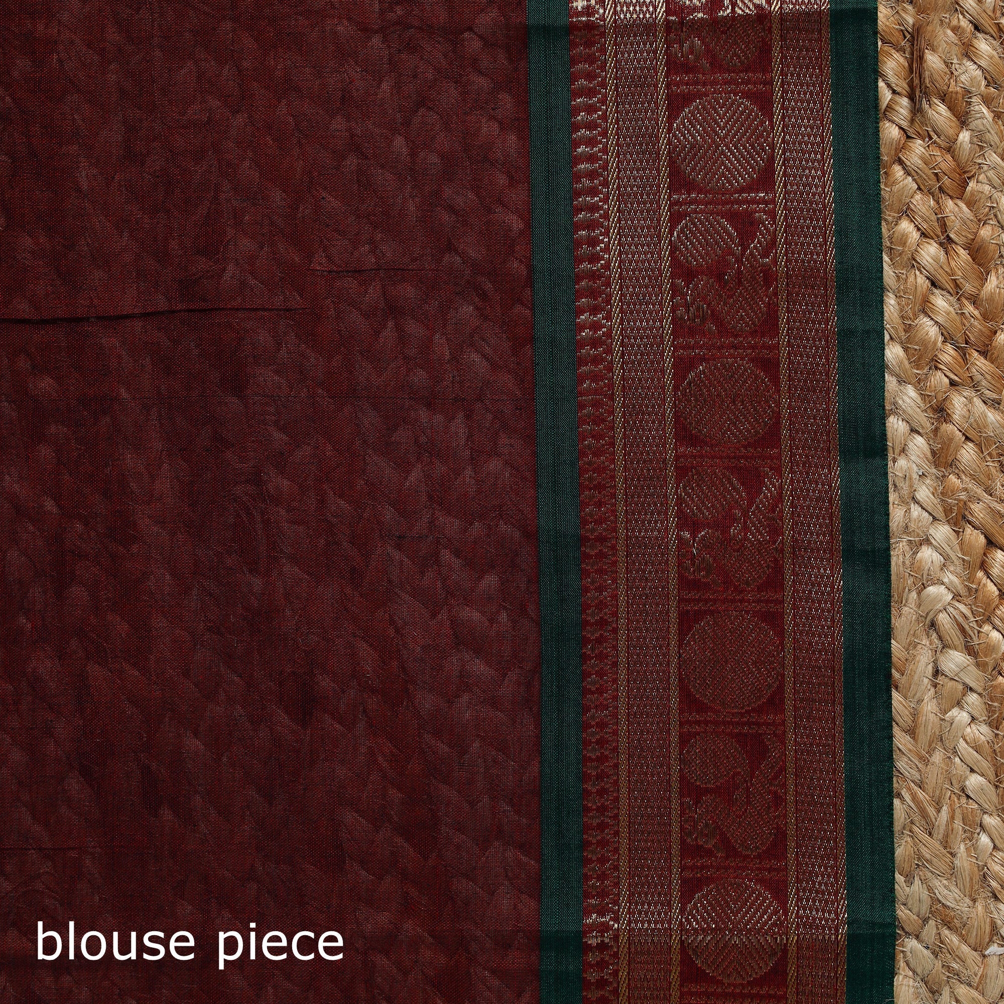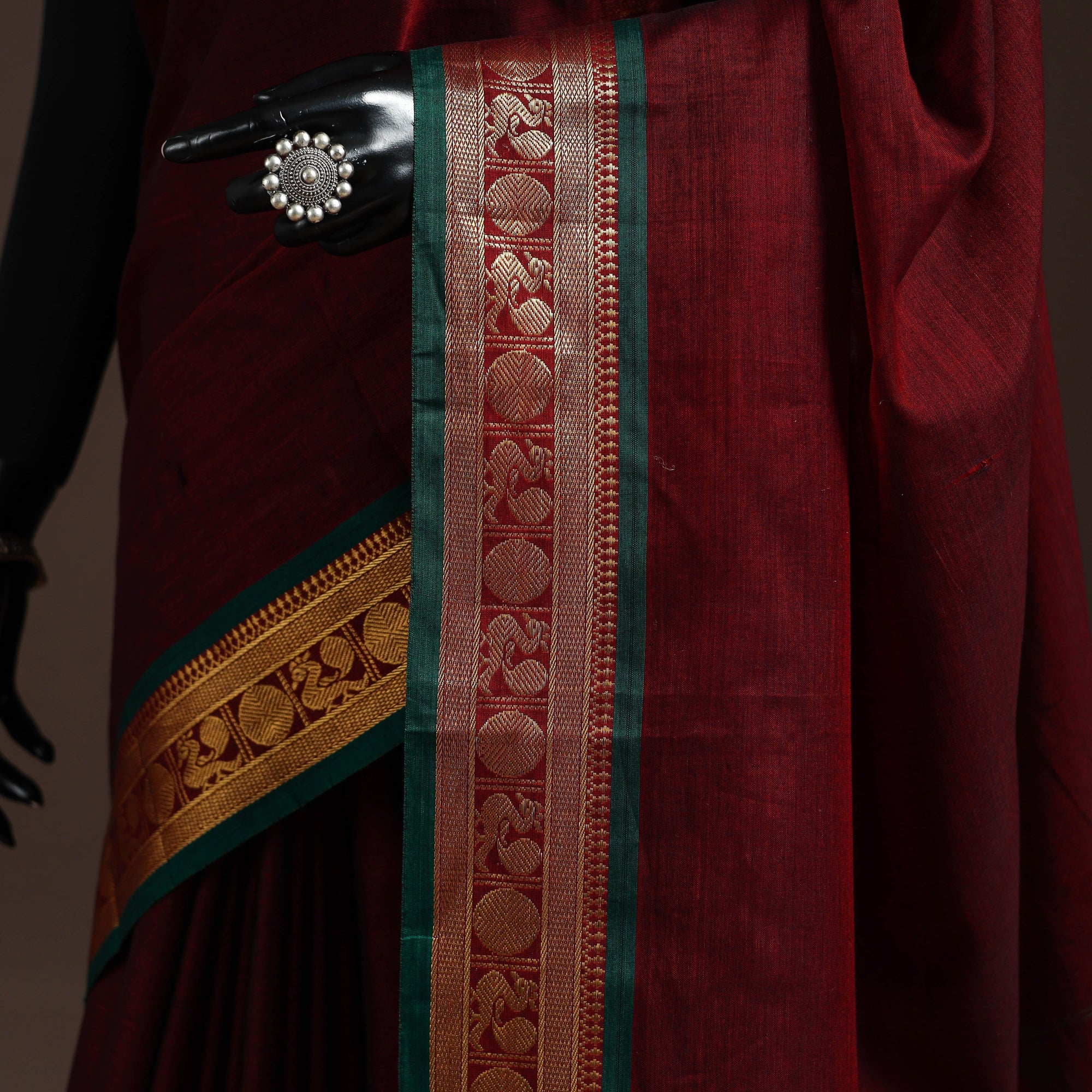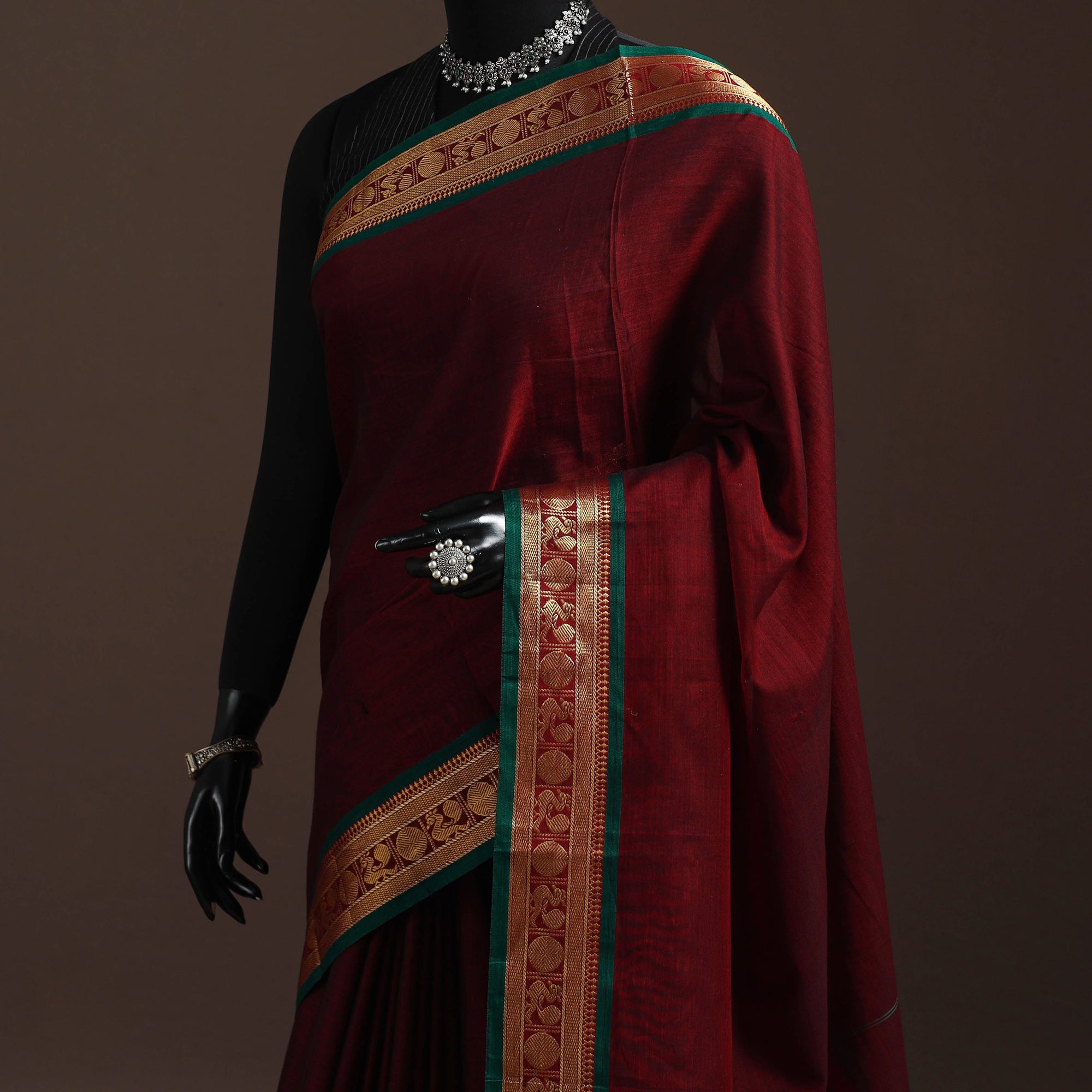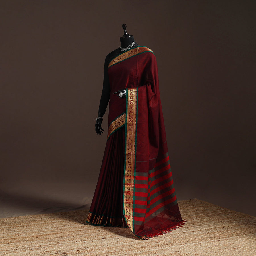 Maroon dharwad cotton saree from Karnataka is woven using a traditional method known for its firm texture and intricate border work. The border features fine motifs and patterns that reflect the region’s style. These simple yet graceful details make the saree perfect for both formal occasions and festive celebrations.