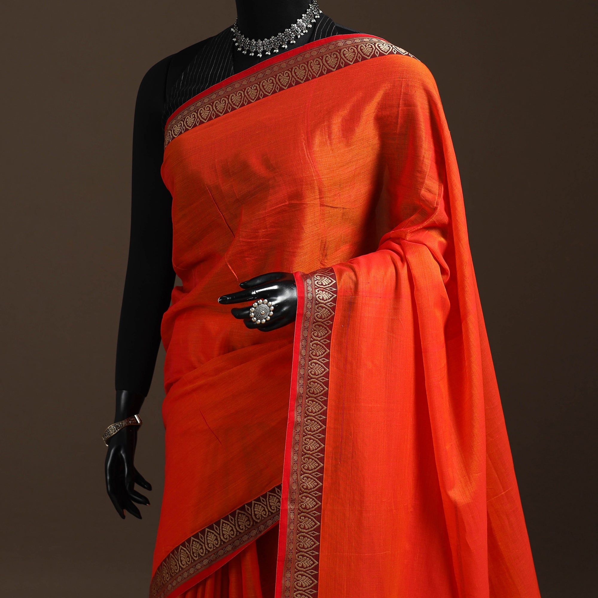 Dharwad cotton saree from Karnataka is woven using a traditional method known for its firm texture and intricate border work. The border features fine motifs and patterns that reflect the region’s style. These simple yet graceful details make the saree perfect for both formal occasions and festive celebrations.