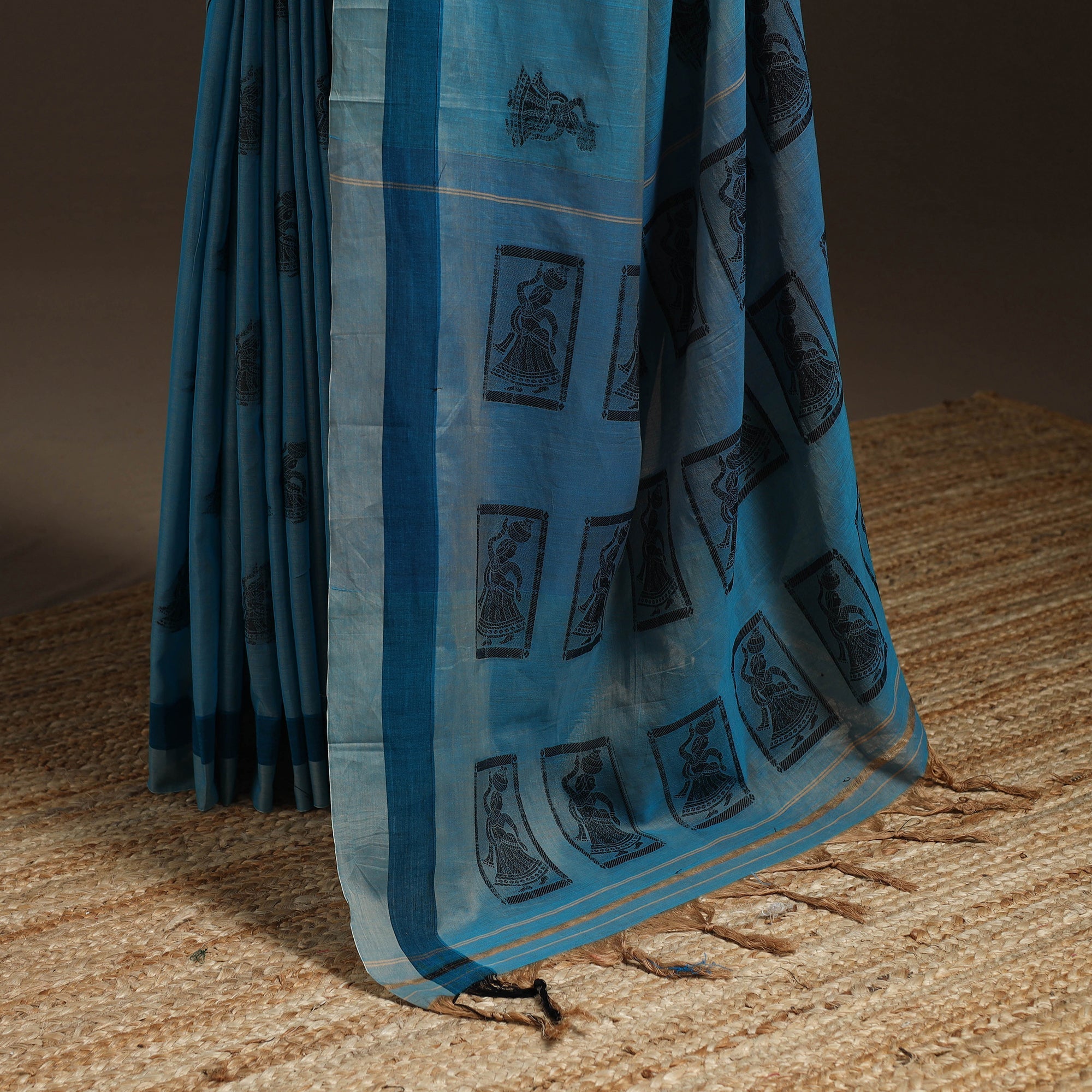 Blue dharwad cotton saree from Karnataka is woven using a traditional method known for its firm texture. The saree features fine thread buta work, where small motifs are woven directly into the fabric using extra threads. These simple yet graceful details make the saree perfect for both formal occasions and festive celebrations.