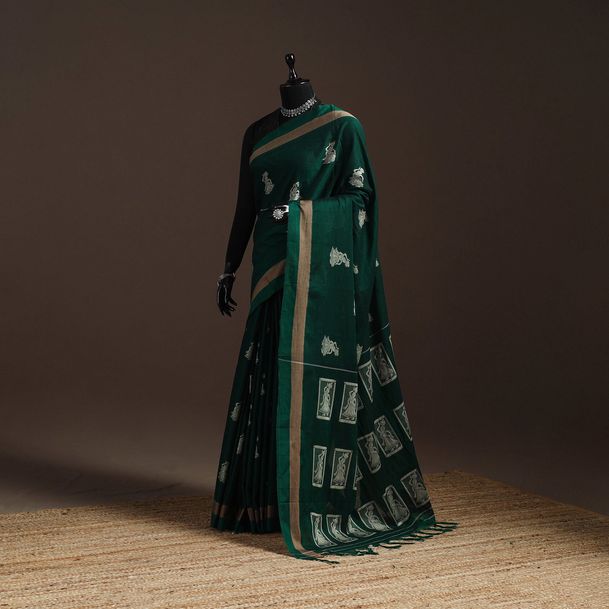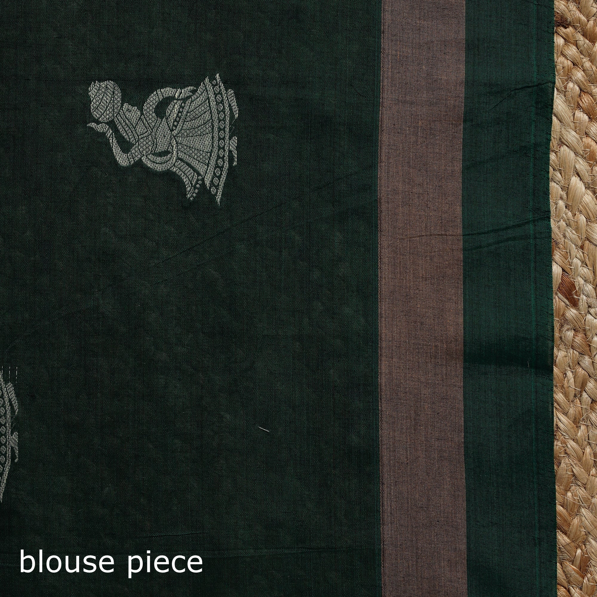 Green dharwad cotton saree from Karnataka is woven using a traditional method known for its firm texture. The saree features fine thread buta work, where small motifs are woven directly into the fabric using extra threads. These simple yet graceful details make the saree perfect for both formal occasions and festive celebrations.