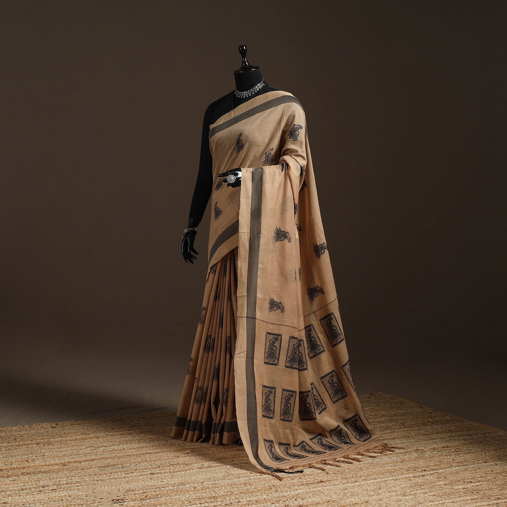 Beige dharwad cotton saree from Karnataka is woven using a traditional method known for its firm texture. The saree features fine thread buta work, where small motifs are woven directly into the fabric using extra threads. These simple yet graceful details make the saree perfect for both formal occasions and festive celebrations.