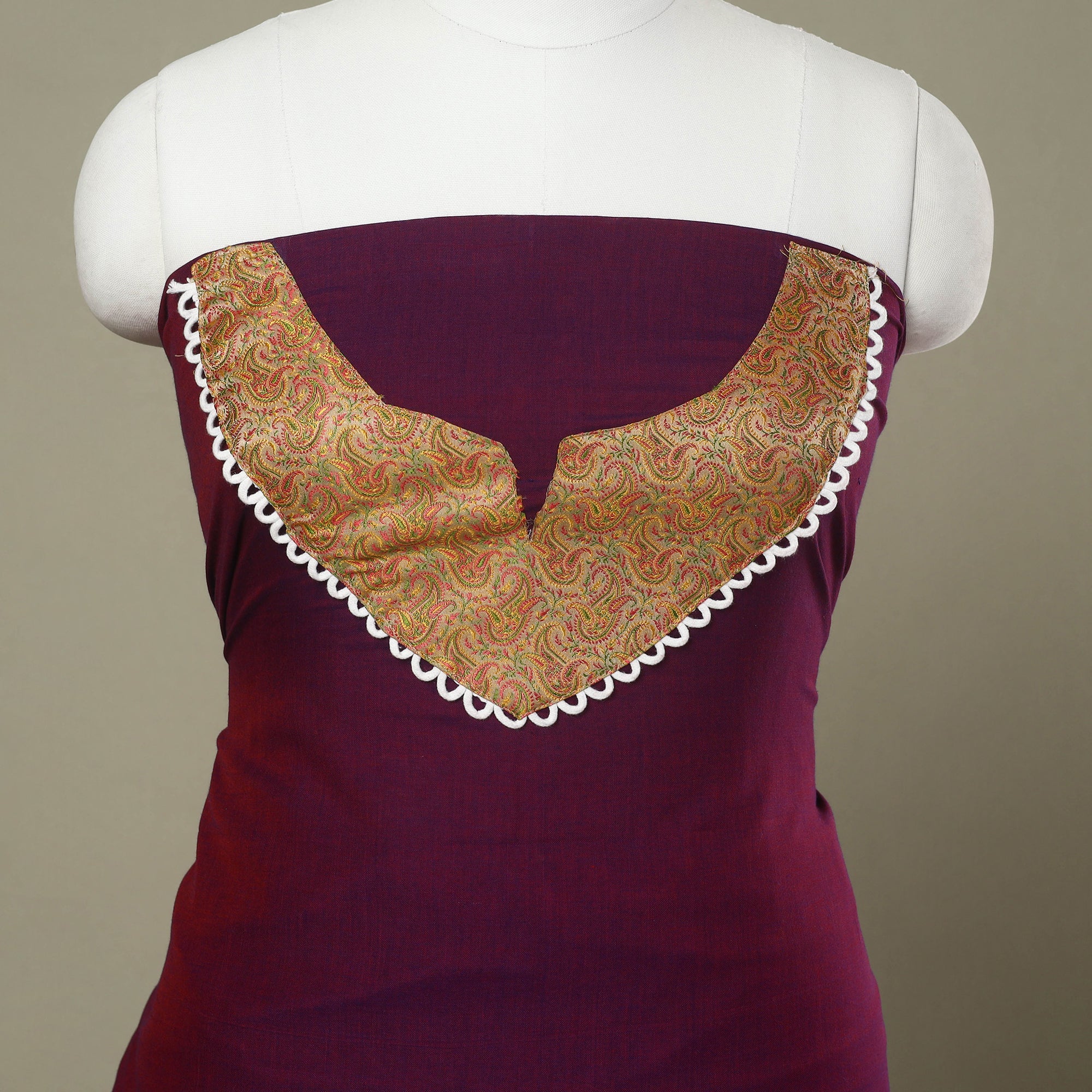 Add cultural charm to your wardrobe with this purple dharwad patchwork cotton kurta material. Crafted from soft, breathable cotton, it features intricate patchwork designs that reflect the rich textile heritage of Dharwad. Perfect for creating custom kurtas, this fabric combines comfort with tradition, making it ideal for daily wear or special occasions.
