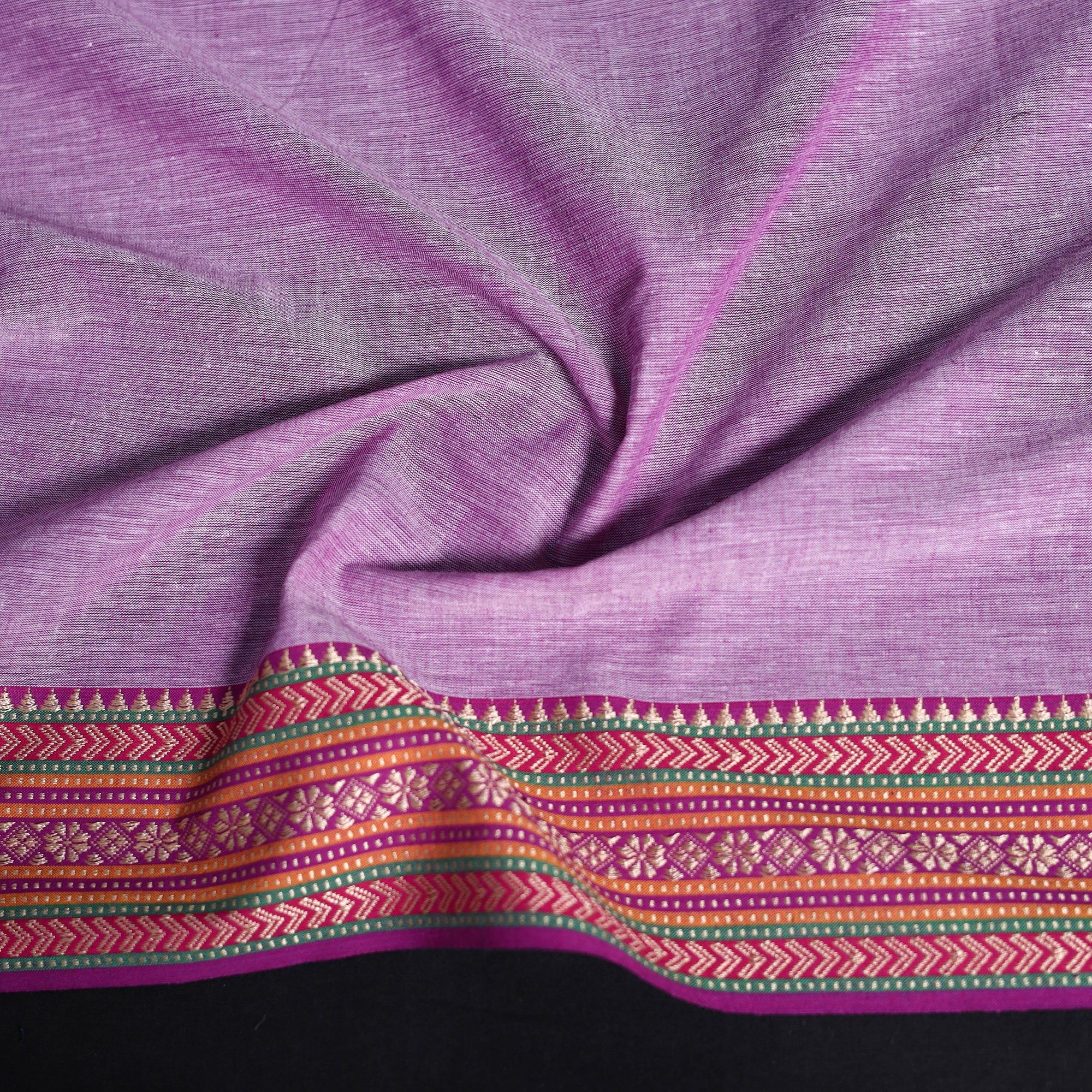 Purple dharwad cotton blouse piece from Karnataka. This piece is a tribute to the region’s rich textile heritage, featuring traditional woven border work that adds a touch of sophistication. Perfect to tailor in your own style, it’s a beautiful choice for festive occasions as well as everyday saree looks.