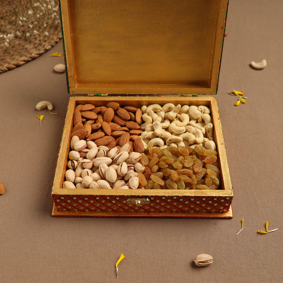 Celebrate traditional artistry with this diwali decor yellow handpainted wooden dry fruit box, perfect for festive occasions. Skillfully crafted by artisans from Gwalior, made from durable wood and painted using acrylic colors. adorned with sparkling kundans and mirrors. Enhance your home decor, it serves as a decorative box for dry fruits.