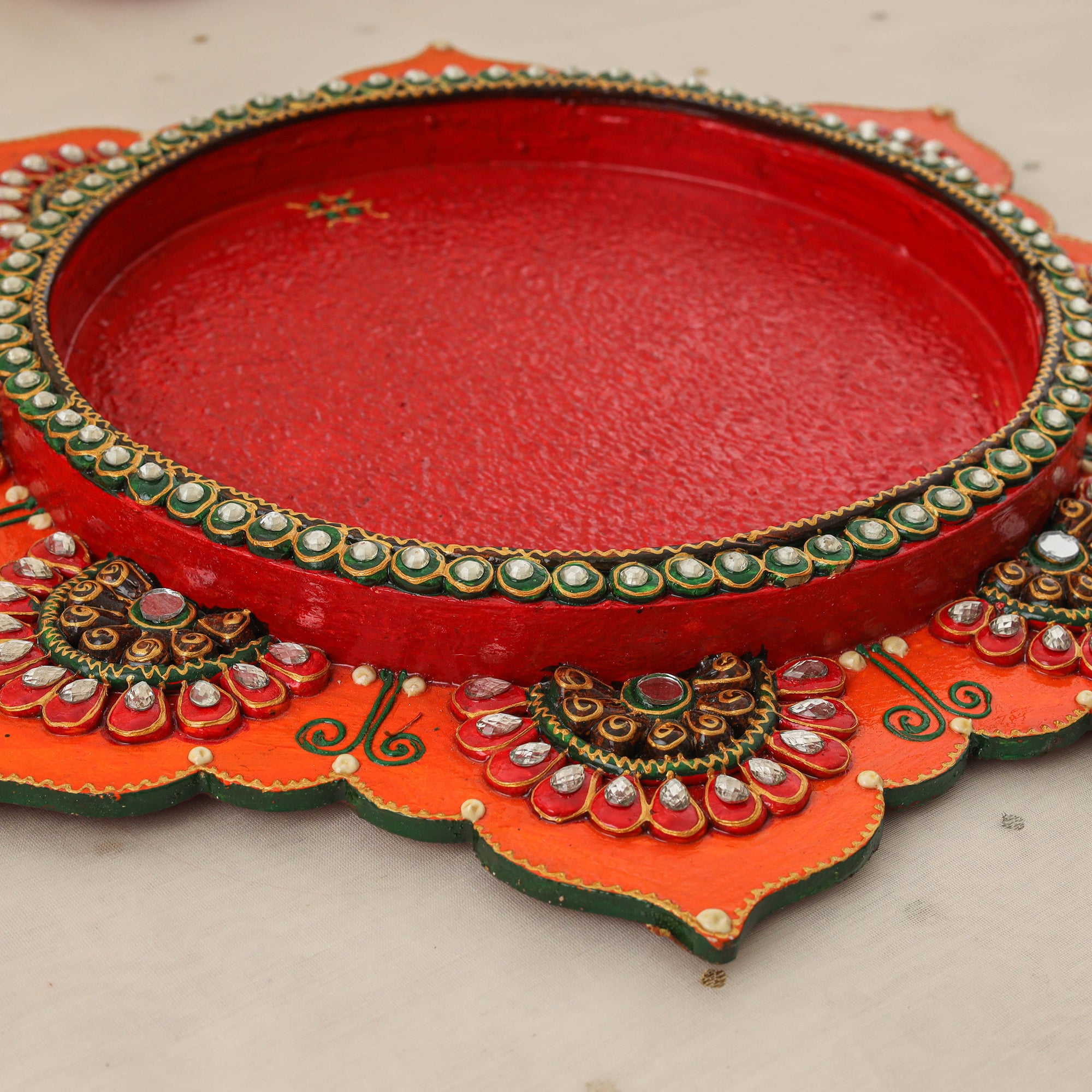 Celebrate traditional artistry with this Diwali décor hand-painted lotus pooja thali, perfect for festive rituals. Skillfully crafted by artisans, the set includes a beautifully crafted wooden thali and 2 clay bowls, decorated with acrylic colors and embellished with sparkling kundan stones. Enhance your pooja space with this elegant and durable thali set that brings charm to every celebration.