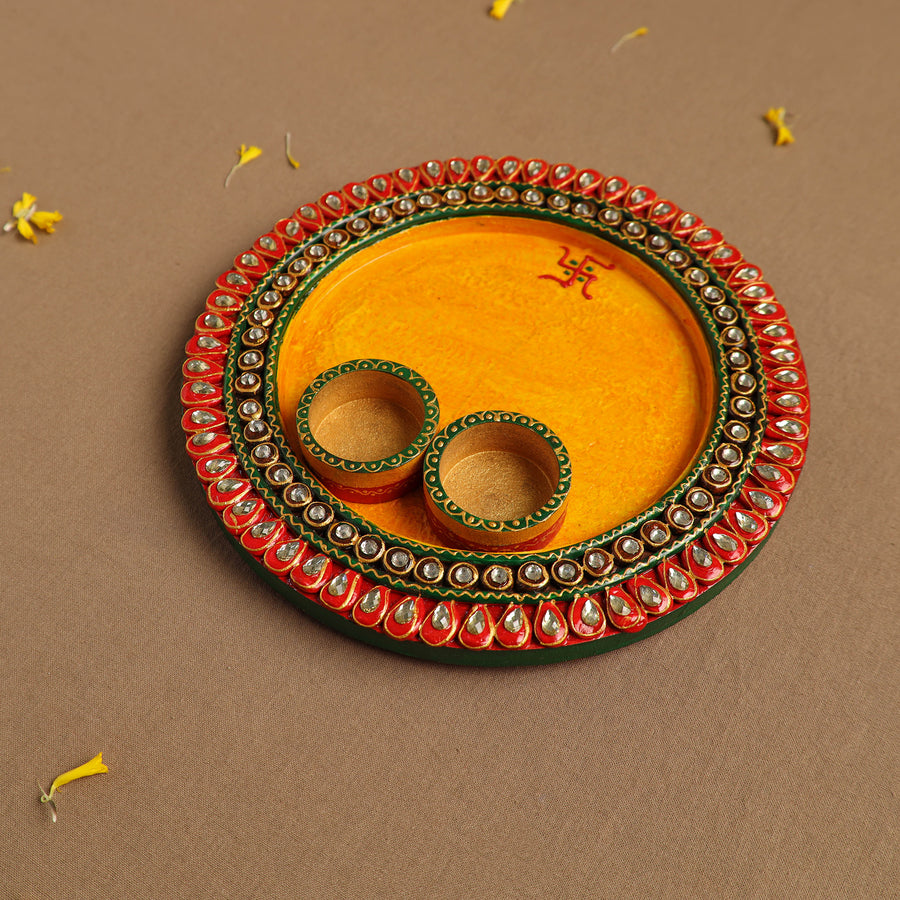 Enhance your worship rituals with this diwali decor handpainted wooden pooja thali with bowls, skillfully made by artisans from Gwalior. Handpainted with intricate acrylic colors and adorned with sparkling kundans, this pooja thali brings a festive touch to your rituals. Perfect for daily use or special occasions like Diwali, it reflects the cultural richness of Indian traditions.