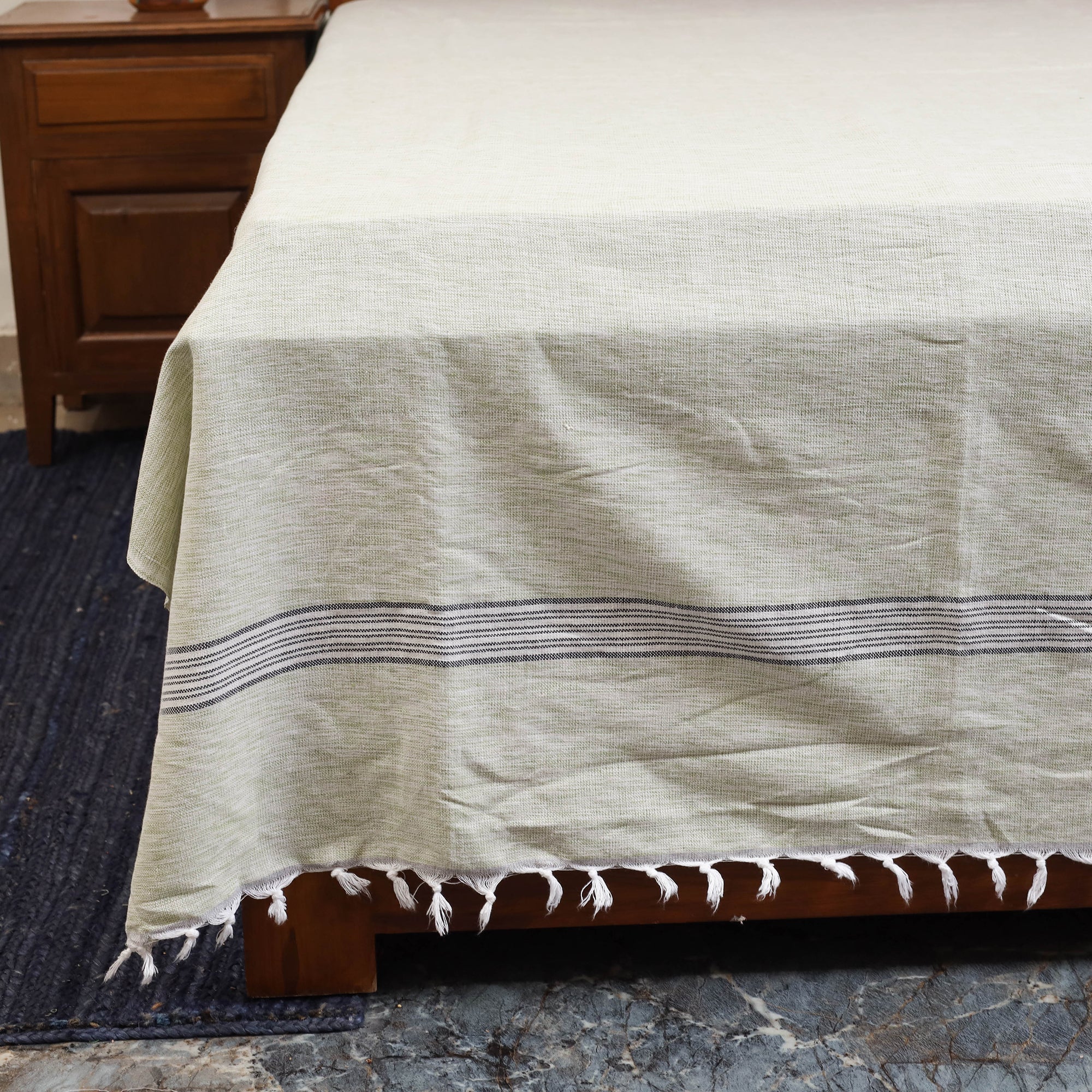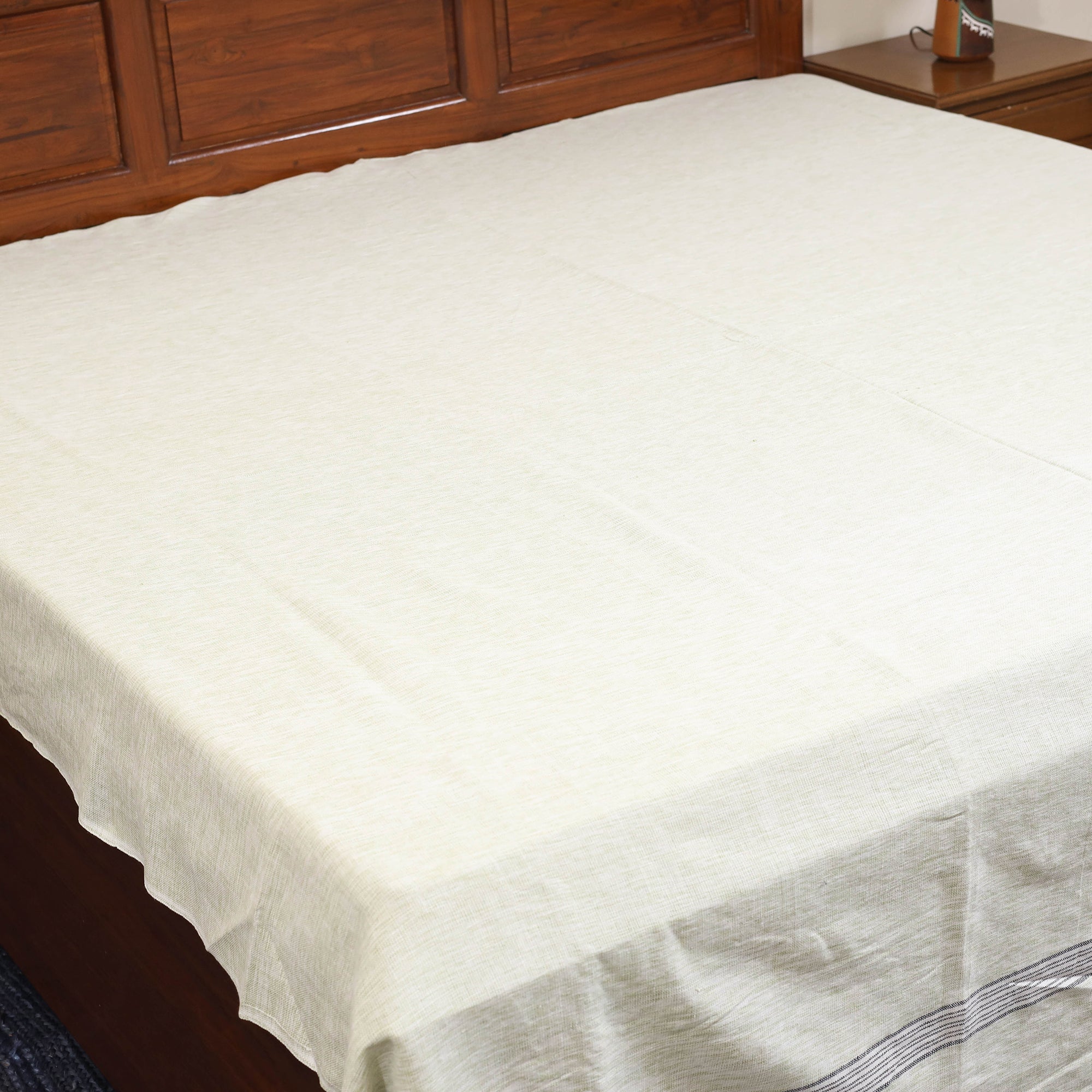 | Material | This beautifully woven green handloom bed sheet blends comfort with charm for your bedroom. Crafted from pure cotton, it ensures lasting durability and a gentle texture for restful sleep. The handloom weaving process gives each piece a unique character, reflecting the timeless traditions of skilled Indian artisans. |